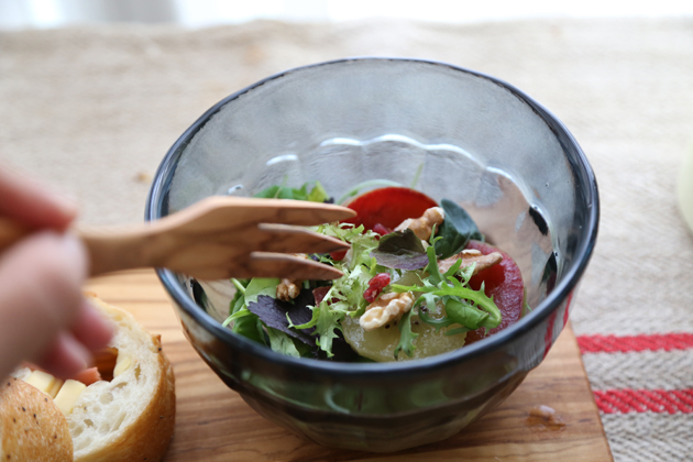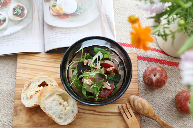 在橄欖木上簡單擺放麵包,搭配玻璃碗盛裝生菜沙拉
