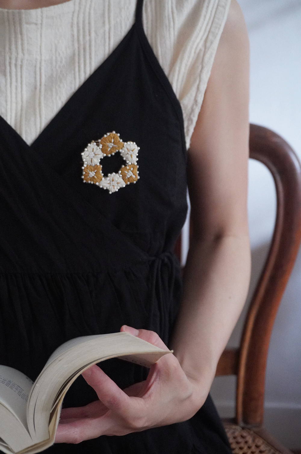 自由徒手繪製的四瓣花型,朵朵相連亦各自跳耀,以此輪廓,繡製出小得盈滿的自由圈圓。