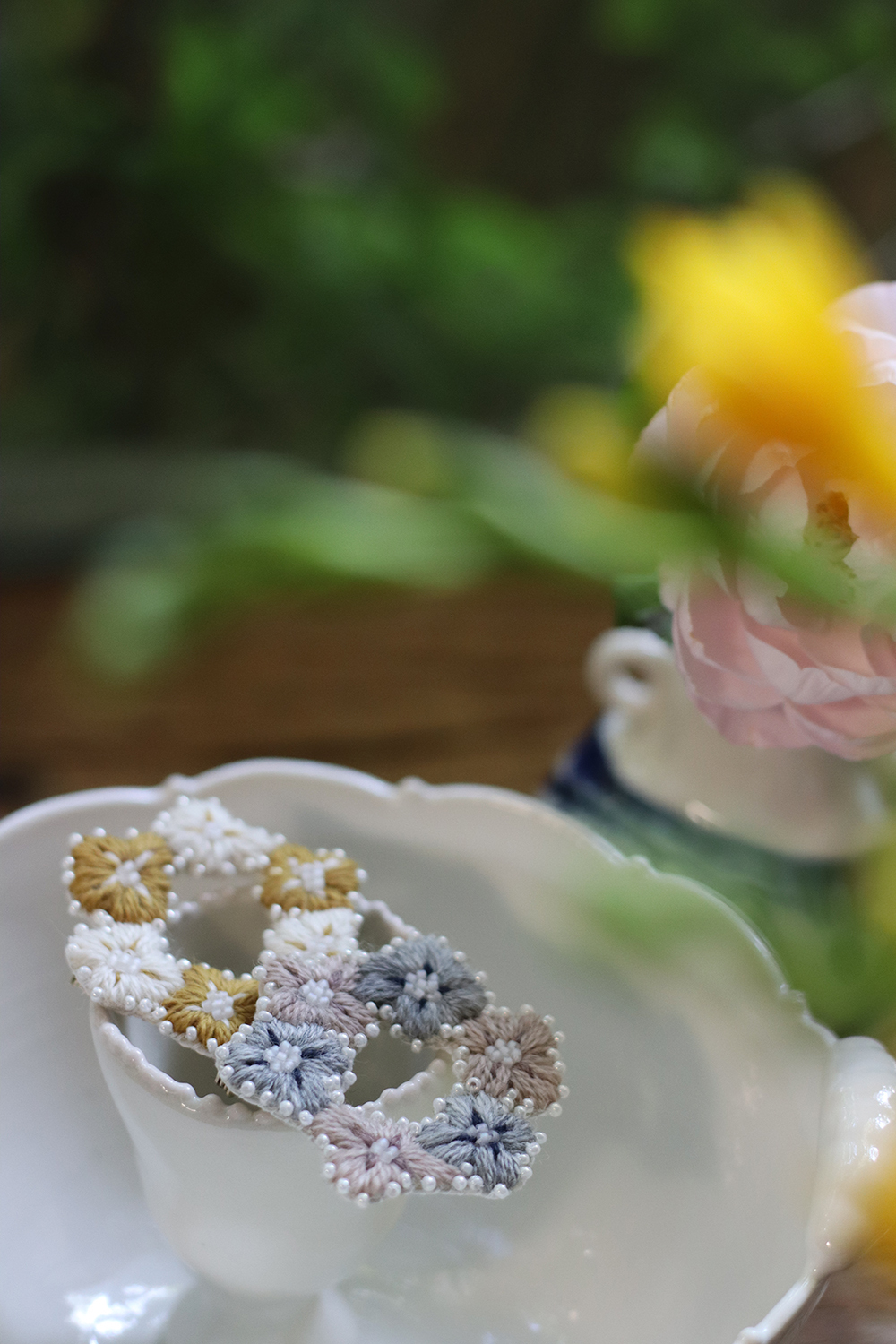 四瓣花型刻意保留溫柔的手繪感及不對稱型態,鑲邊珠繡於此作品亦特意保持顆顆不相連的靈動
