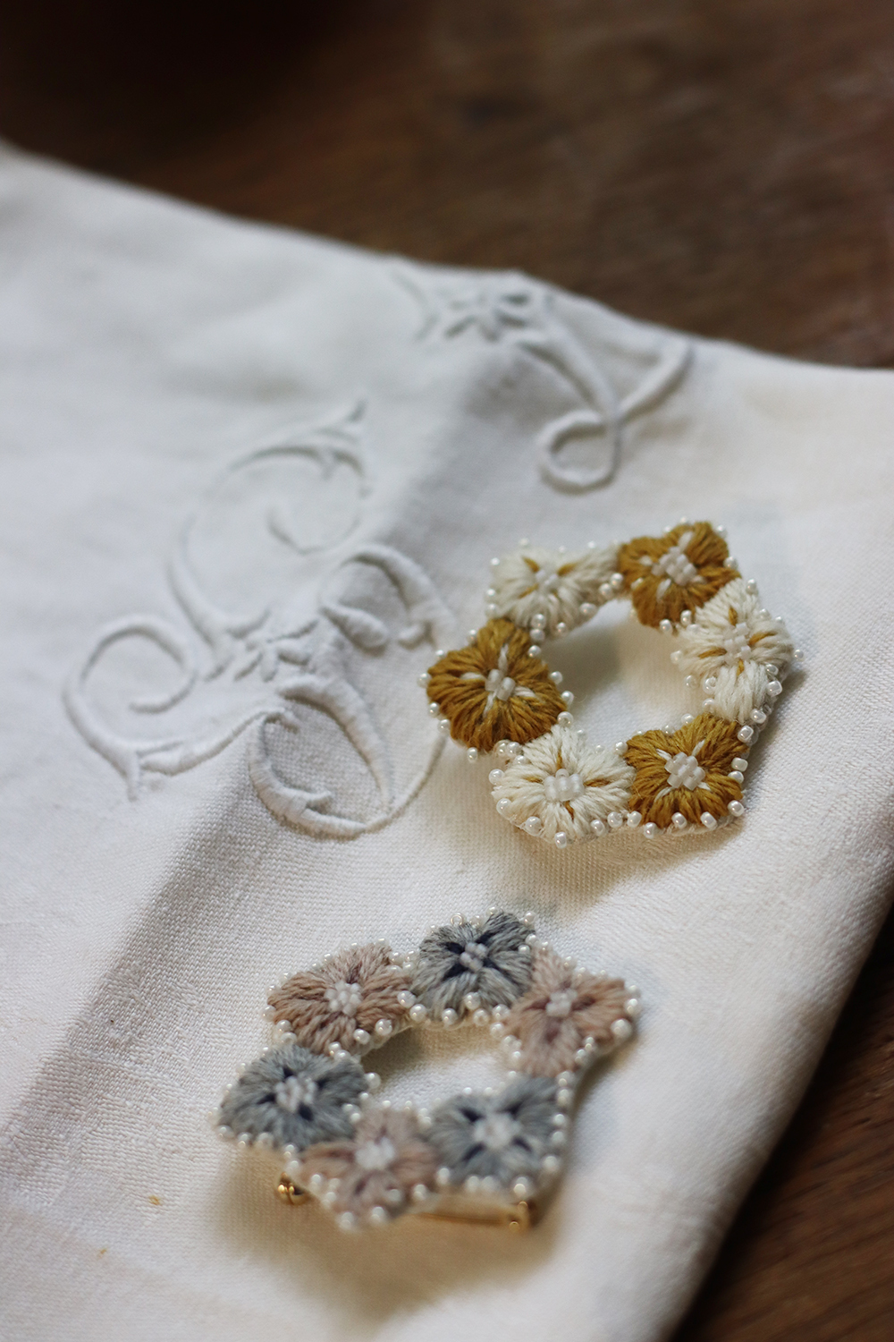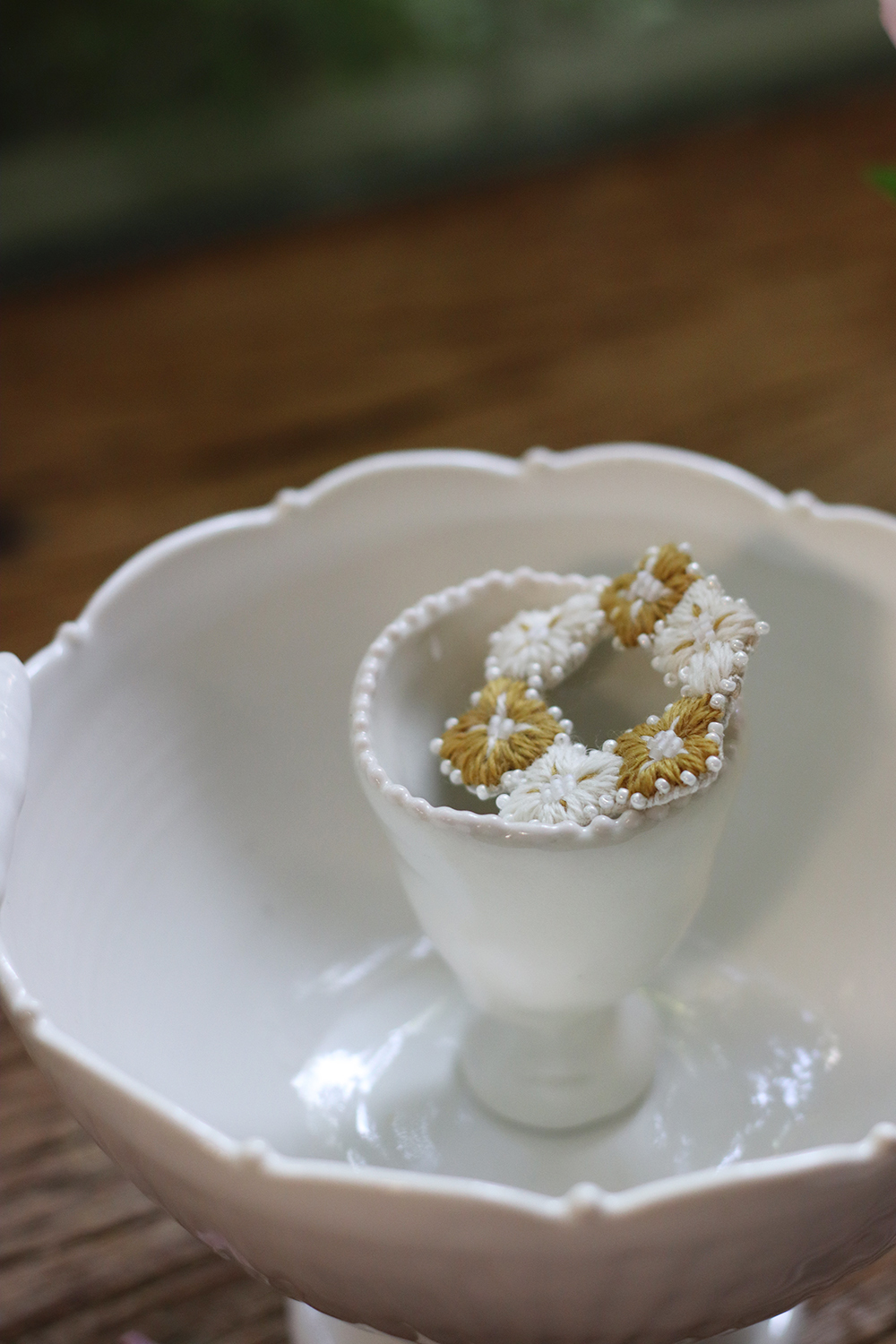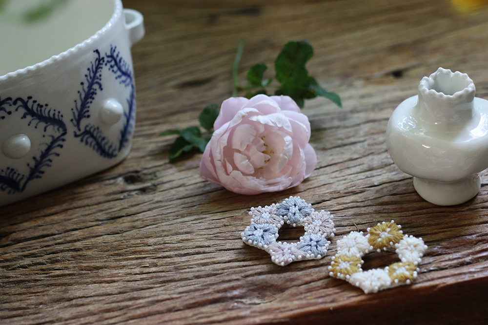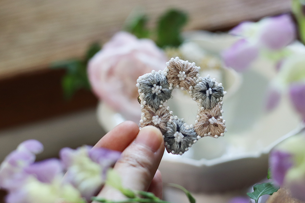 自由徒手繪製的四瓣花型,朵朵相連亦各自跳躍,以此輪廓,繡製出小得盈滿的自由圈圓。