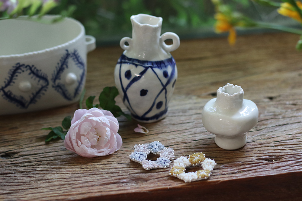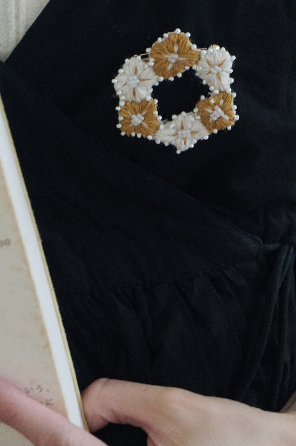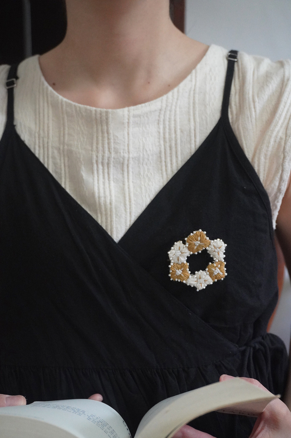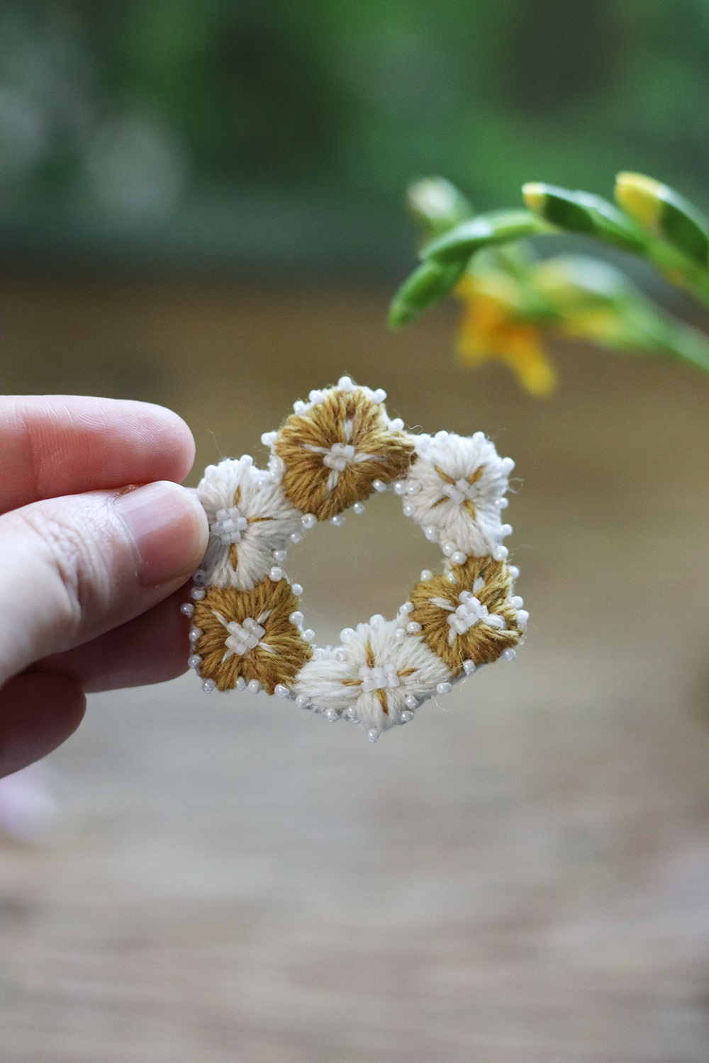 自由徒手繪製的四瓣花型,朵朵相連亦各自跳躍,以此輪廓,繡製出小得盈滿的自由圈圓。