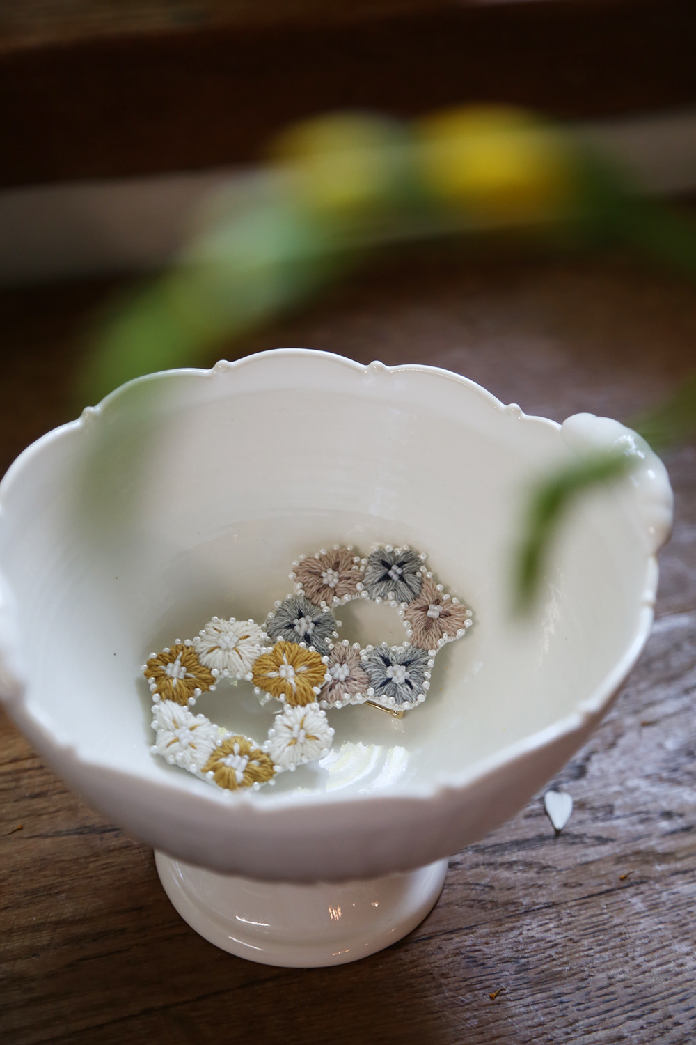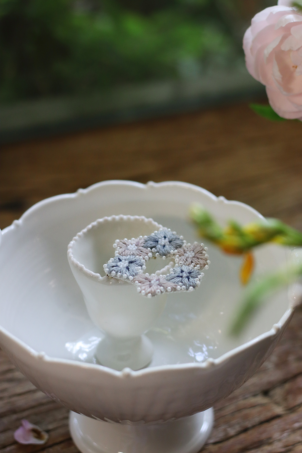四瓣花型刻意保留溫柔的手繪感及不對稱型態,鑲邊珠繡於此作品亦特意保持顆顆不相連的靈動