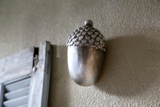 半立體式的銀色大橡實,可以自己直立在窗邊,背後更有洞,可以掛在鐵釘上,成了獨一無二的掛飾
