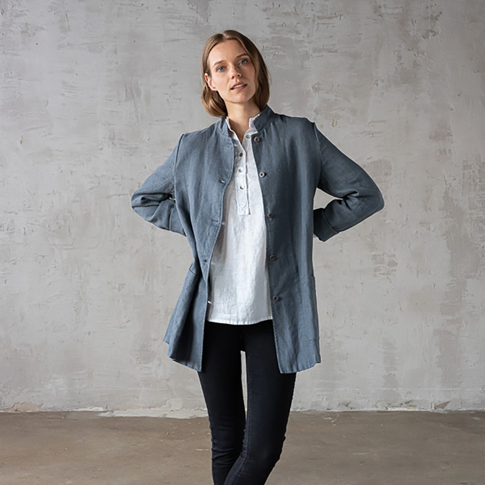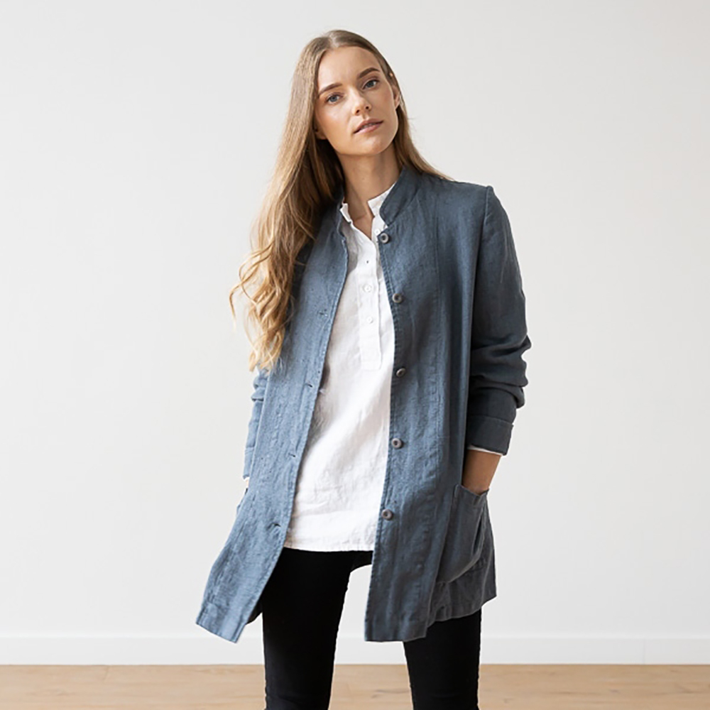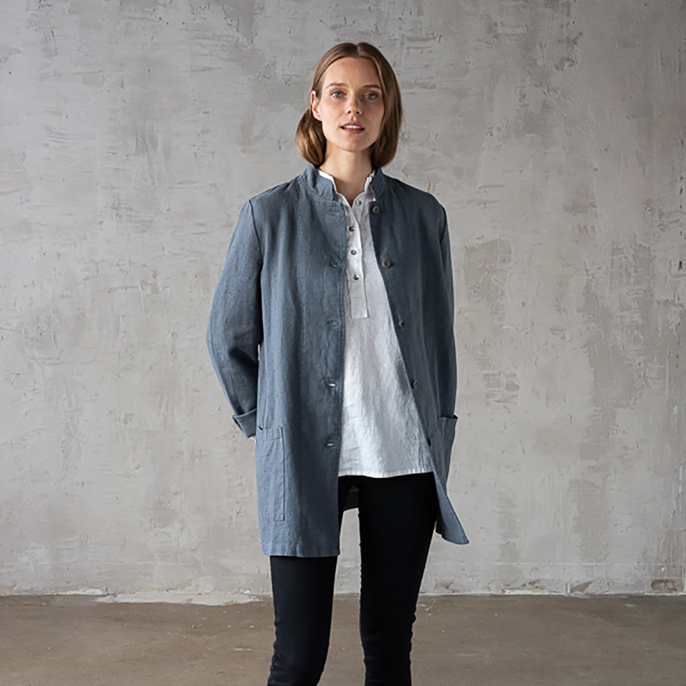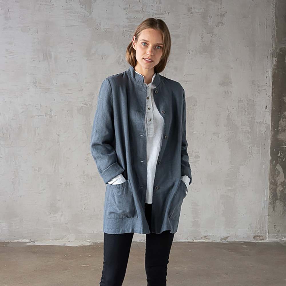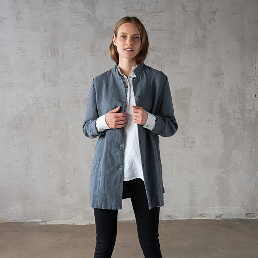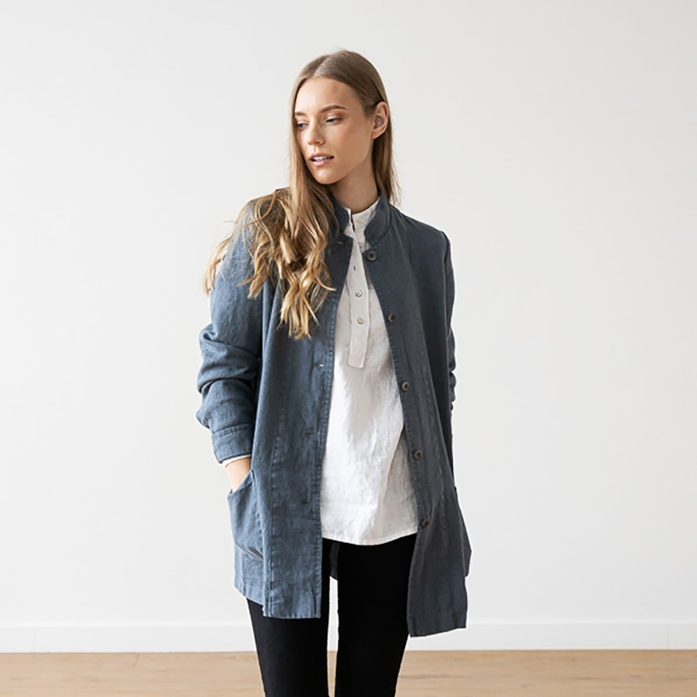 採用低胸立領設計,正面紐帶點綴,並配有兩個口袋