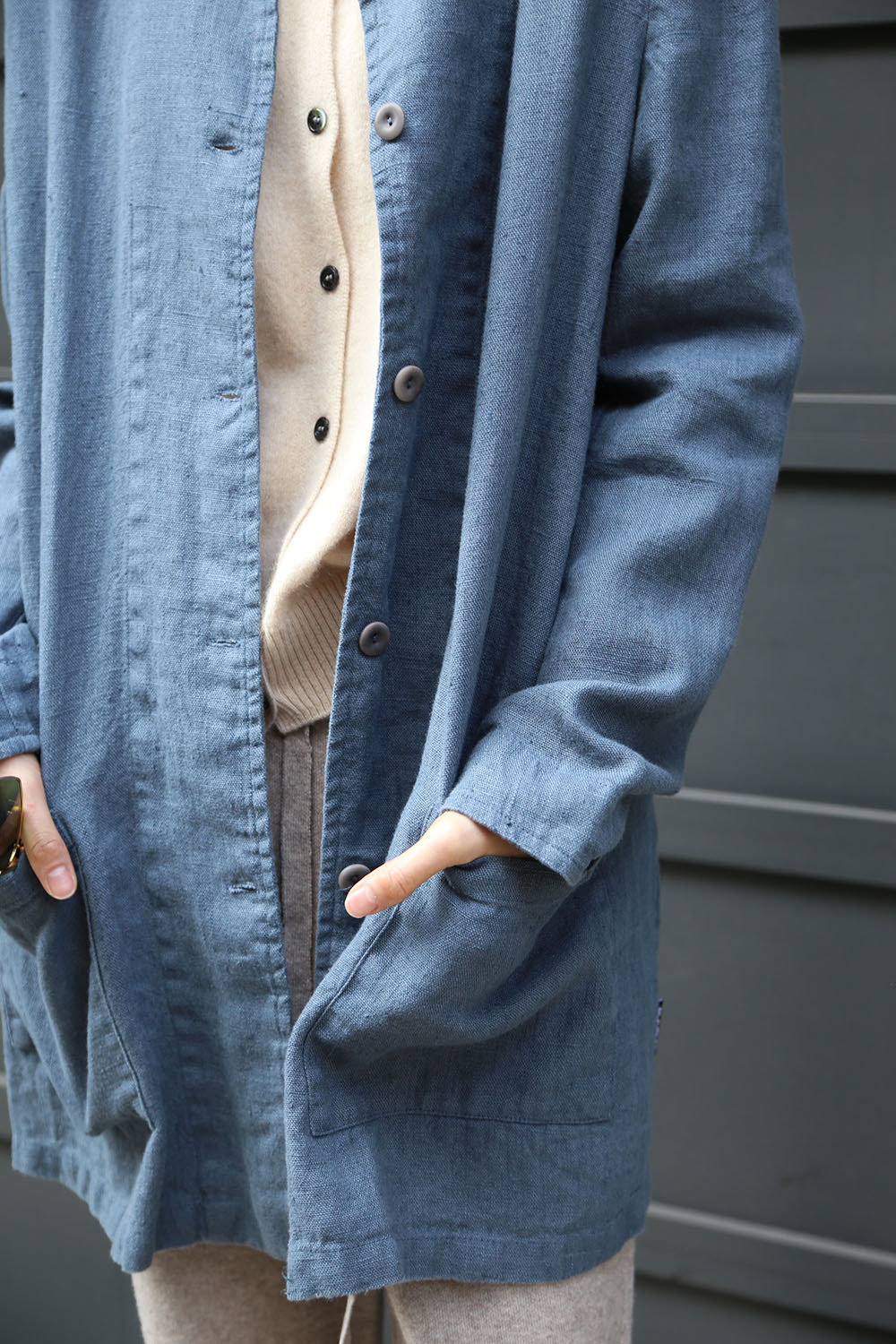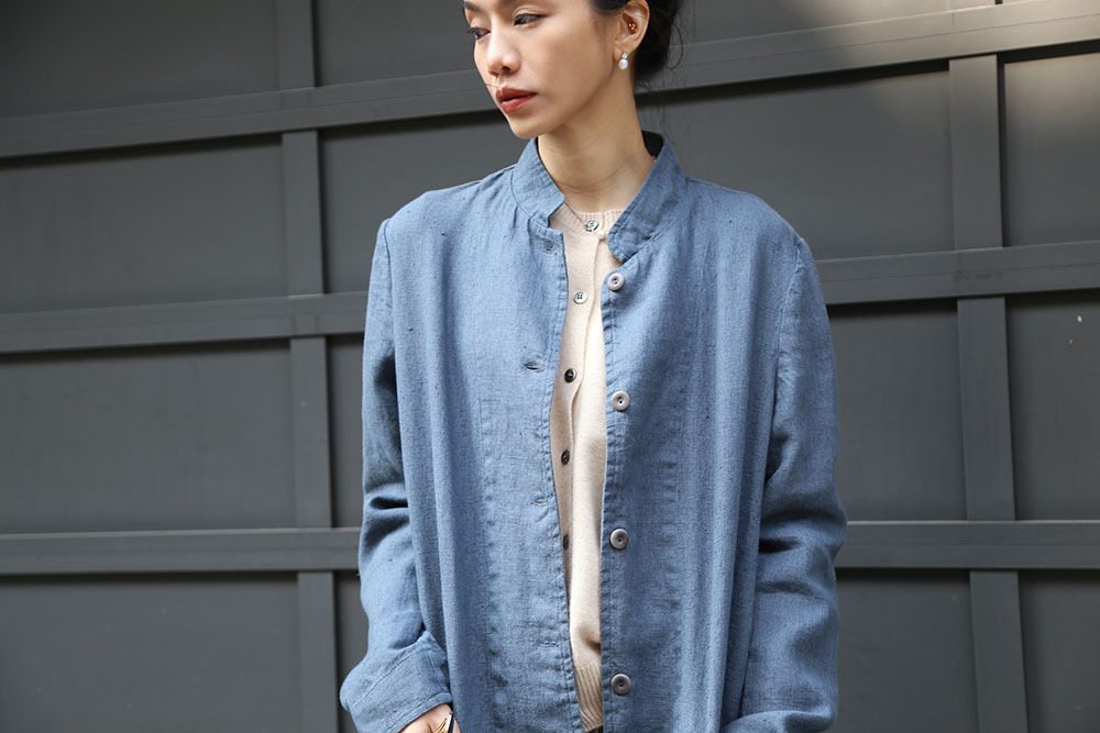 採用低胸立領設計,正面紐帶點綴,並配有兩個口袋