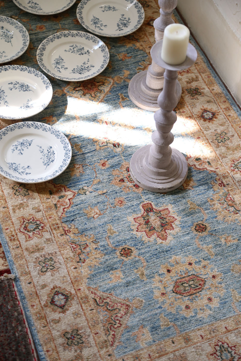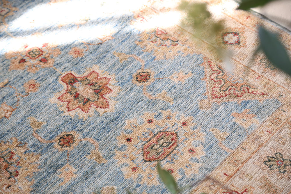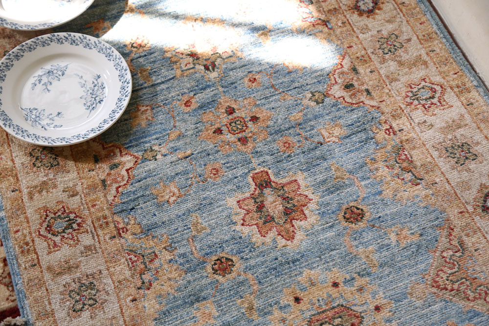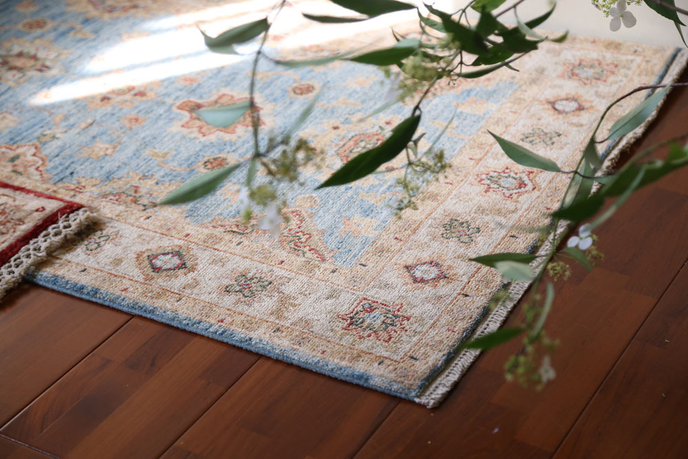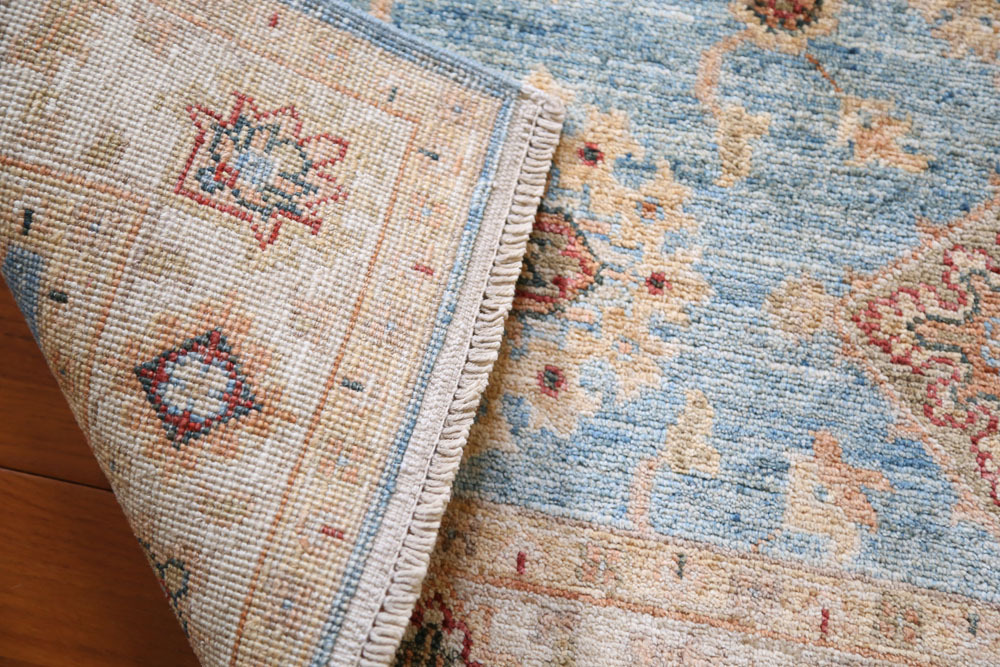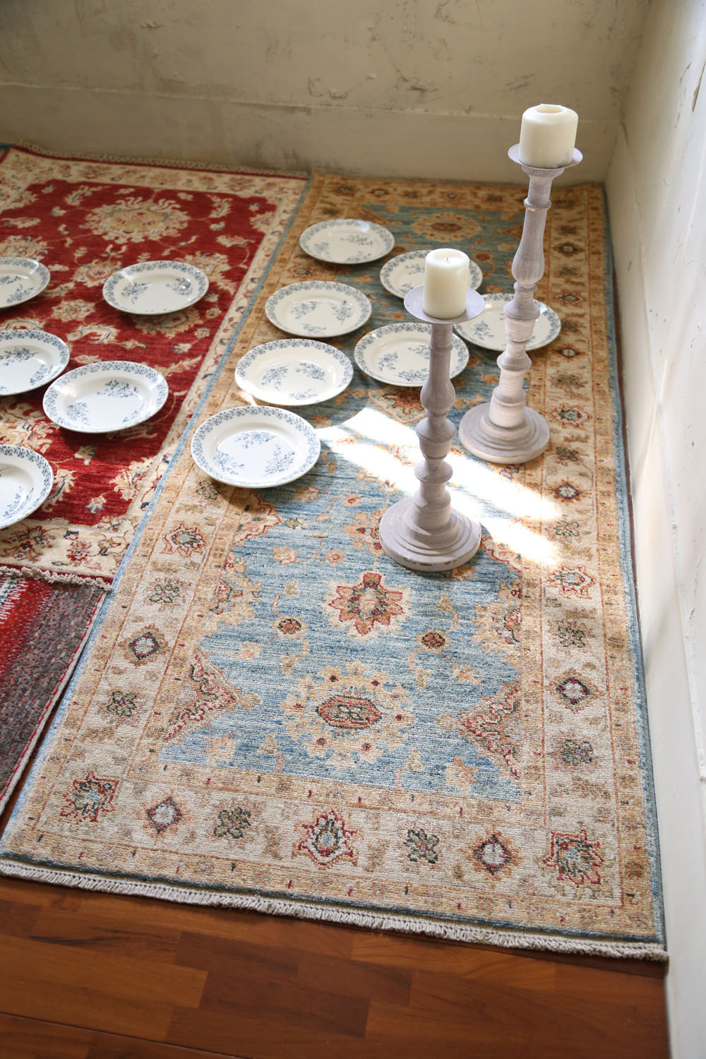 採用優質羊毛手工紡紗成線,在巴基斯坦手工打結。使用的處理方法產生了華麗的現代和老式銅綠,顏色柔和。