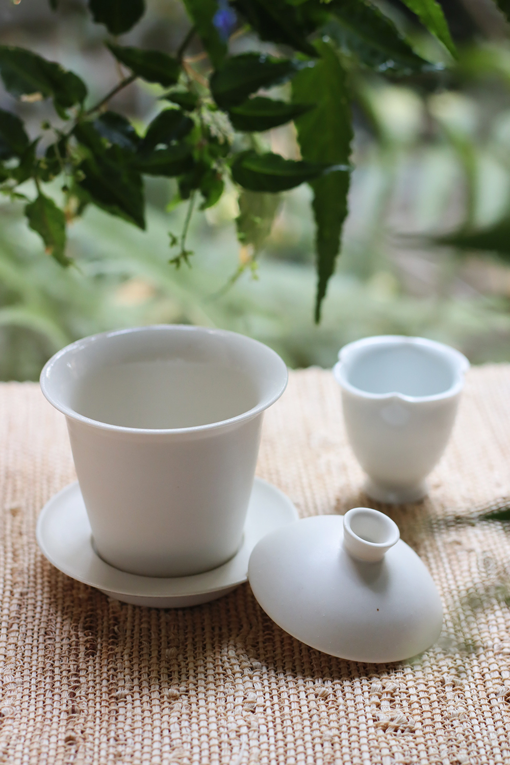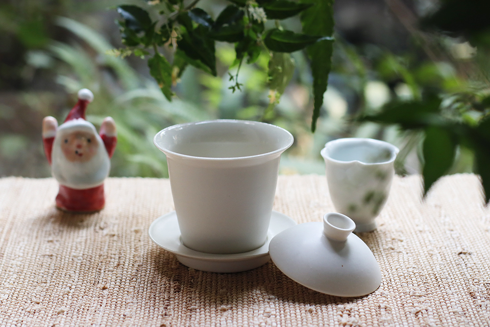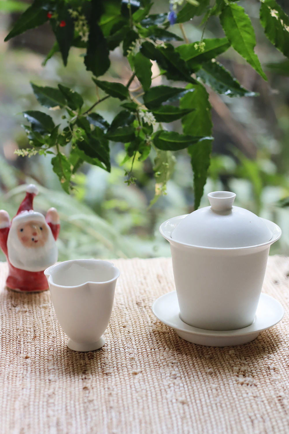 把喜歡的白郁民陶作家茶具、茶葉、布、放進手工的木箱子