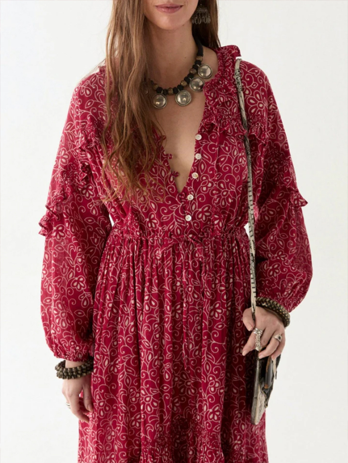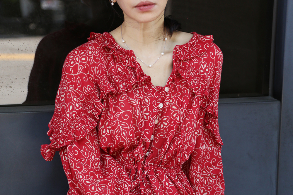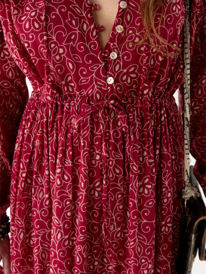 大膽的天竺葵紅色印花蔓延在輕盈的棉布上