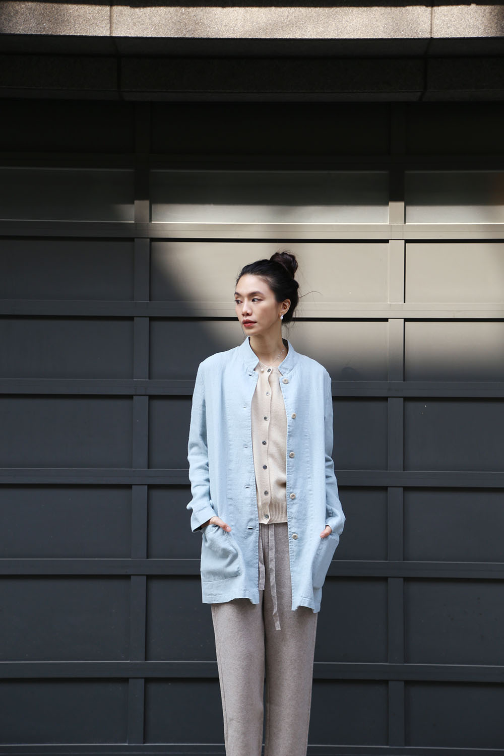 採用低胸立領設計,正面紐帶點綴,並配有兩個口袋
