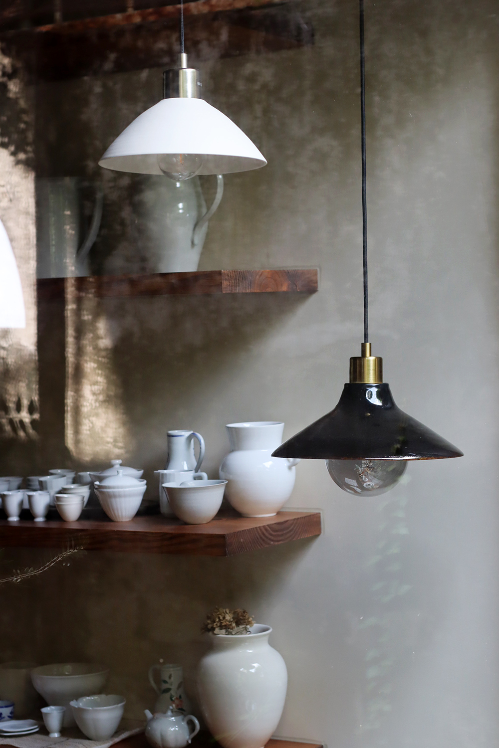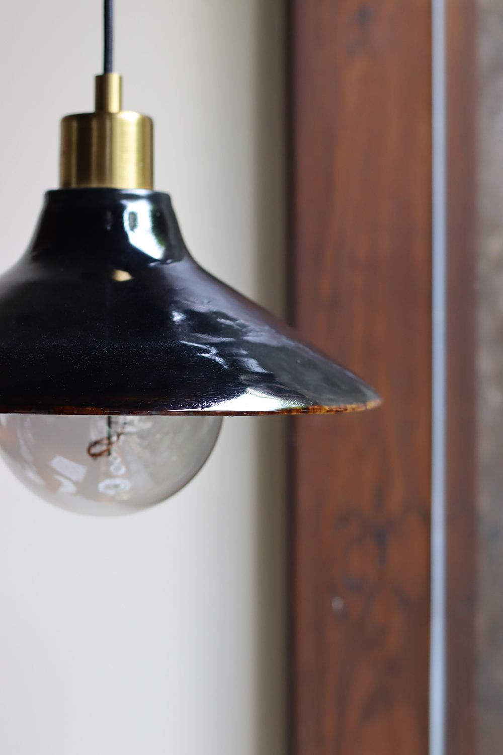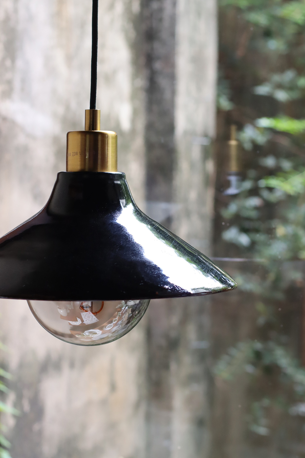 經過高溫燒窯,以黑釉燒製的陶燈,釉色猶如黑曜石