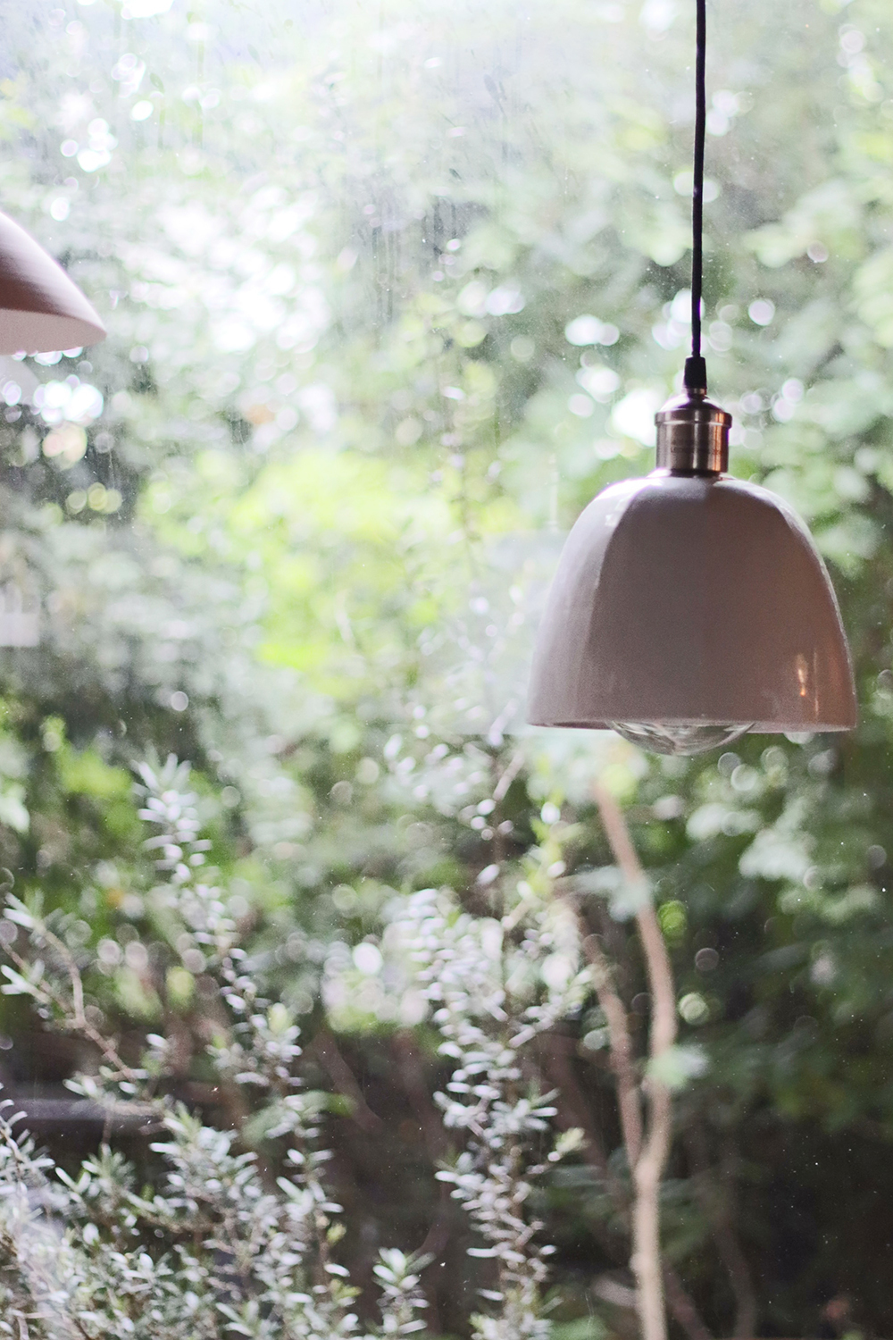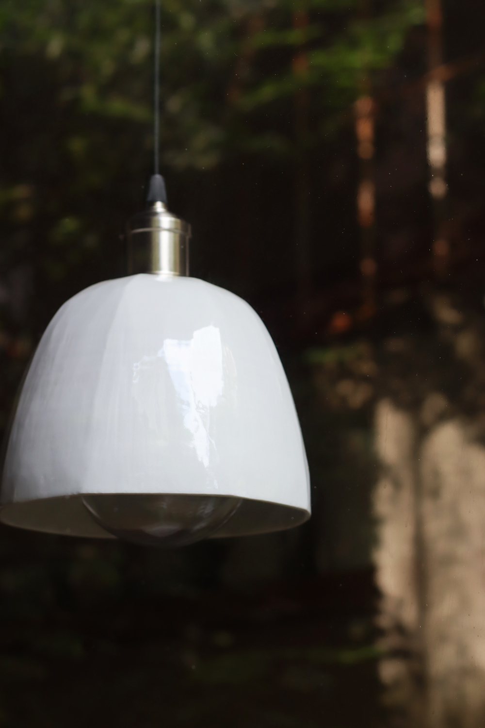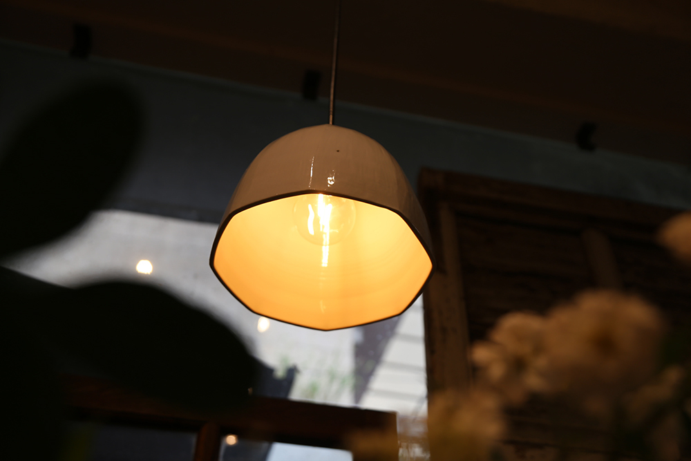 經過高溫燒窯,以白瓷土上透明釉燒製的瓷燈,有著多邊如花苞的紋理