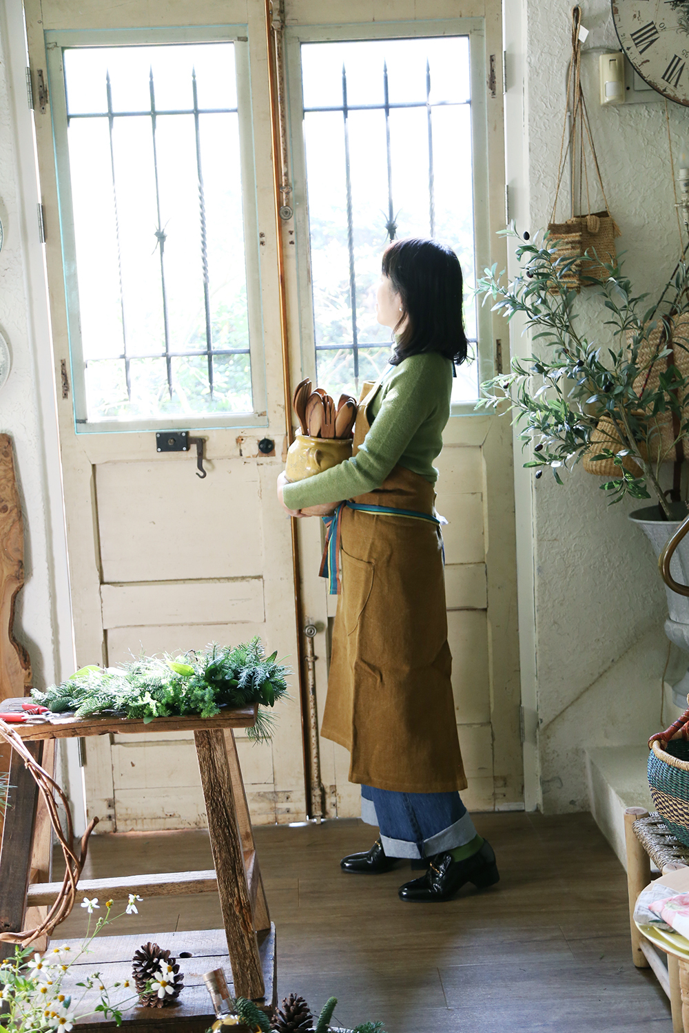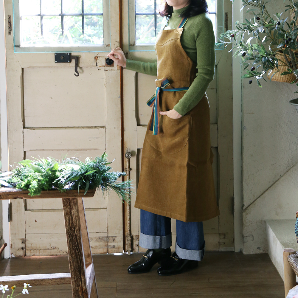 全新的純石洗亞麻圍裙,搭配堅固、緊密編織的橄欖綠色帆布。飾有色彩豐富的純亞麻絲帶。