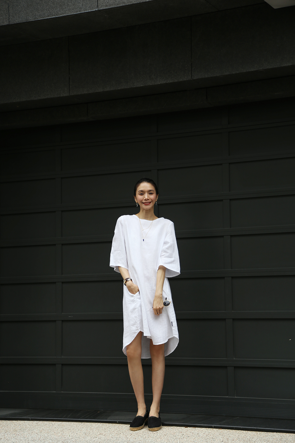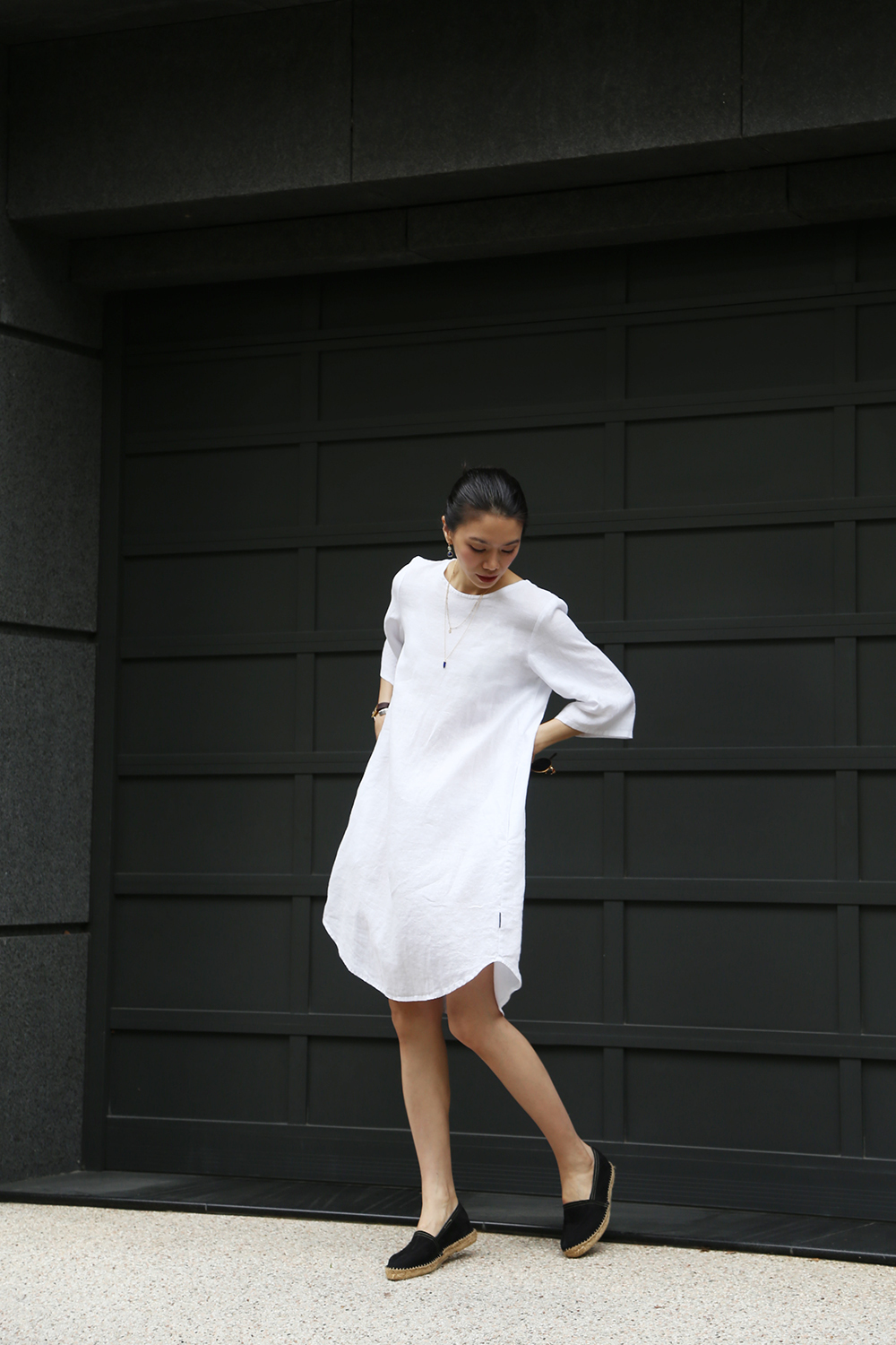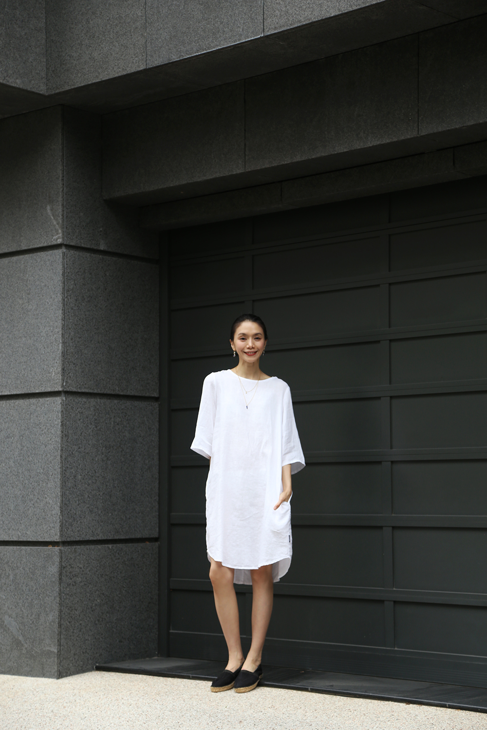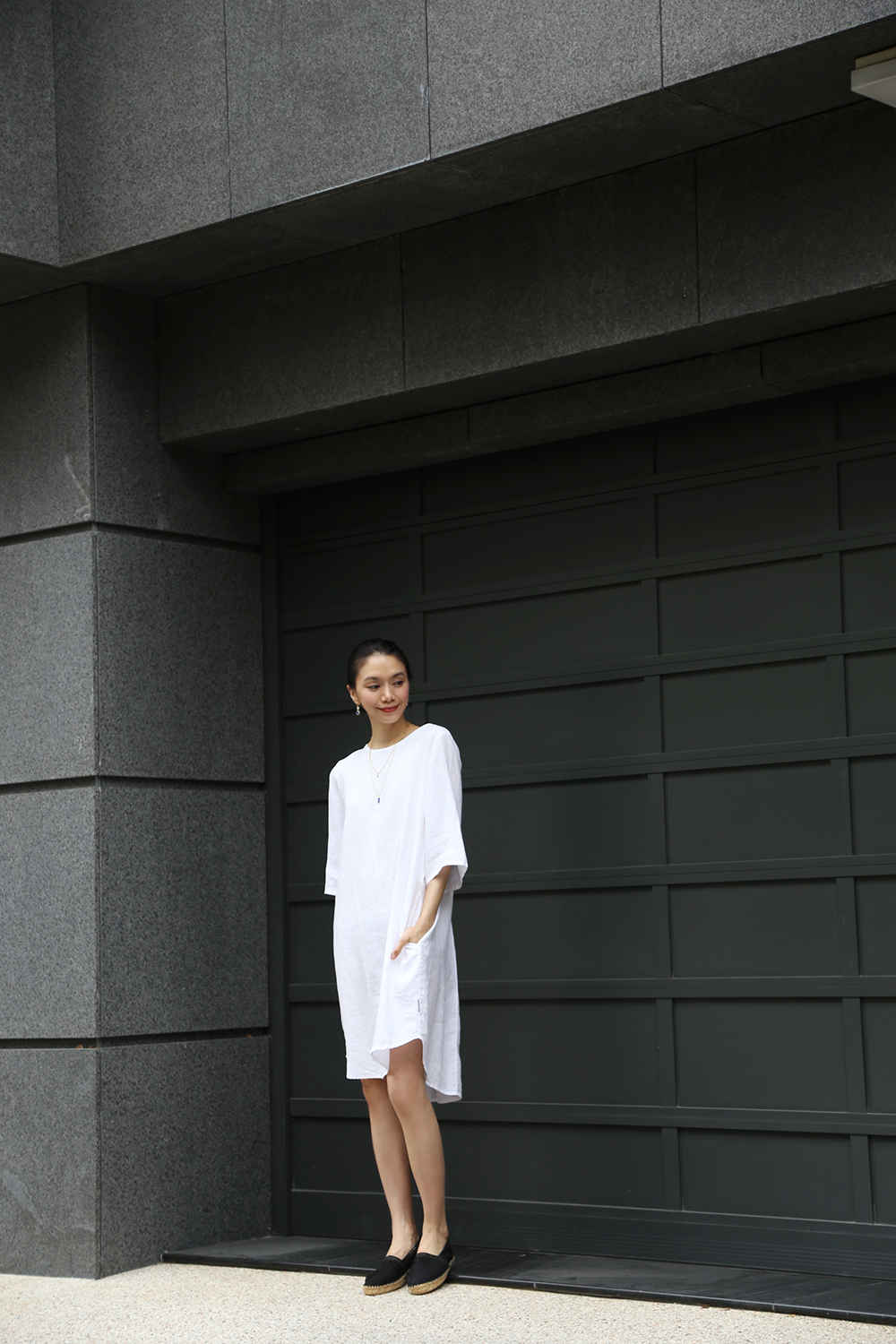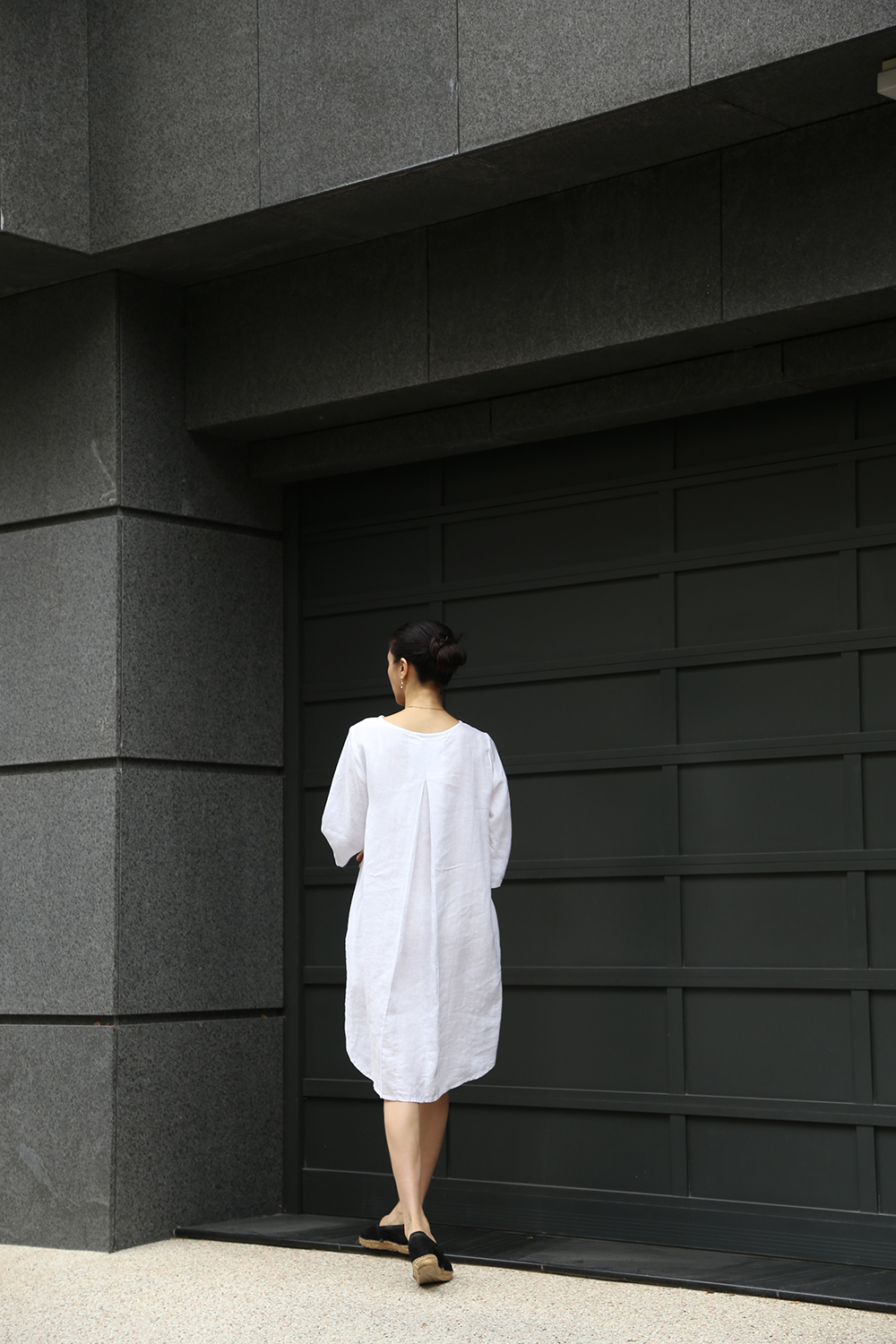 流暢的線條、飄逸的布料以及諸如後褶和兩個口袋等簡約細節