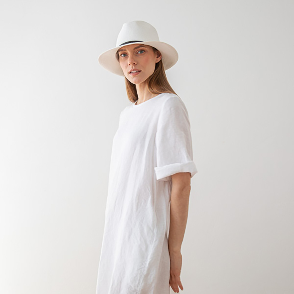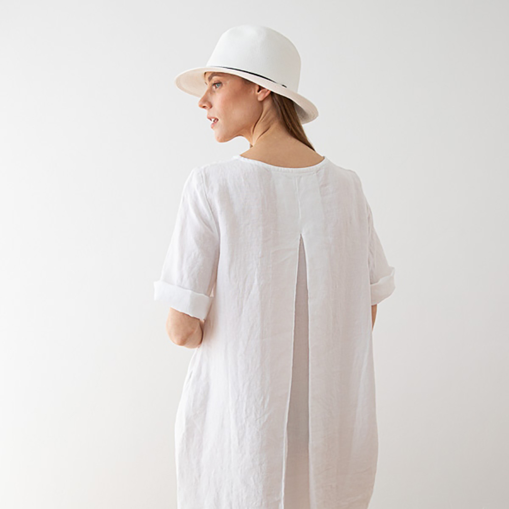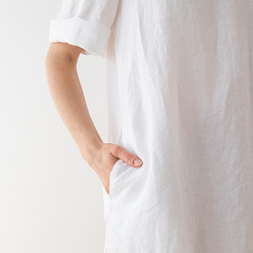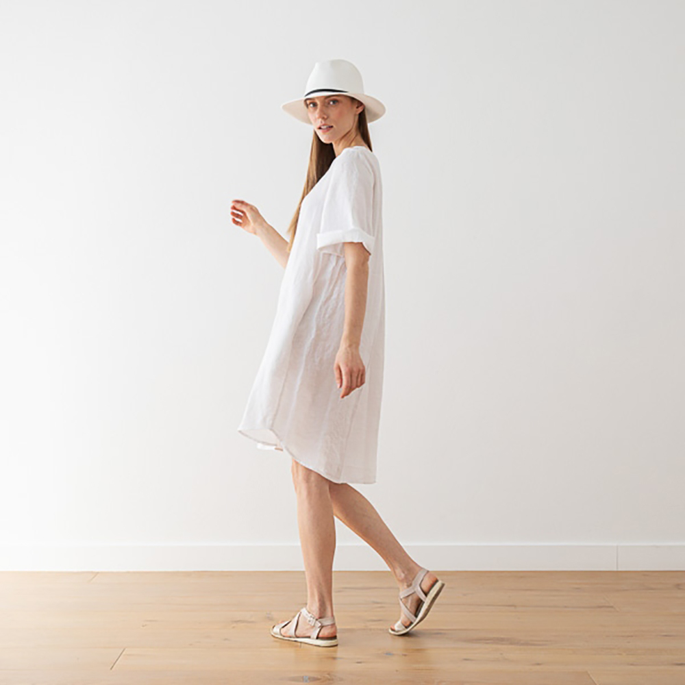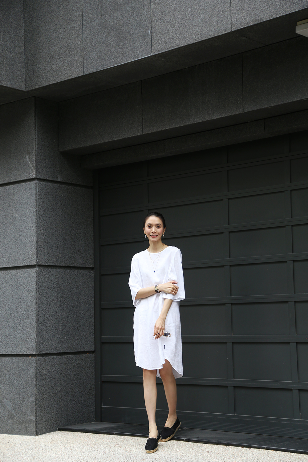 流暢的線條、飄逸的布料以及諸如後褶和兩個口袋等簡約細節