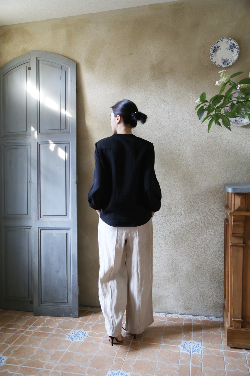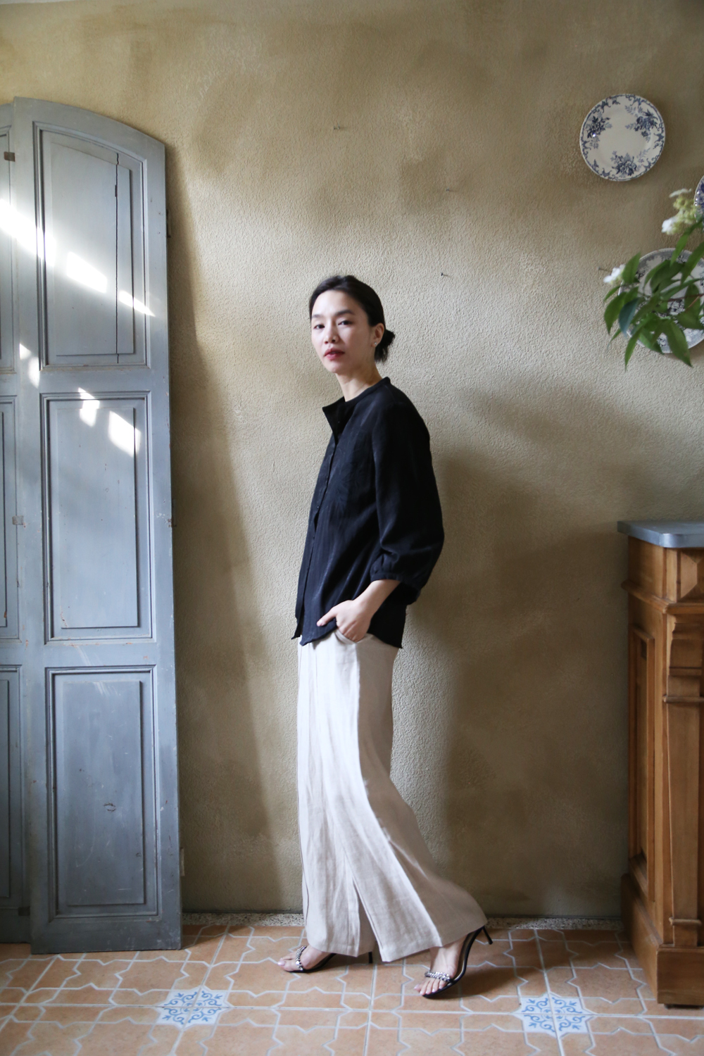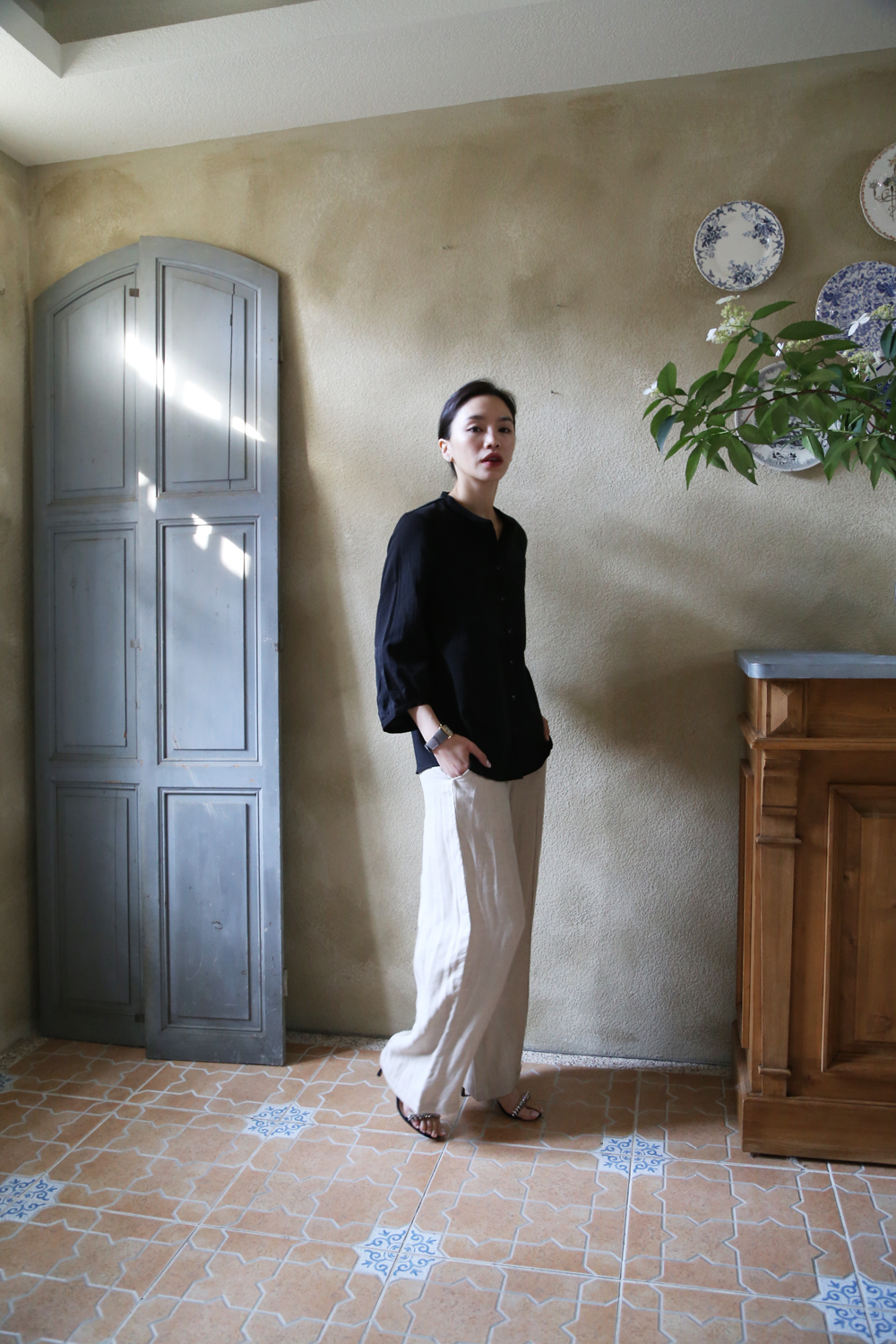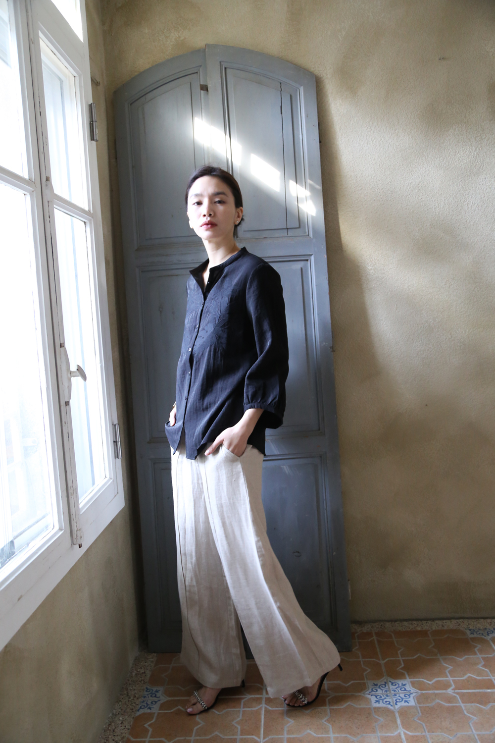 布料上是非常透氣的法國亞麻,但摸起來帶著親膚的磨面質感