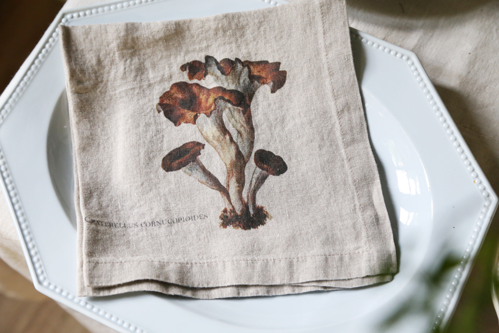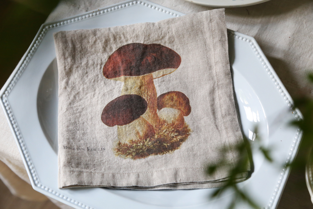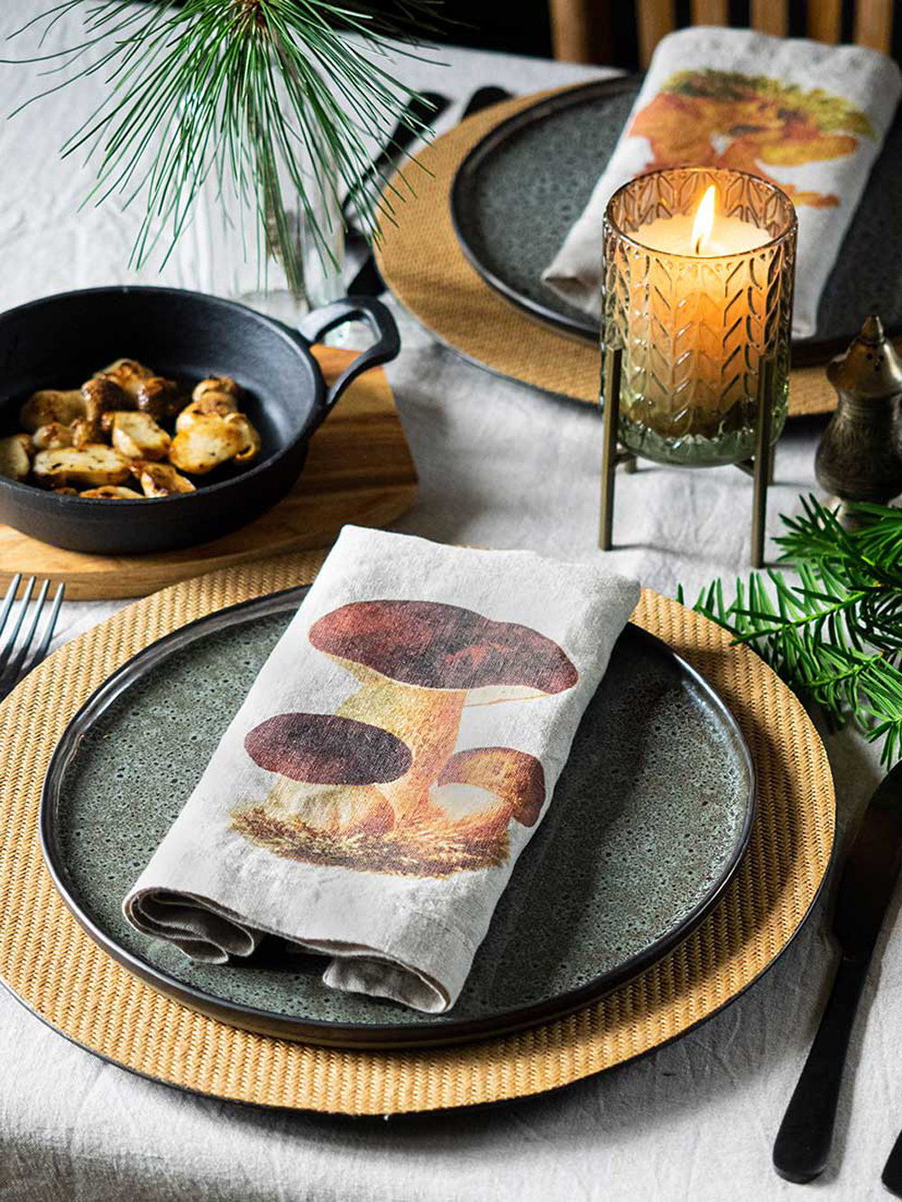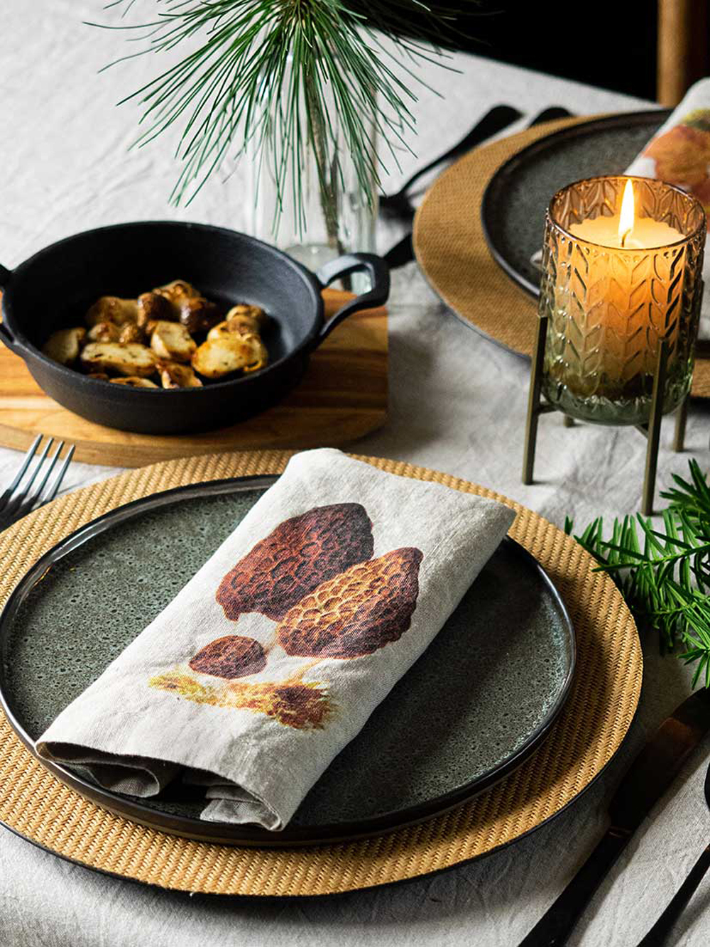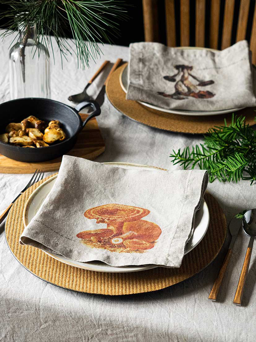 森林周圍環繞著野菇氣味、6 種不同設計的亞麻餐巾:黑色雞油菌、羊肚菌、橙蓋牛肝菌、雞油菇、牛肝菌、松乳菇
