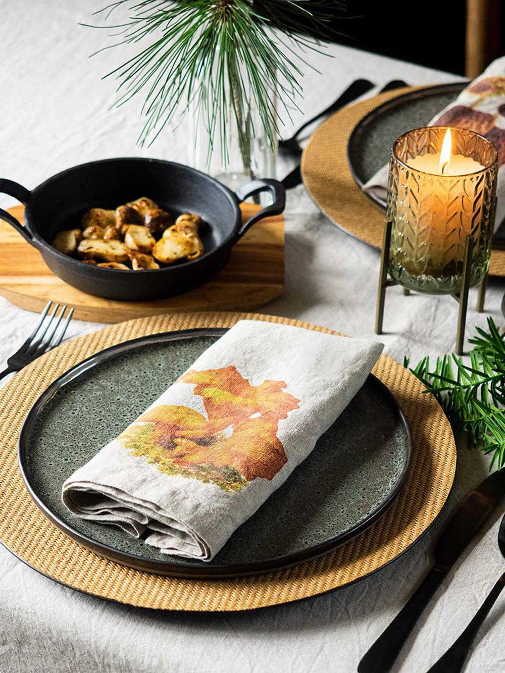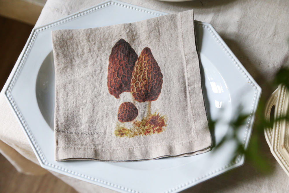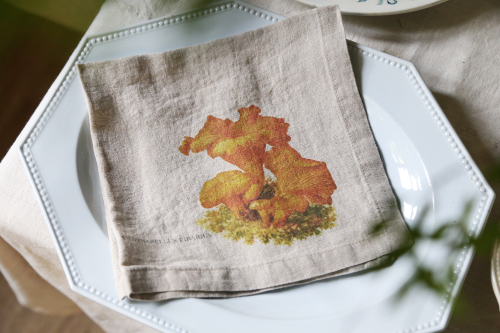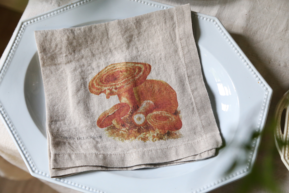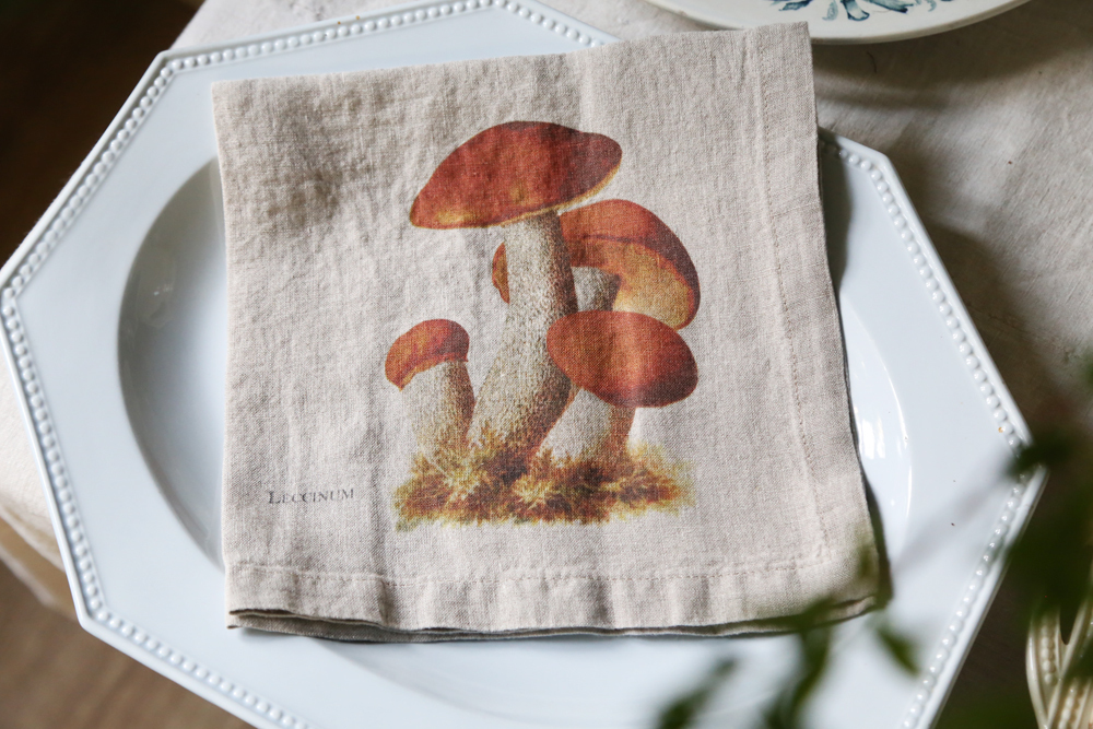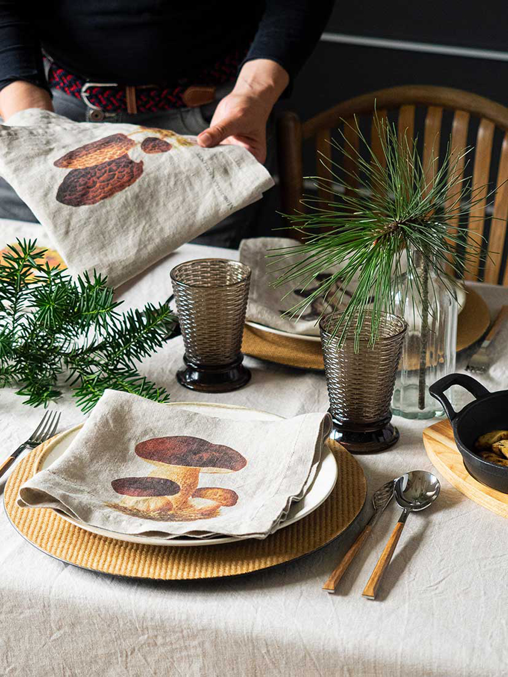 森林周圍環繞著野菇氣味、6 種不同設計的亞麻餐巾:黑色雞油菌、羊肚菌、橙蓋牛肝菌、雞油菇、牛肝菌、松乳菇