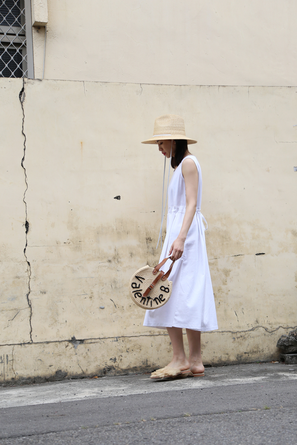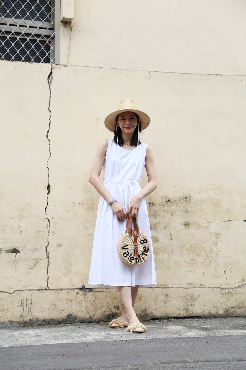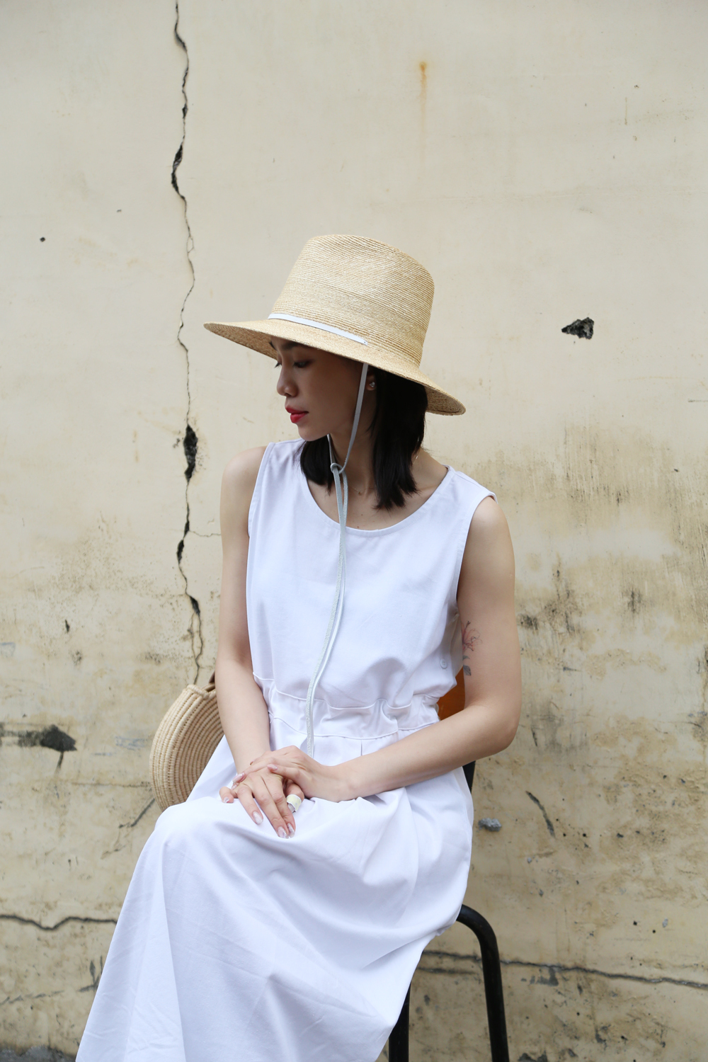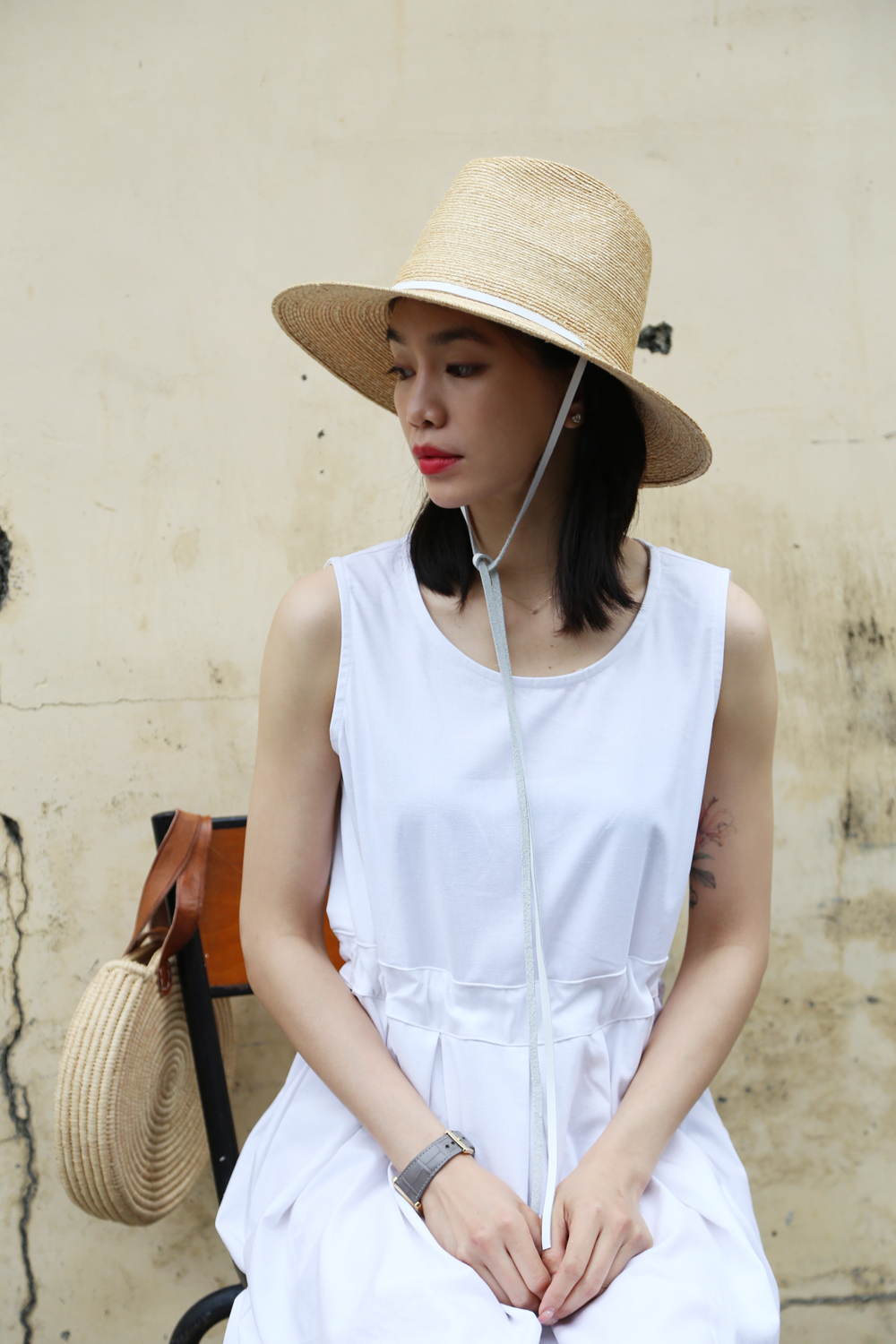 繫上白色皮革,簡單時尚,是夏日優雅時尚或外出的防曬帽