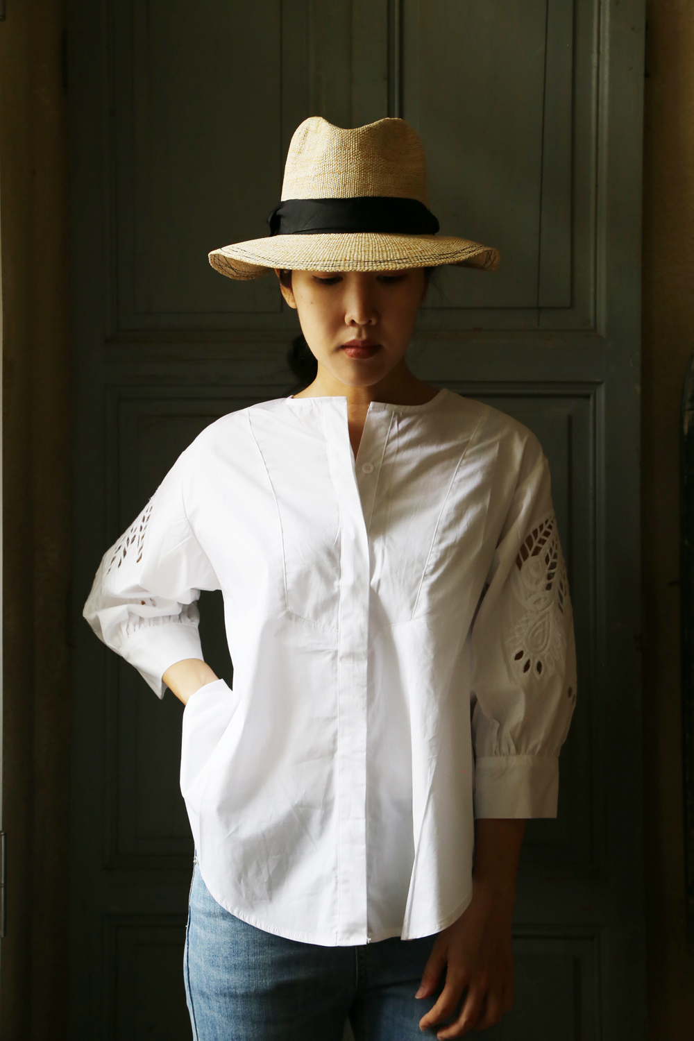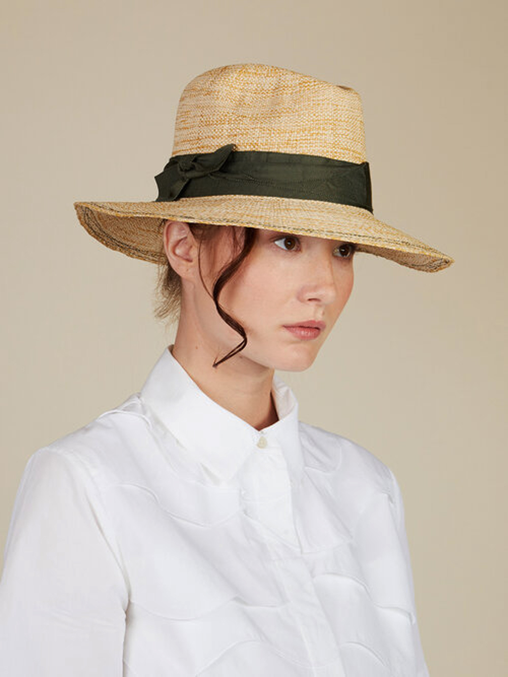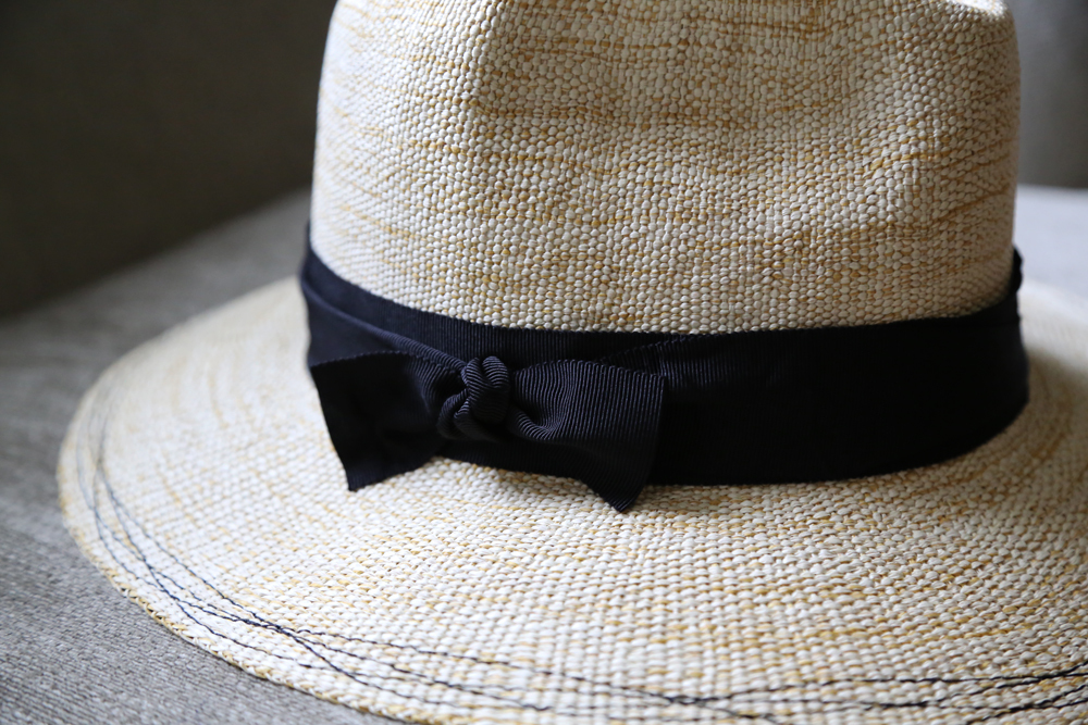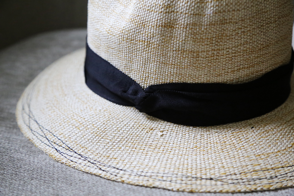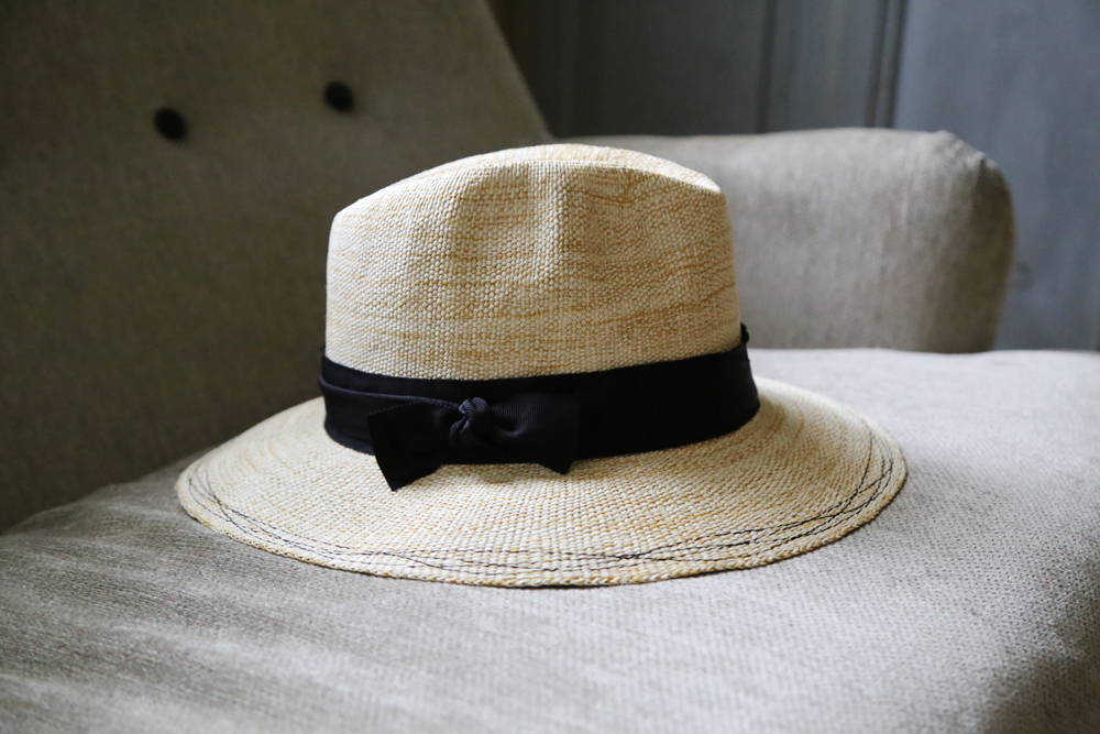 海藻綠緞帶的隨性綁飾,帽簷以隨性的波浪車縫線收尾