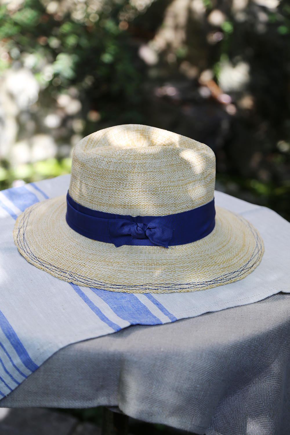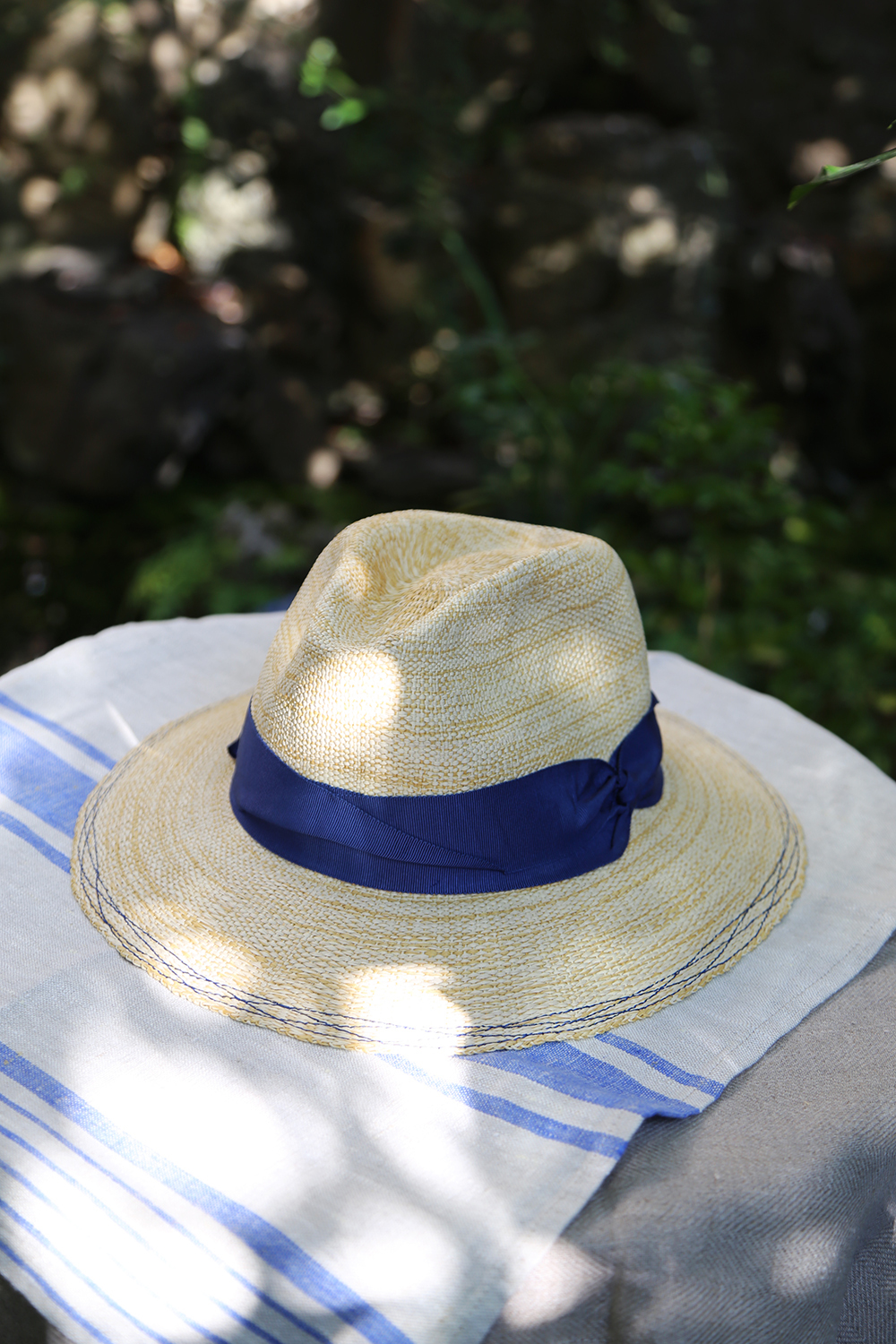 單色緞帶的隨性綁飾,帽簷以隨性的波浪車縫線收尾