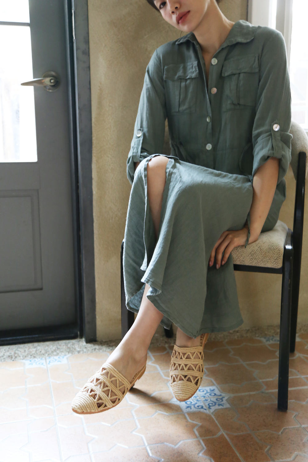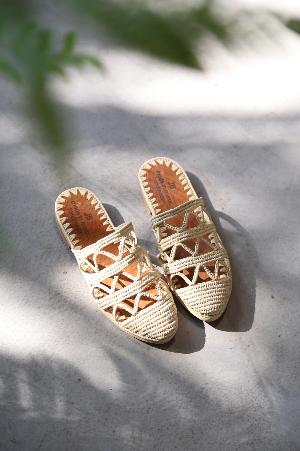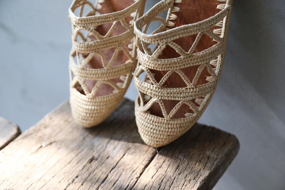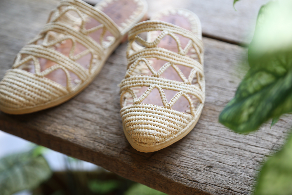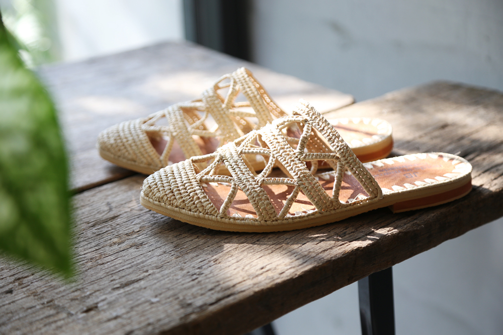 細緻的拉菲草手工編織, 搭配天然皮革及防滑膠底