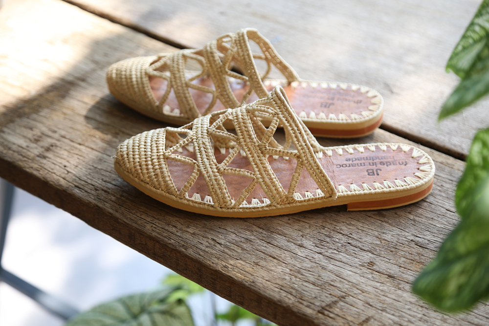 來自摩洛哥的手工編織拉菲草牛皮穆勒鞋/涼鞋