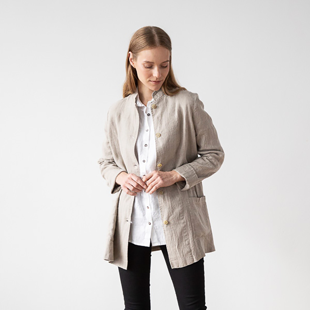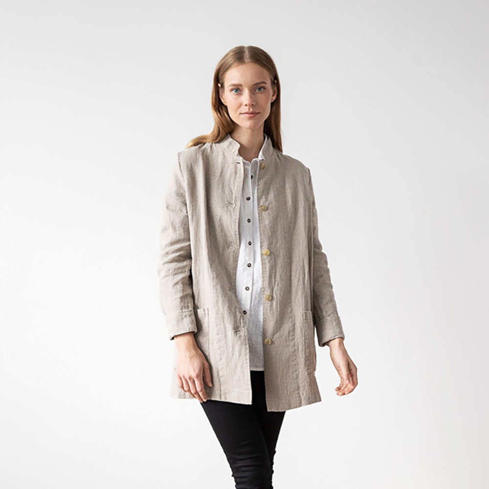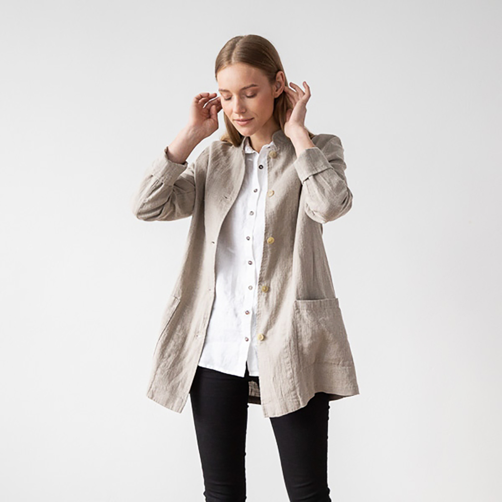 採用低胸立領設計,正面紐帶點綴,並配有兩個口袋