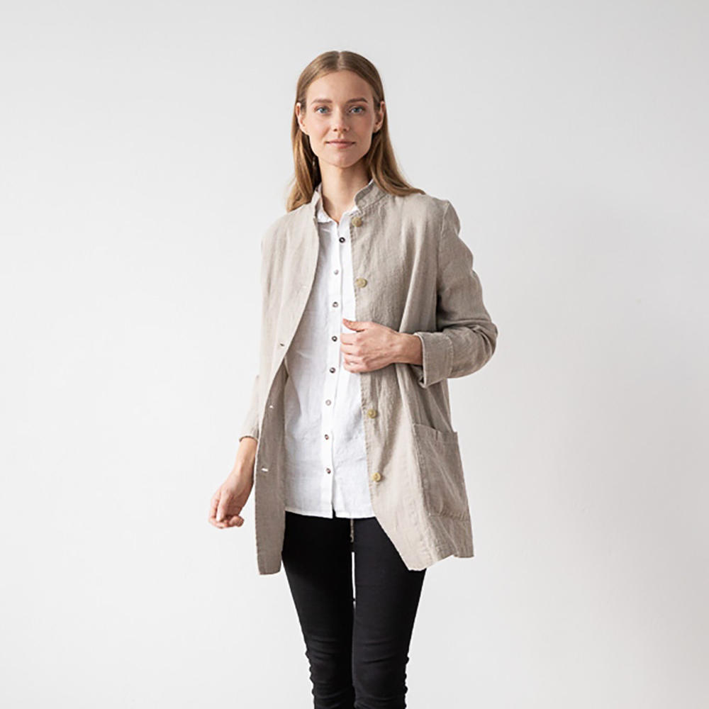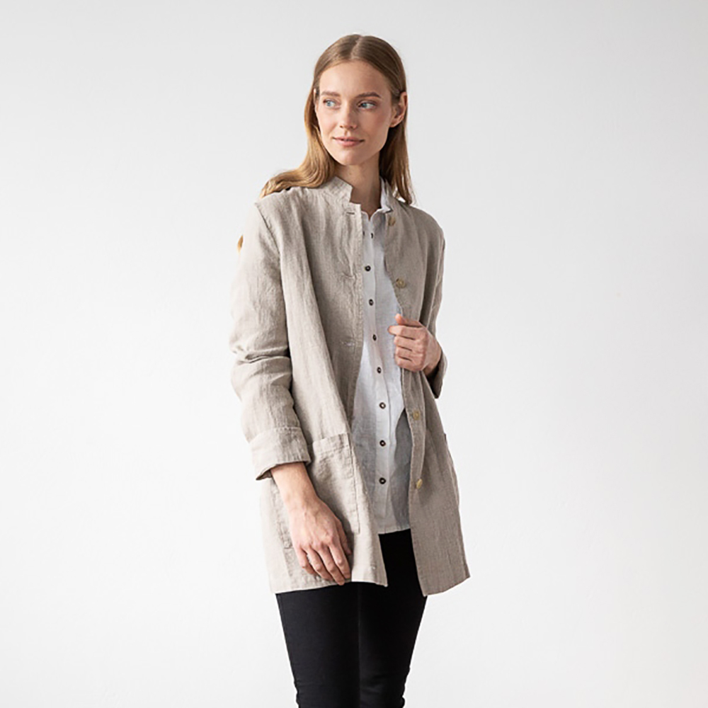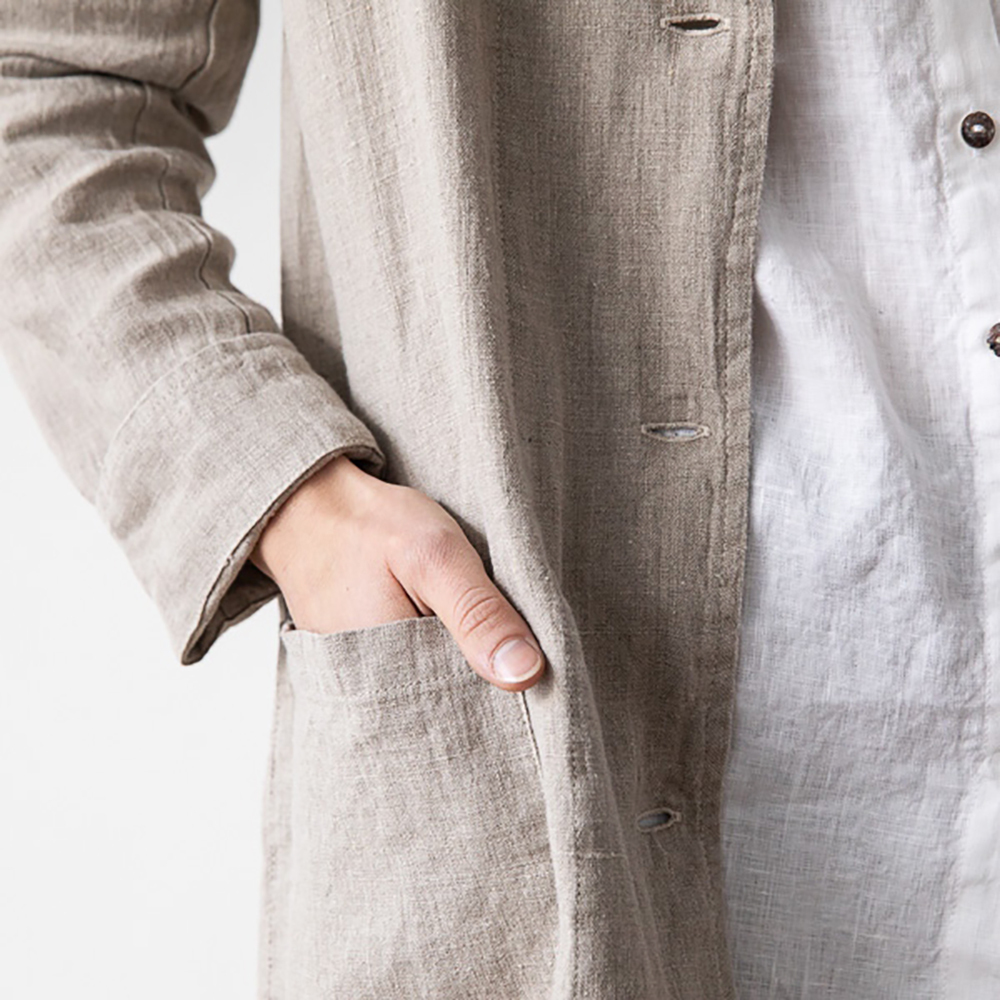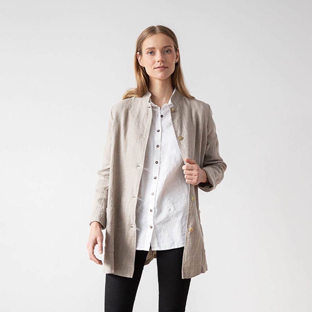 採用低胸立領設計,正面紐帶點綴,並配有兩個口袋
