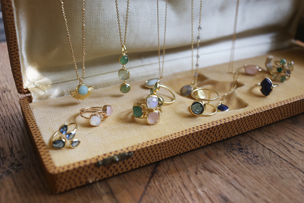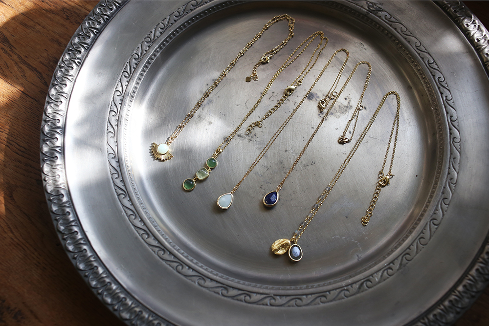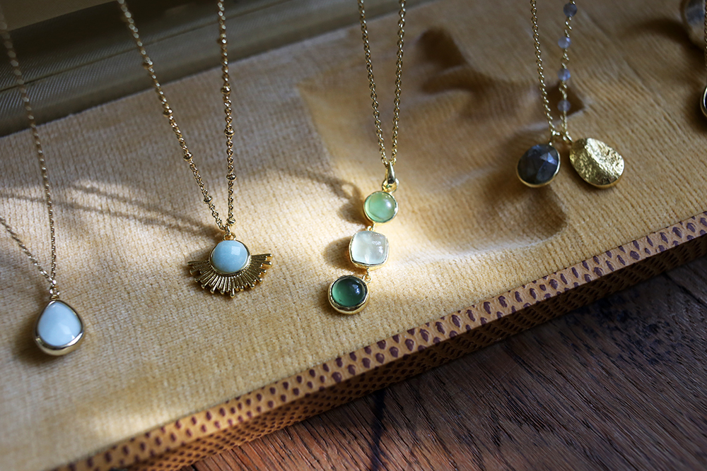 以優雅,感性和細緻,結合古典與現代,以黃銅,天然月光石、青金石、珍珠母貝、翡翠、碧璽、石英、黃玉、瑪瑙、葡萄石、東陵石等寶石的結合