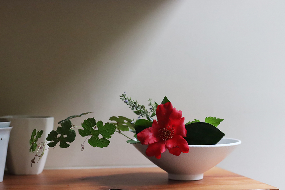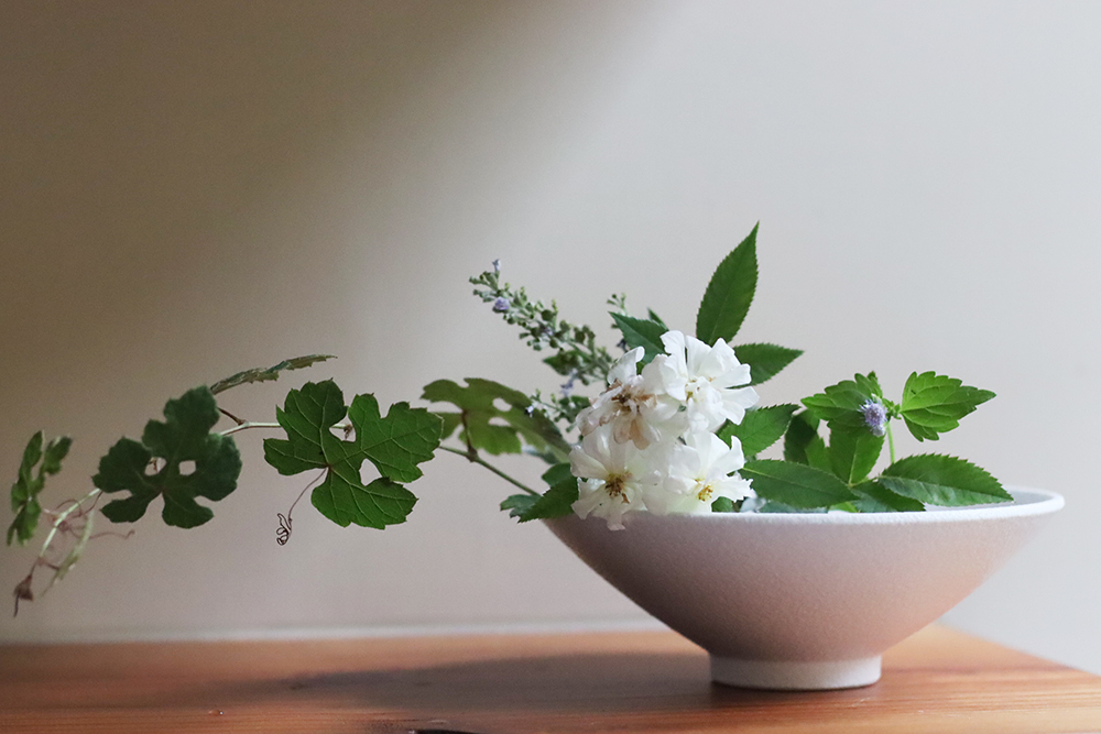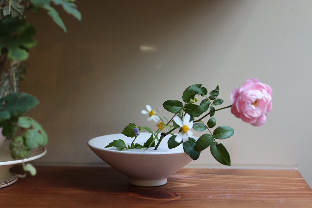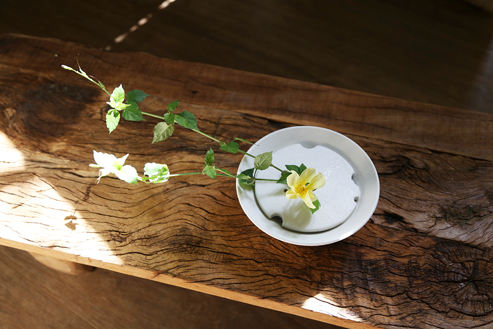 隔天在花園隨枝剪下,因裡面有孔洞,花草們得以安置,即有花的姿態