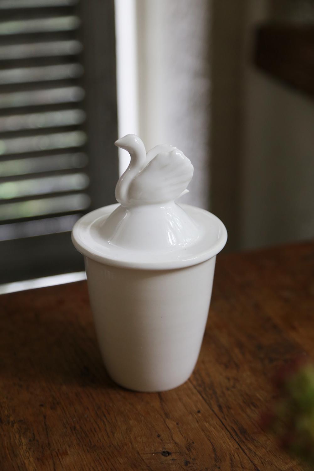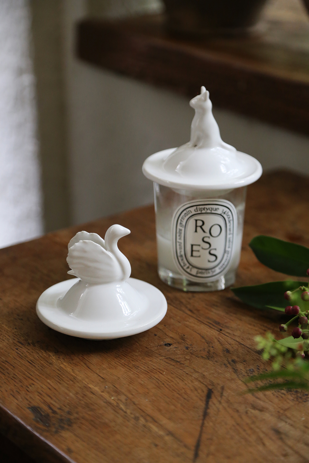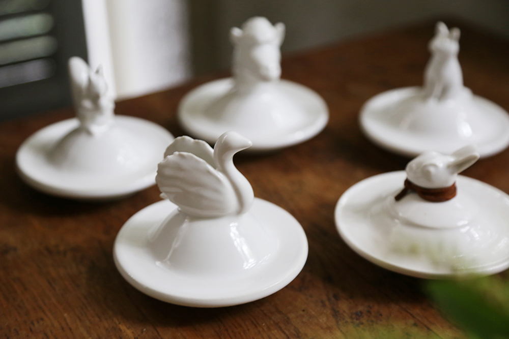 這次邀請白郁民陶作家,以冬天白色森林的動物為概念,捏製了燭蓋杯蓋。