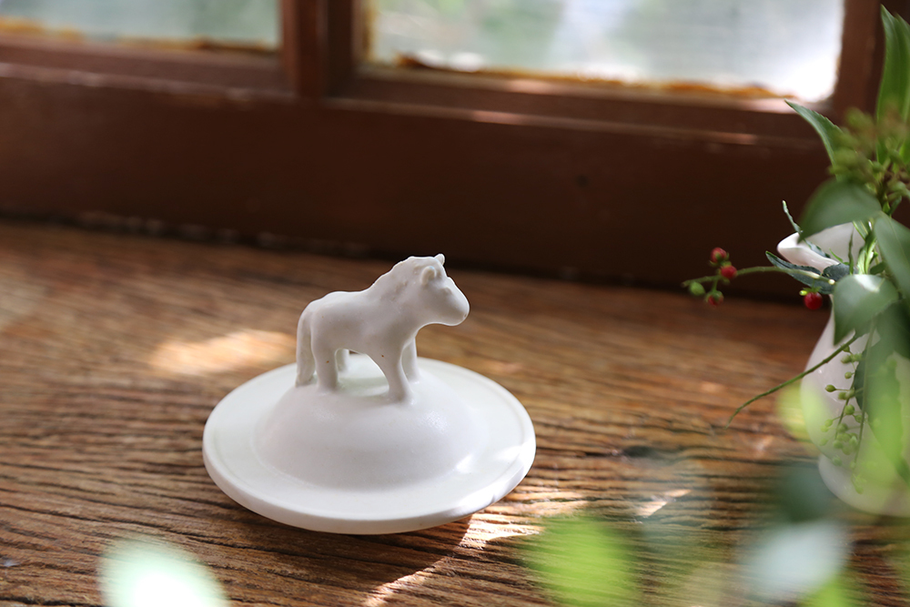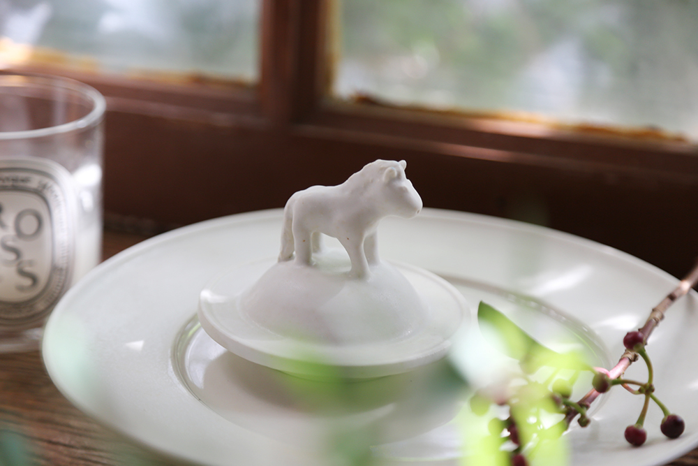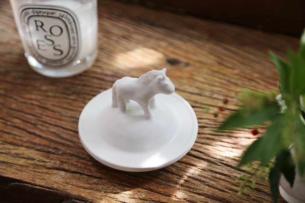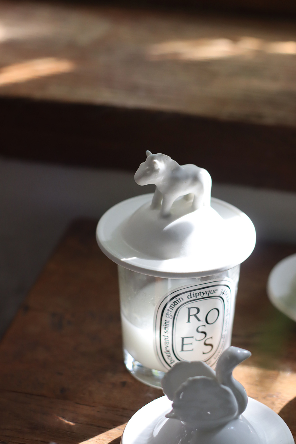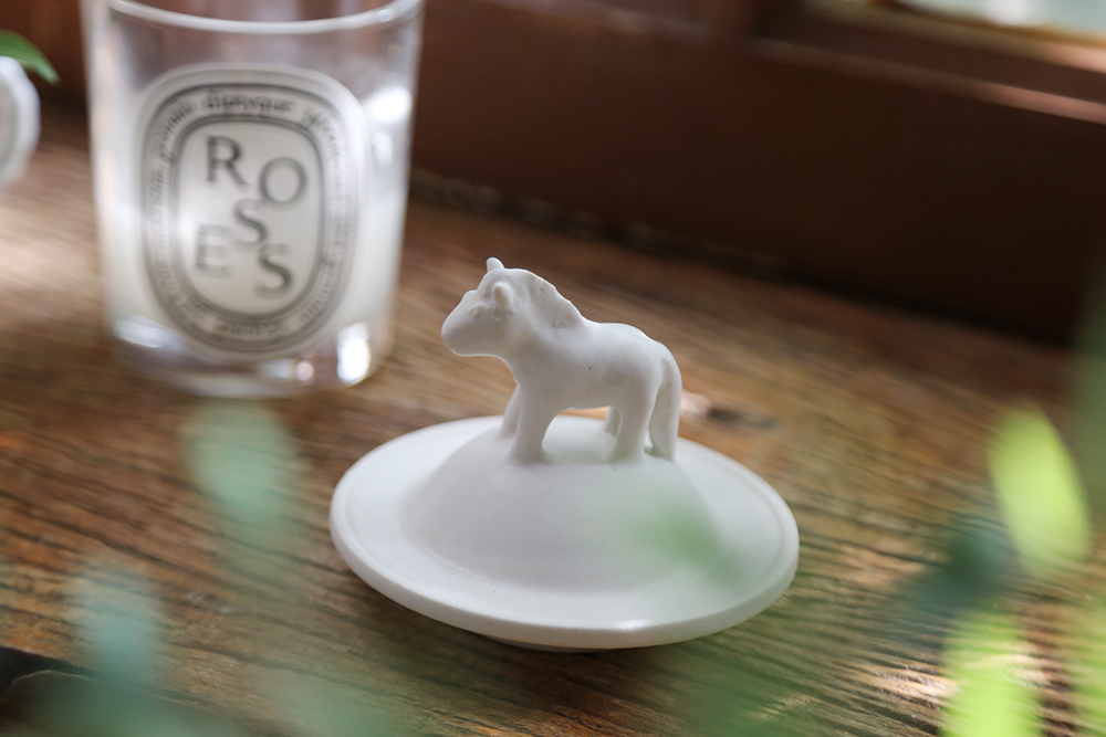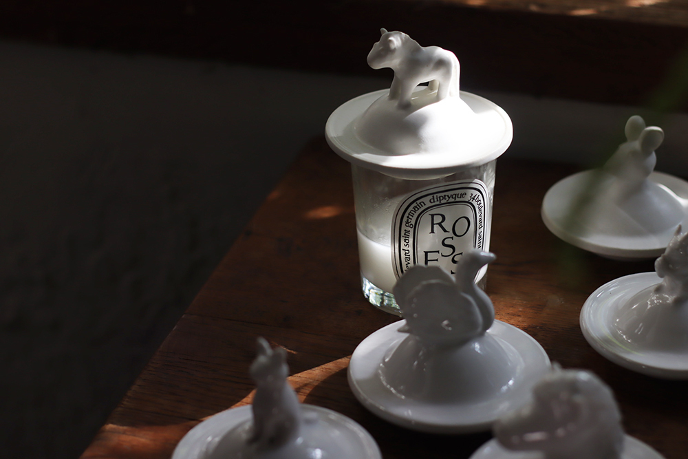 這次邀請白郁民陶作家,以冬天白色森林的動物為概念,捏製了燭蓋杯蓋。
