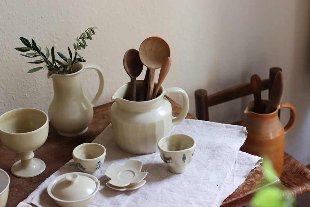 特別鍾愛18至19世紀法國南部的陶器,那些帶著古樸與純粹釉色的器皿,在陽光下泛著溫暖的光澤,彷彿凝結了時光的溫度。