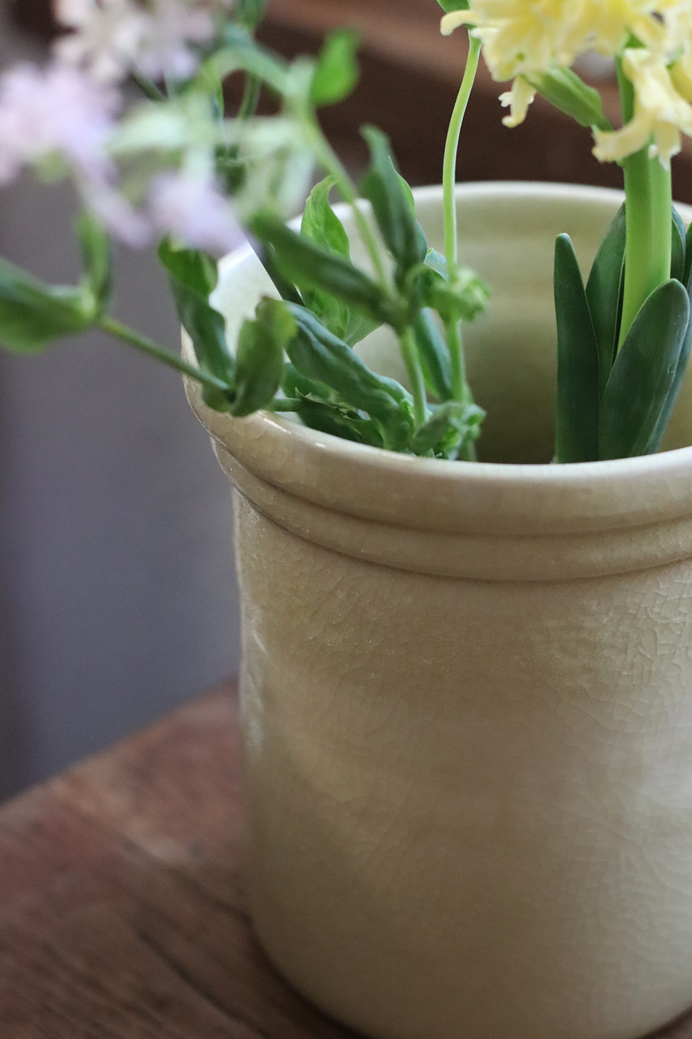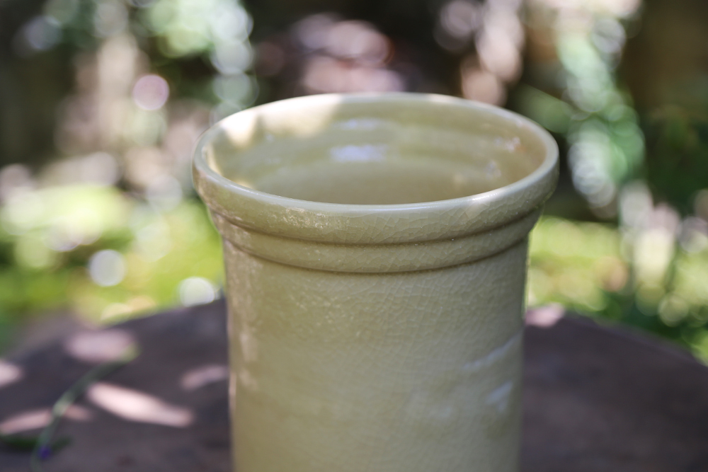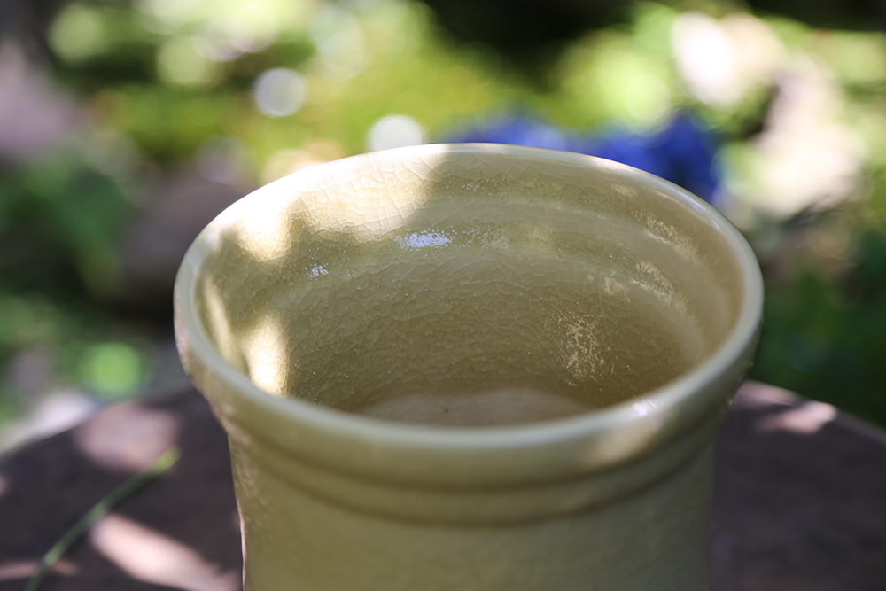 釉色融合了青瓷開片的紋理,並以鵝黃與奶油白交融出柔和溫潤的色調。