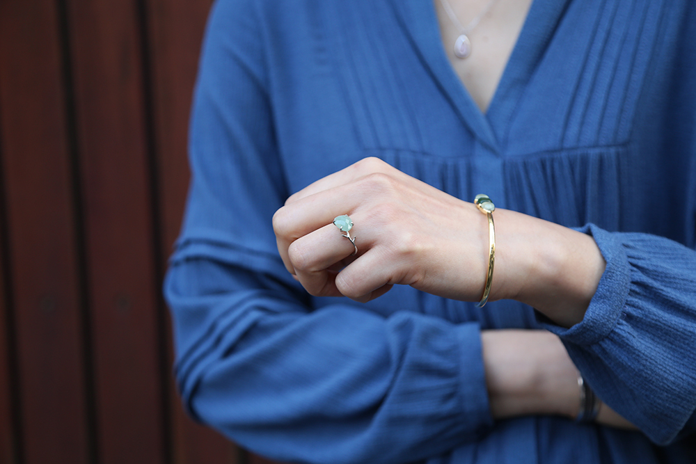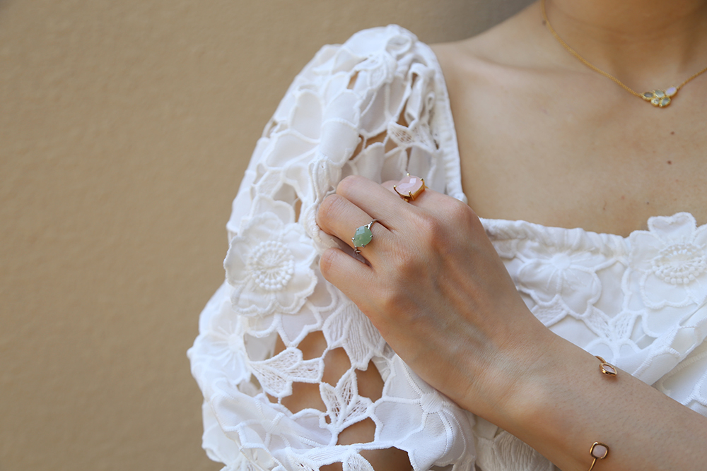 以優雅,感性和細緻,結合古典與現代,以黃銅,天然月光石、青金石、珍珠母貝、翡翠、碧璽、石英、黃玉、瑪瑙、葡萄石、東陵石等寶石的結合
