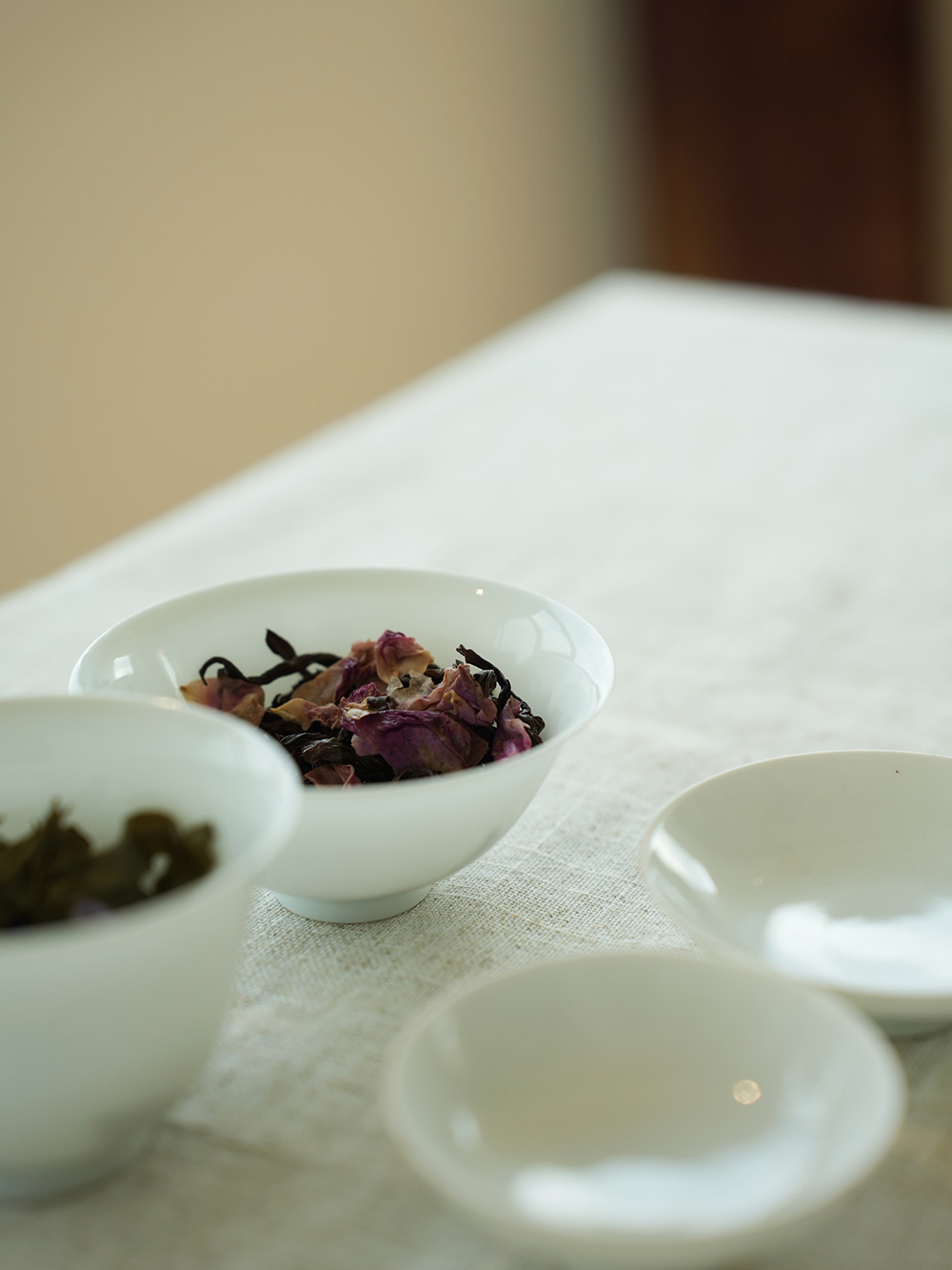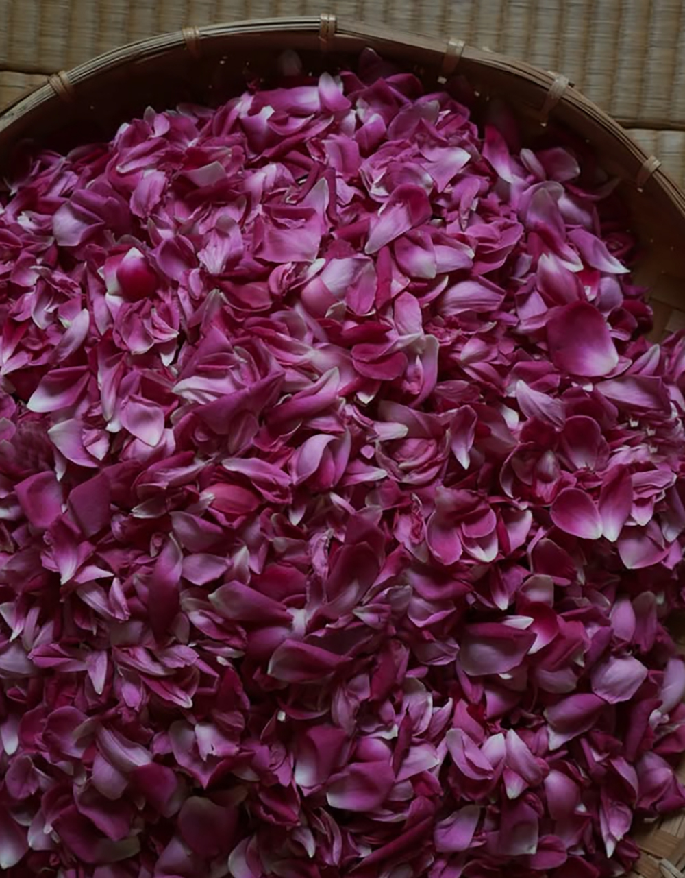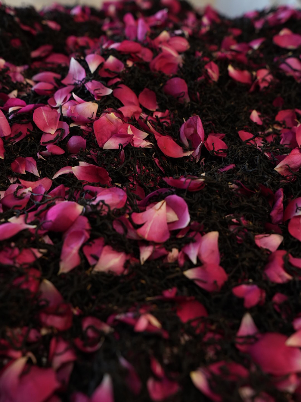 以具年份的老欉蒔茶紅茶為基底,進行三道窨花,每一道選用不同品種的有機玫瑰,使香氣逐層堆疊。