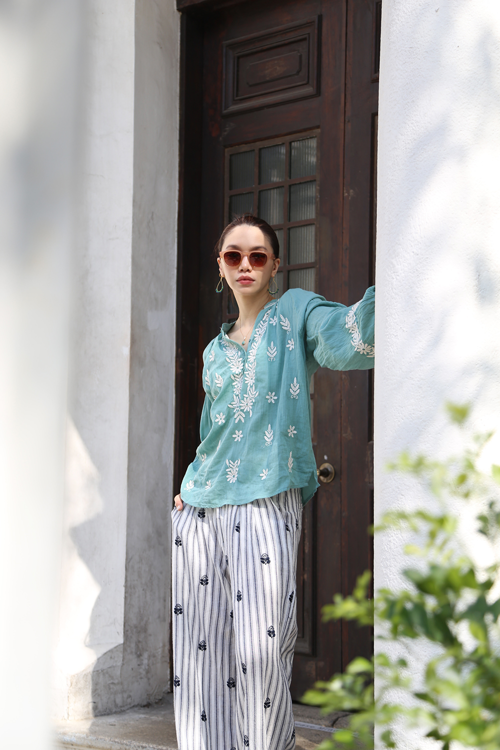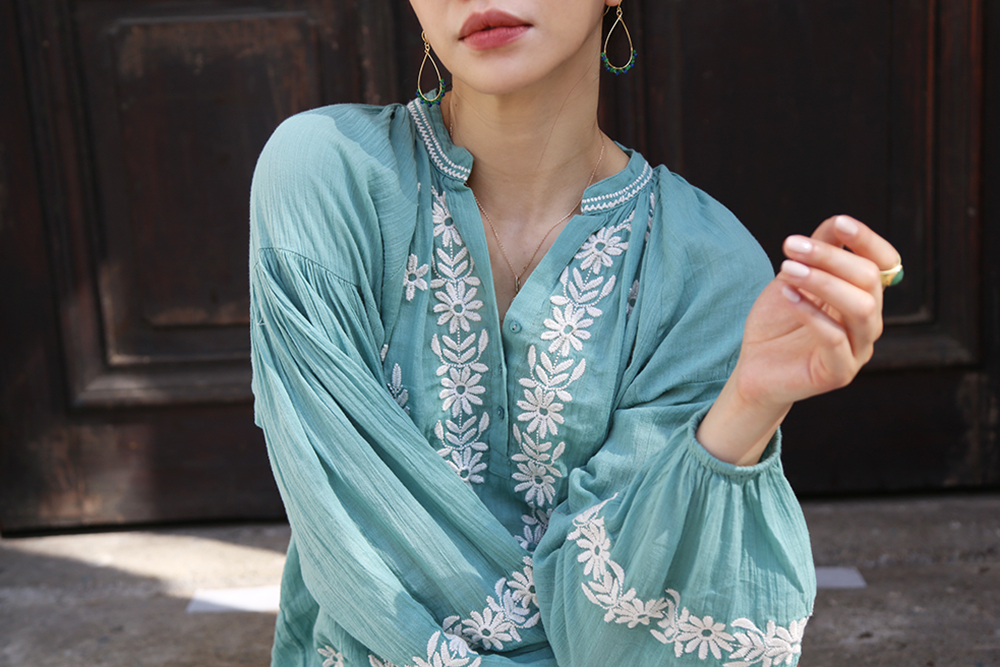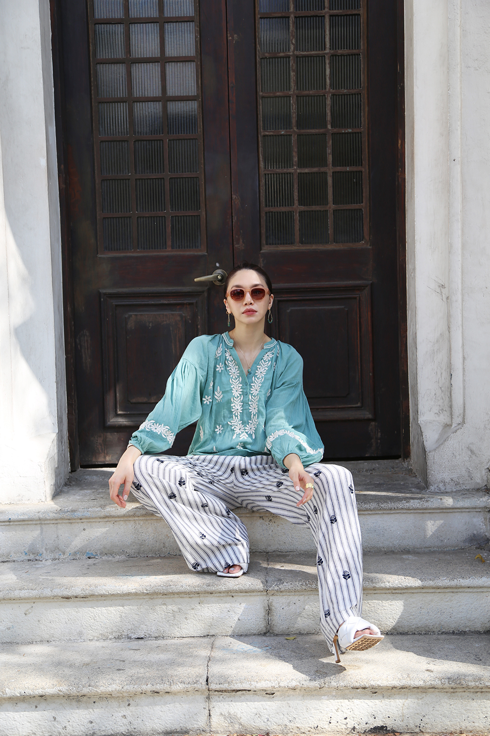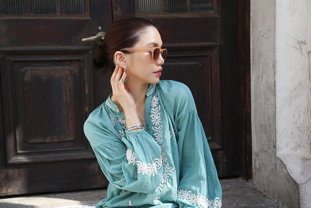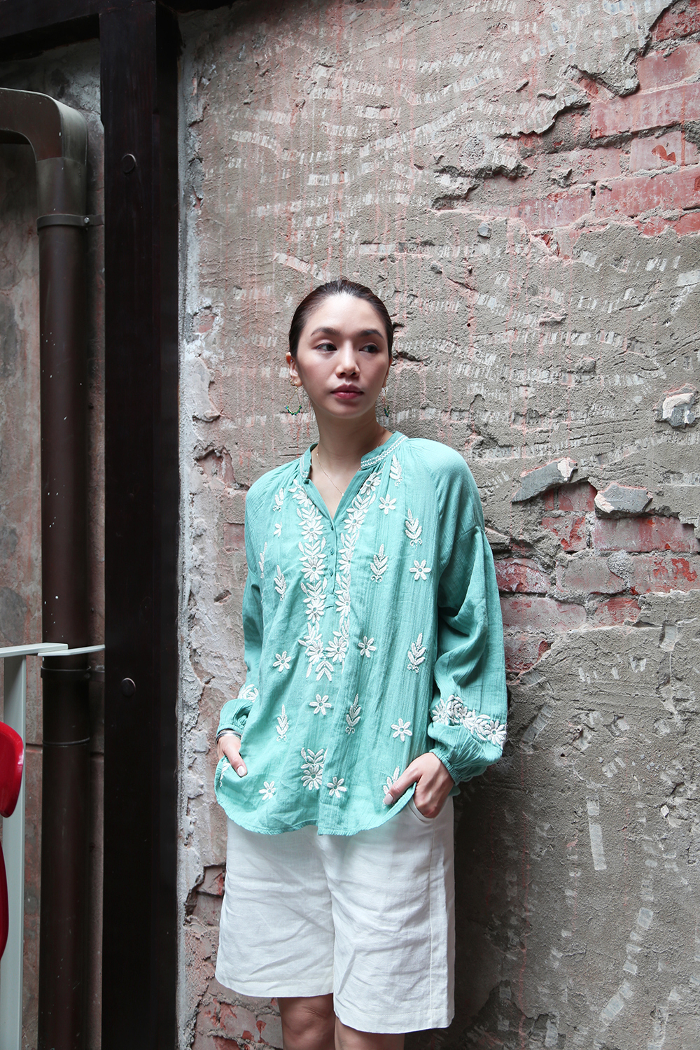 這件襯衫到底有多「酷」?豆莢綠採用超柔軟的棉紗剪裁而成,與頸部、底袖和襯衫周圍令人驚嘆的象牙色花卉刺繡完美搭配。