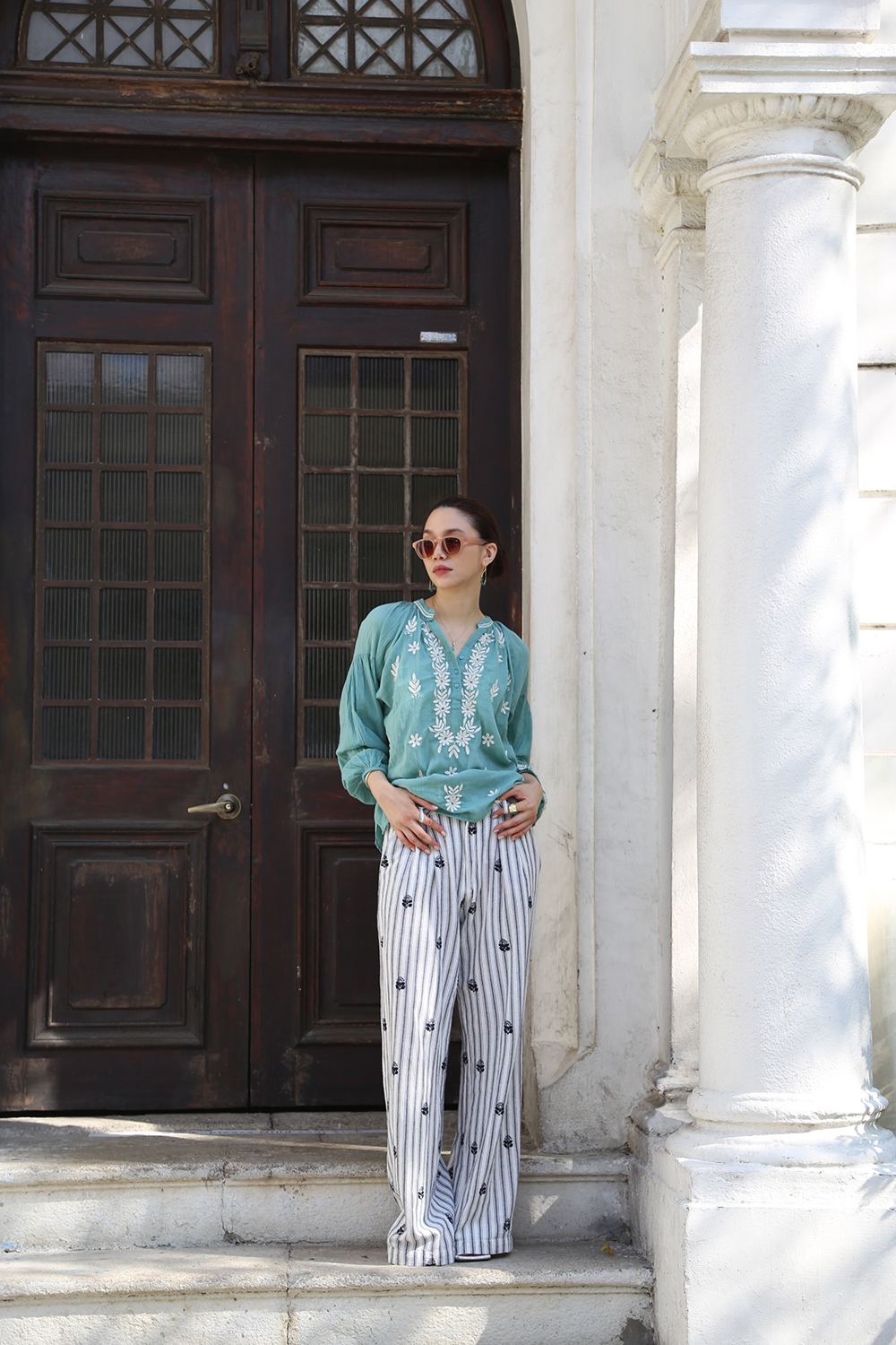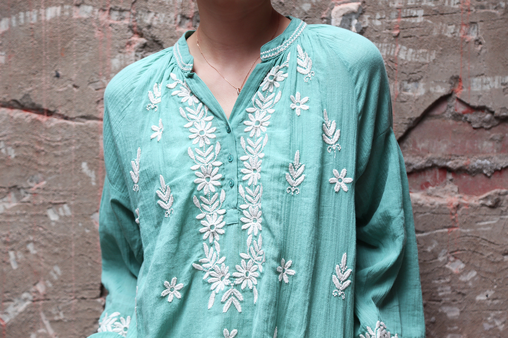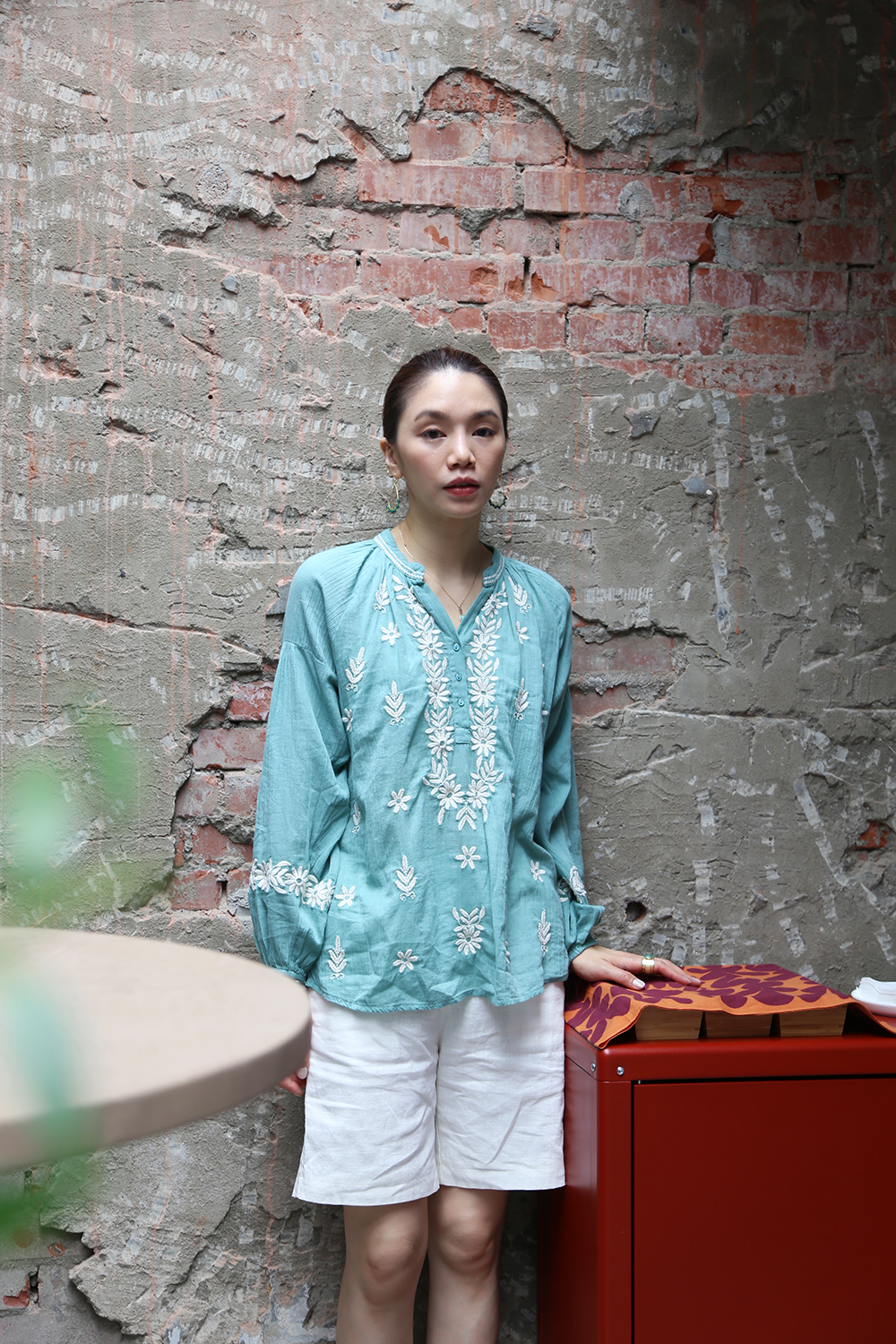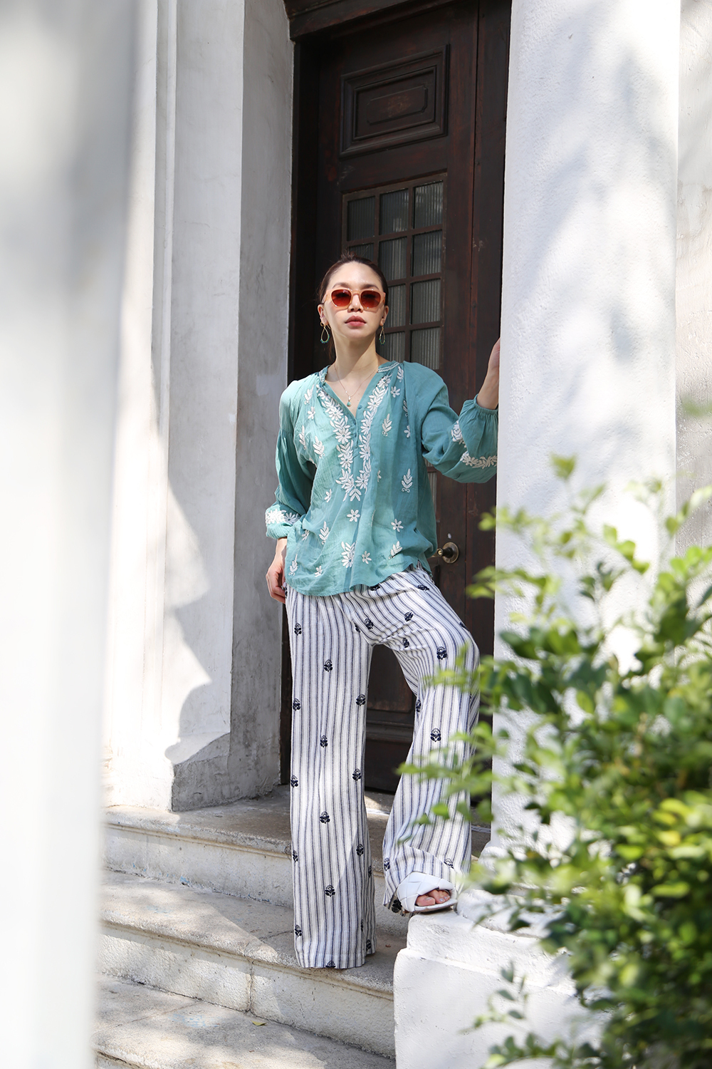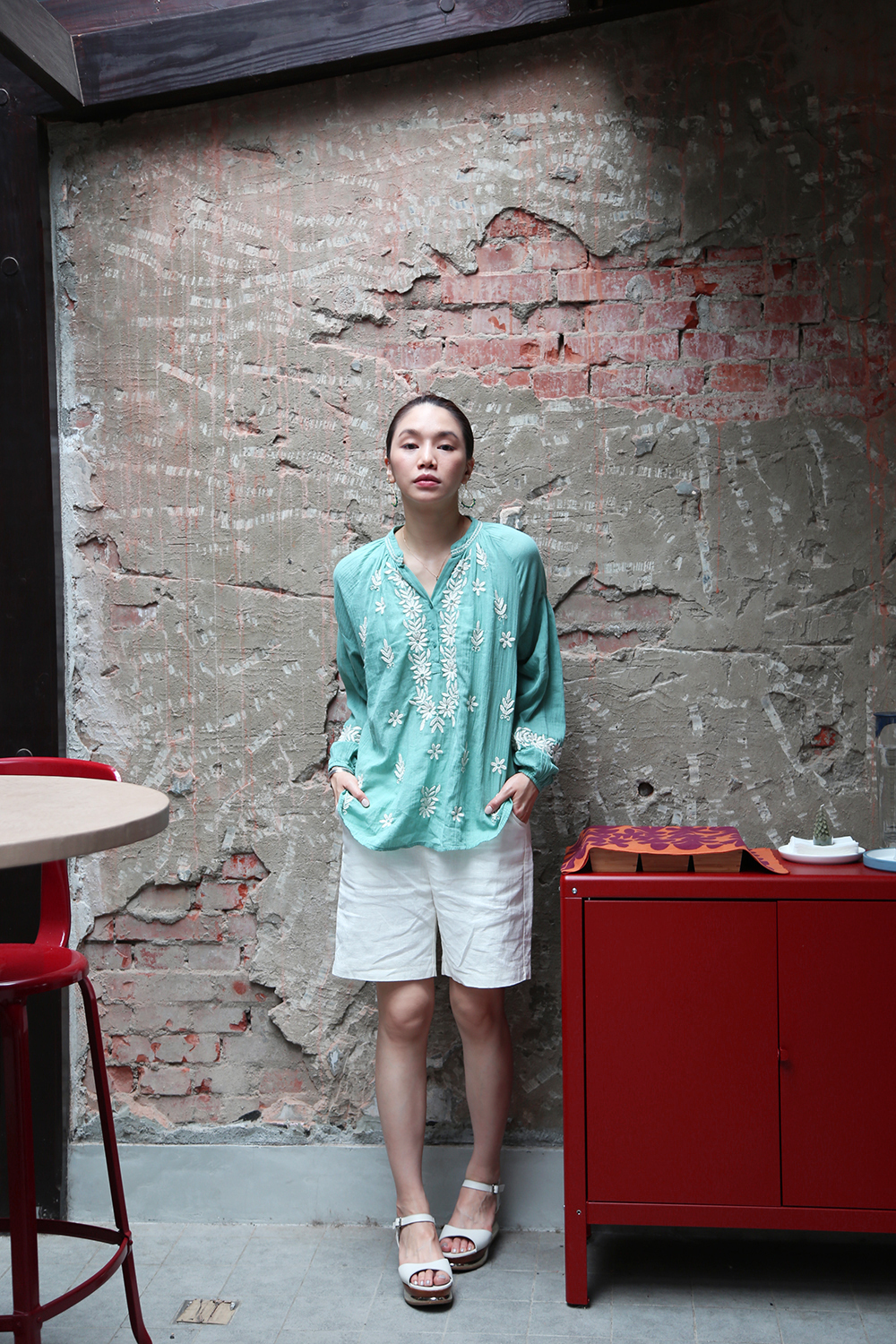 這件襯衫到底有多「酷」?豆莢綠採用超柔軟的棉紗剪裁而成,與頸部、底袖和襯衫周圍令人驚嘆的象牙色花卉刺繡完美搭配。