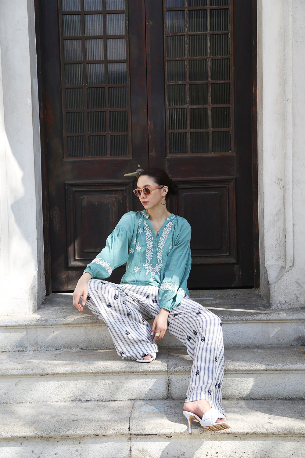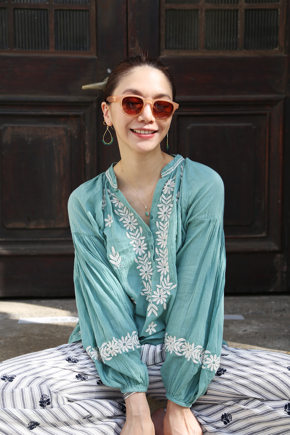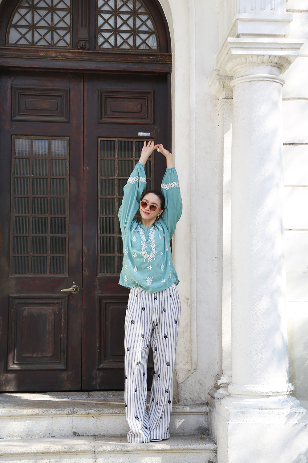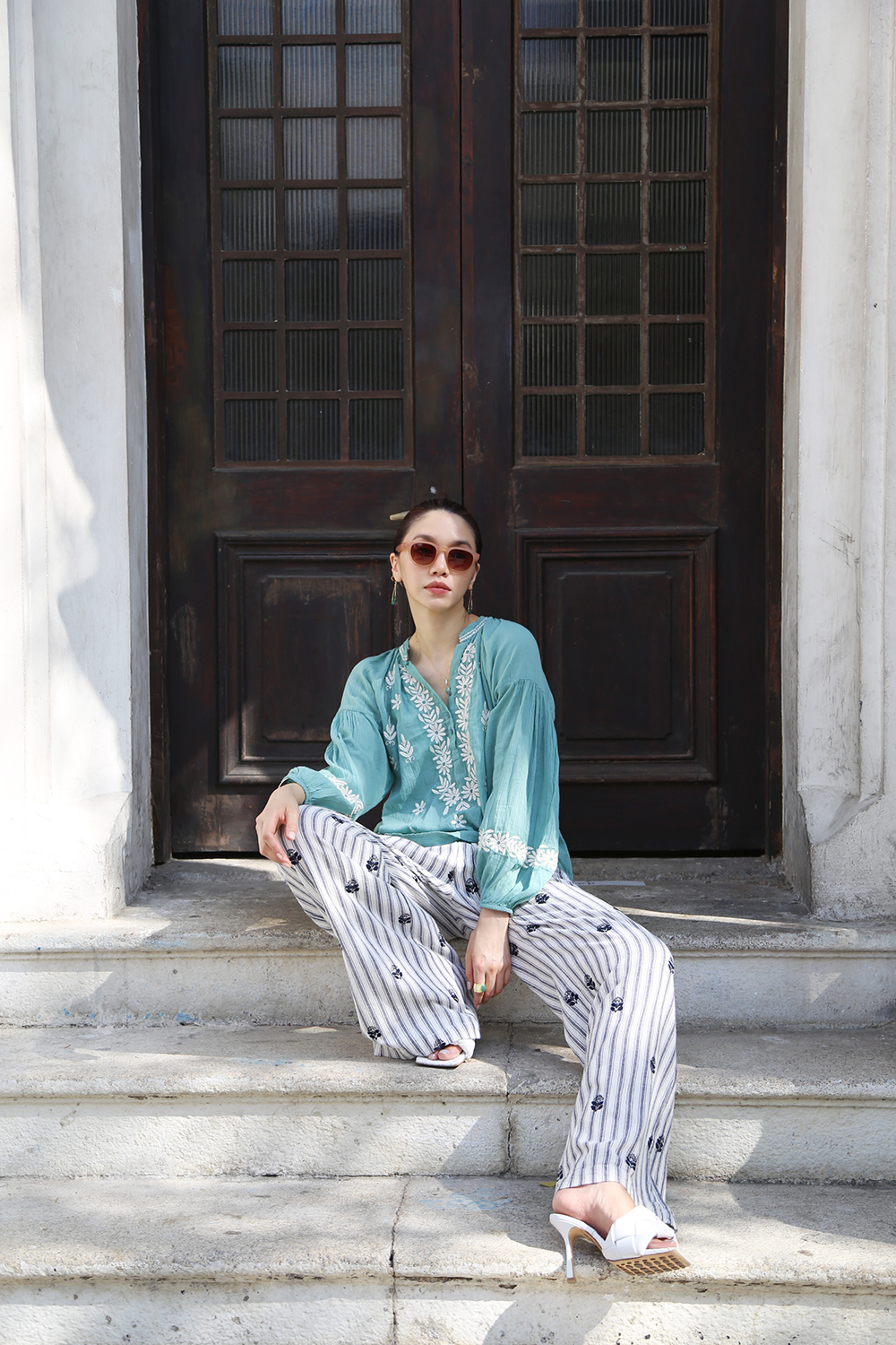 這件襯衫到底有多「酷」?豆莢綠採用超柔軟的棉紗剪裁而成,與頸部、底袖和襯衫周圍令人驚嘆的象牙色花卉刺繡完美搭配。