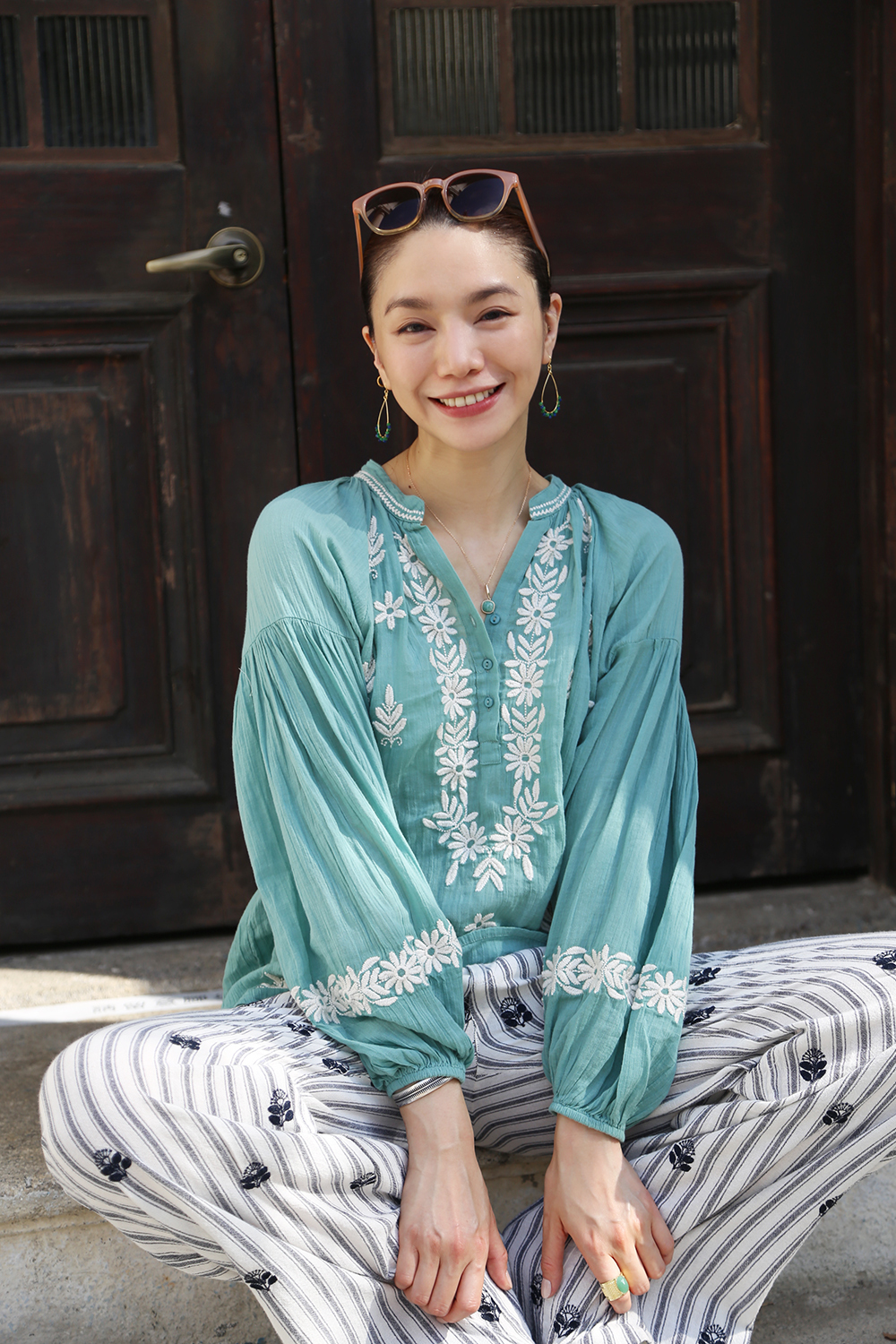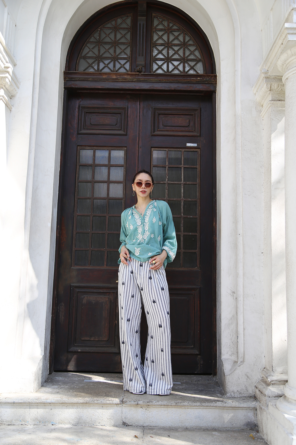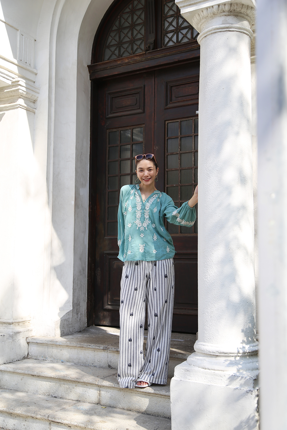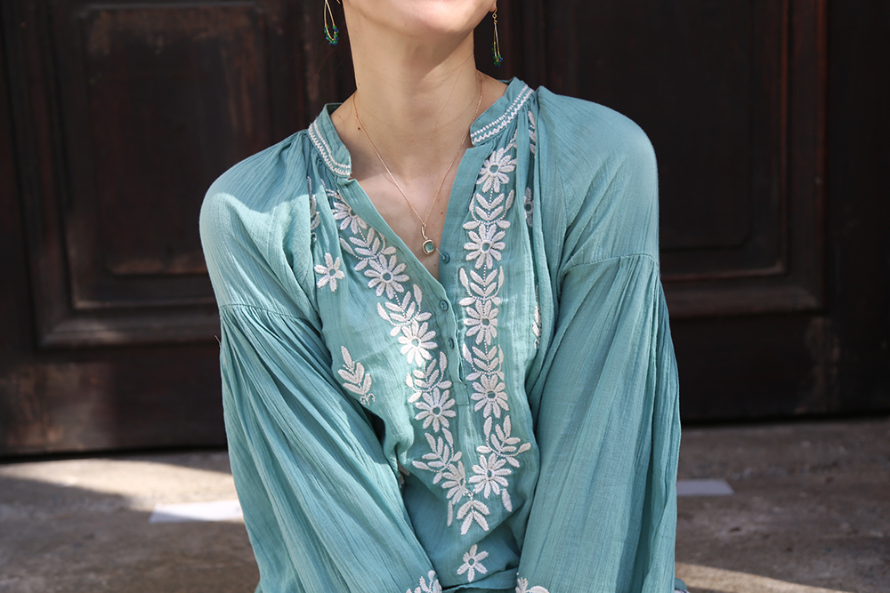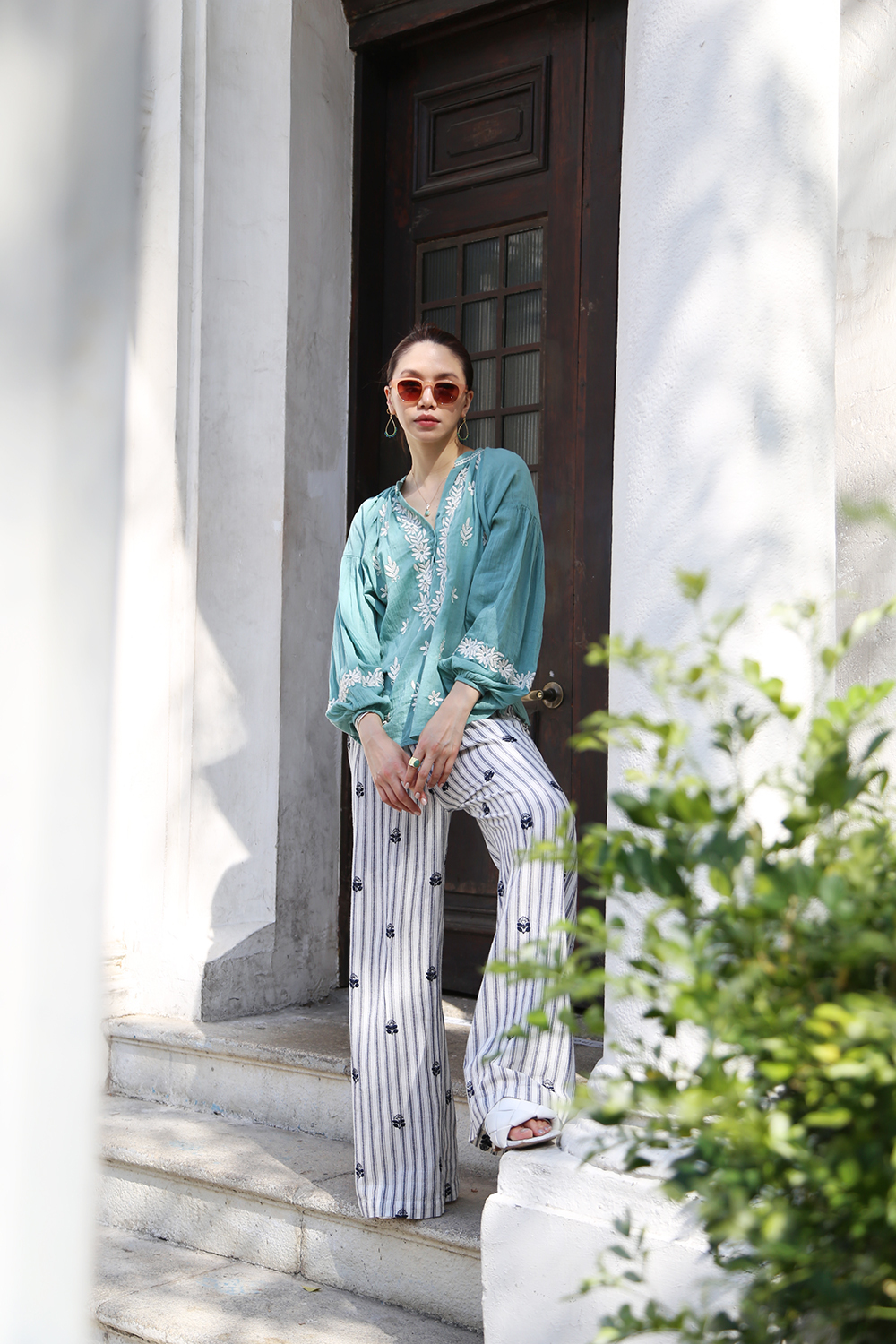 這件襯衫到底有多「酷」?豆莢綠採用超柔軟的棉紗剪裁而成,與頸部、底袖和襯衫周圍令人驚嘆的象牙色花卉刺繡完美搭配。