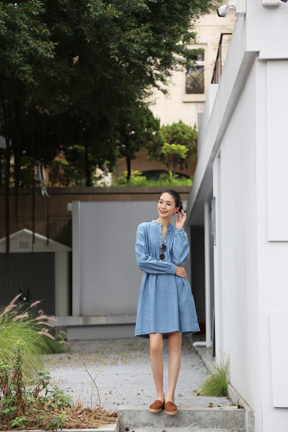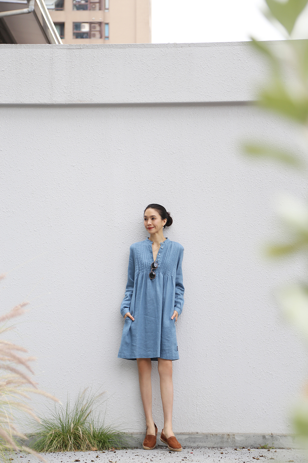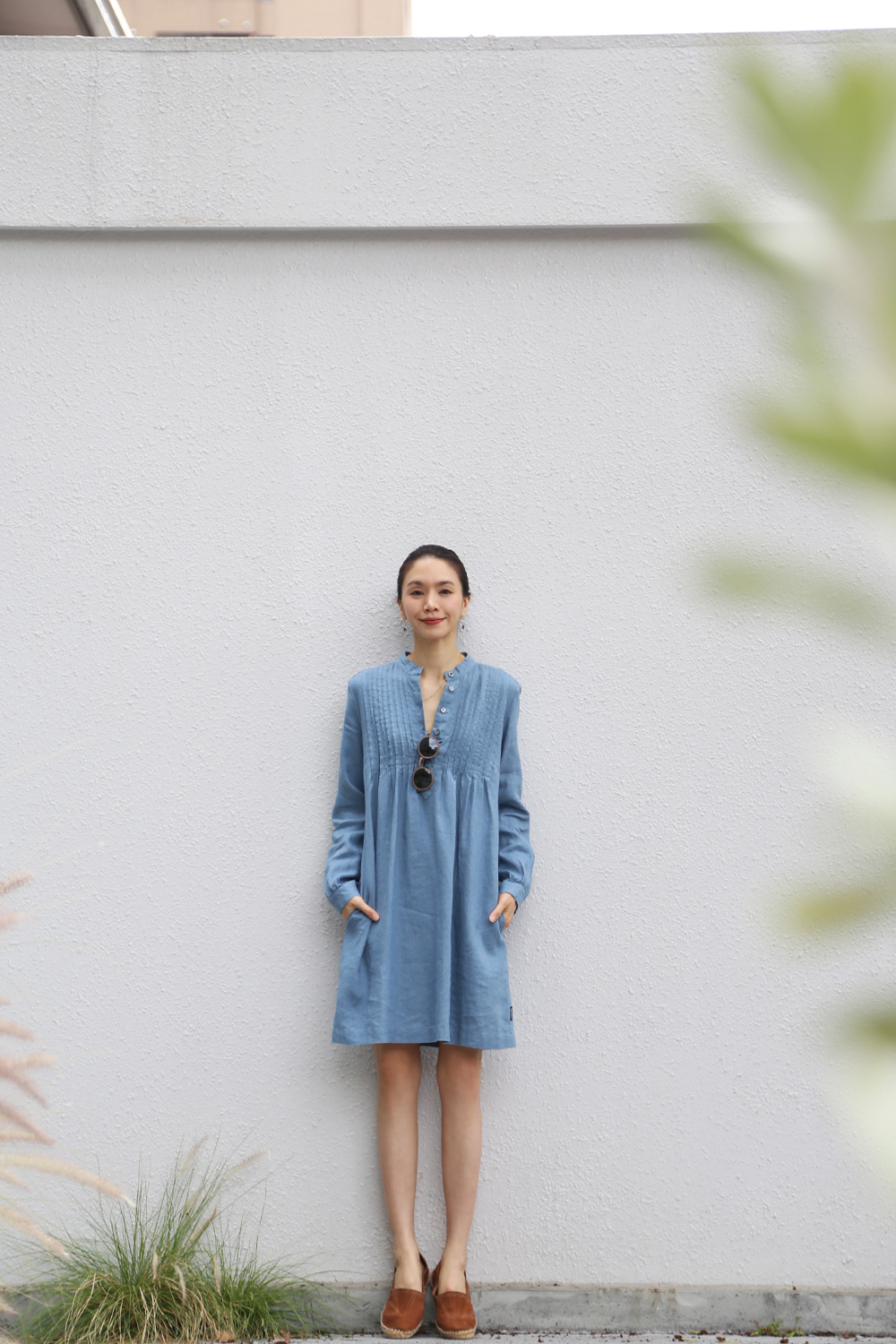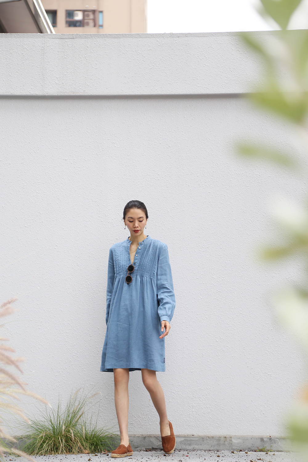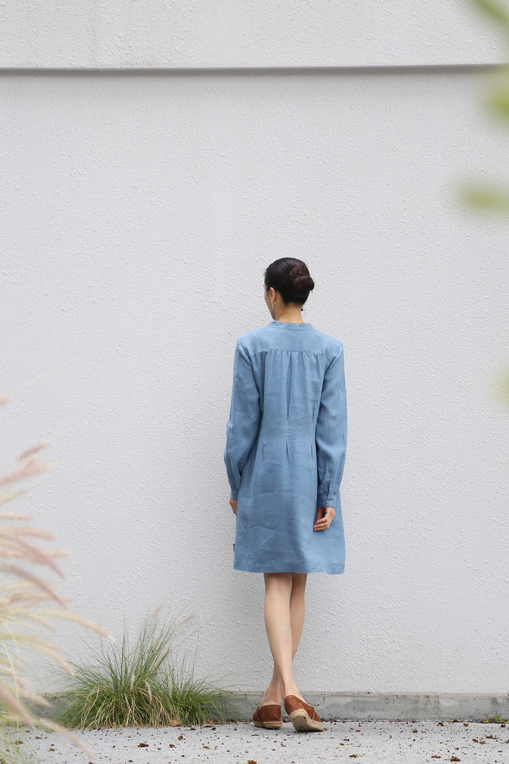 採用純亞麻布料剪裁而成,後背飾有柔和的褶飾,凸顯修身曲線