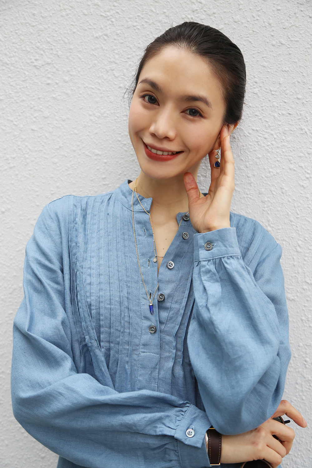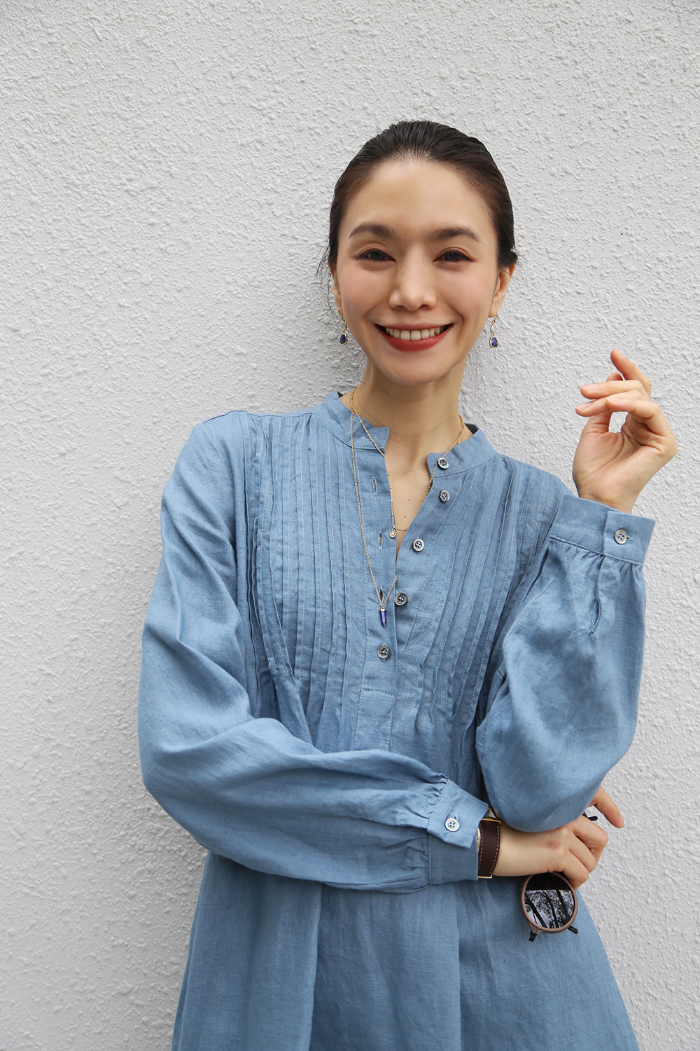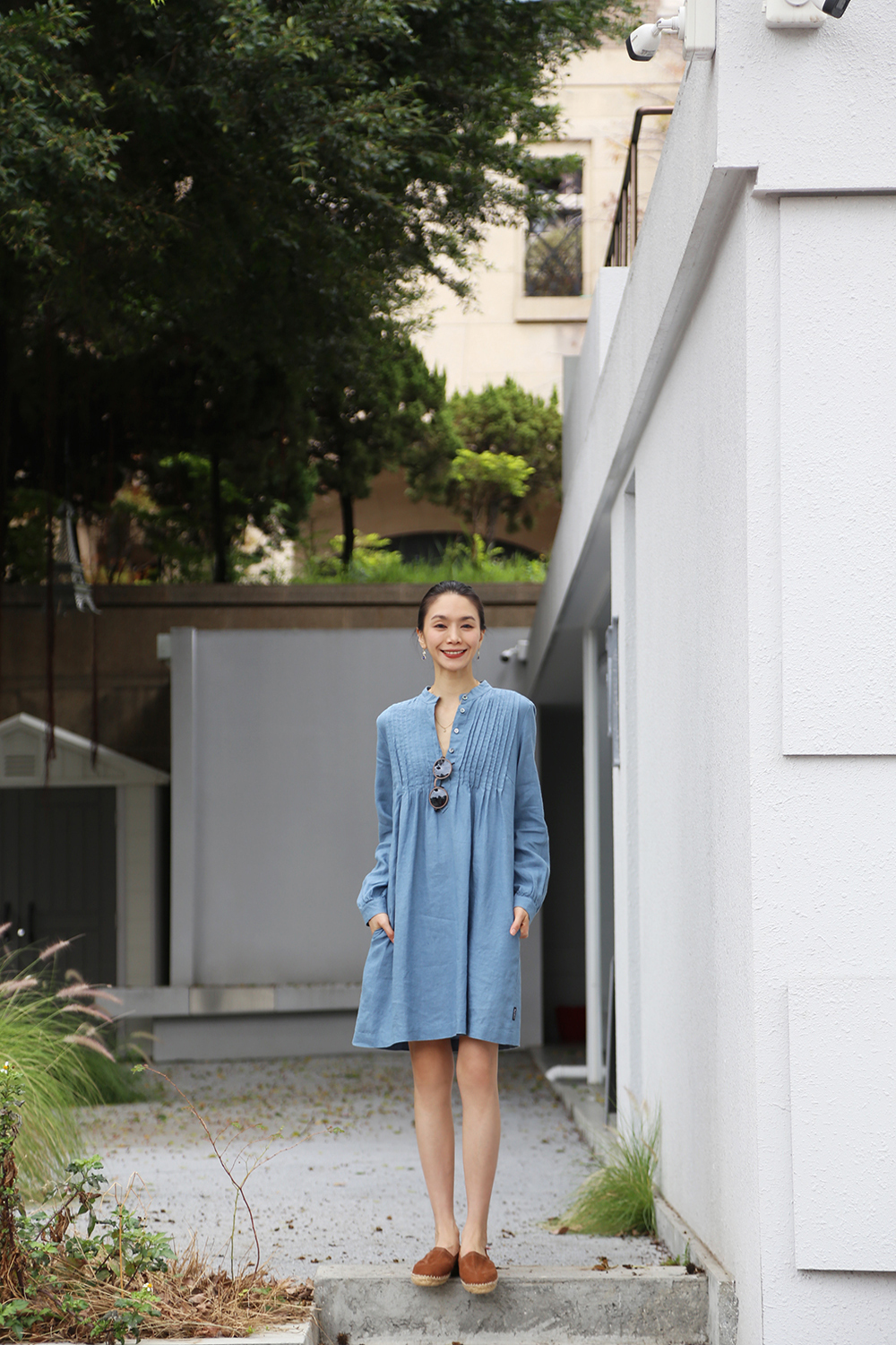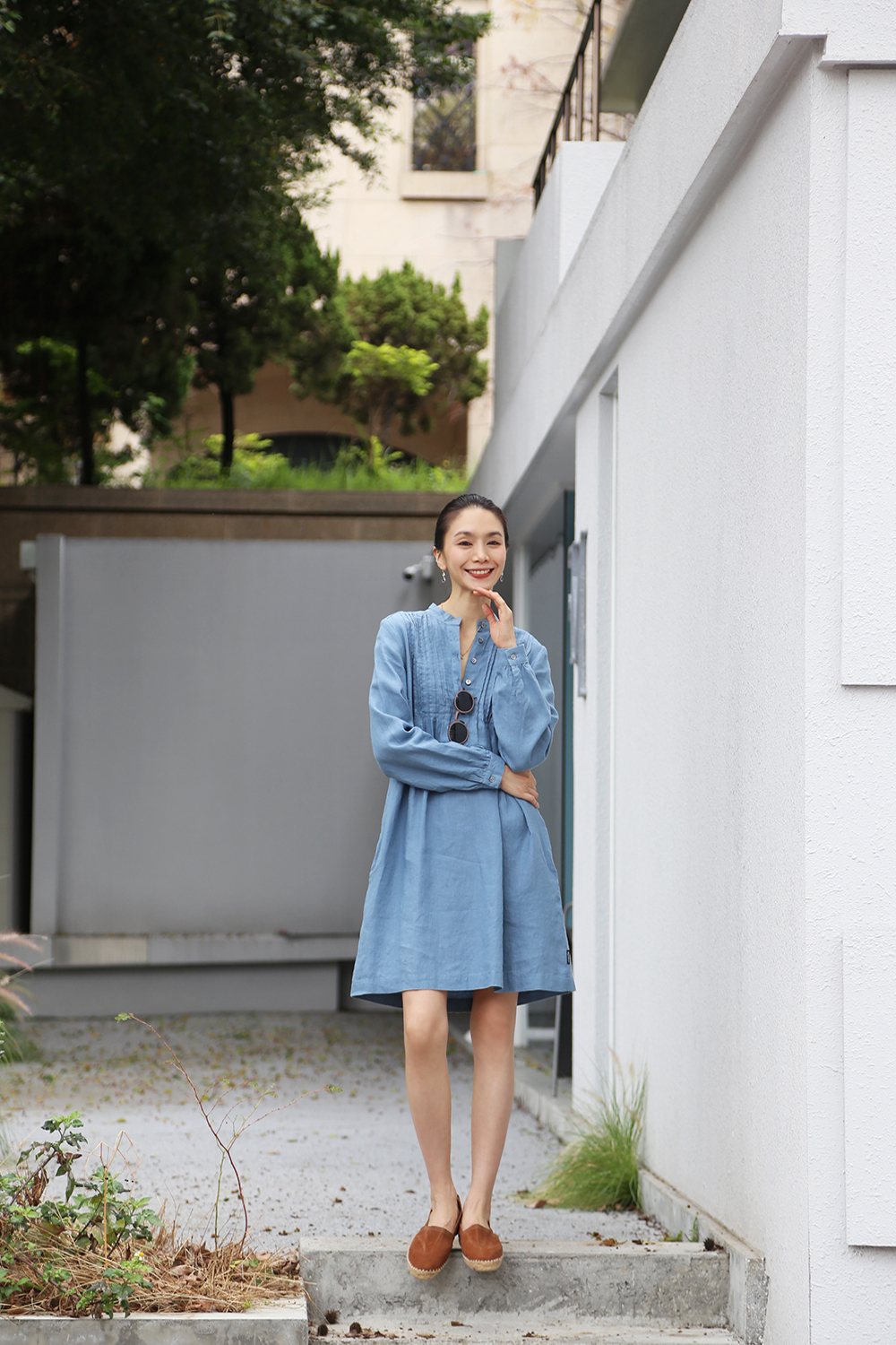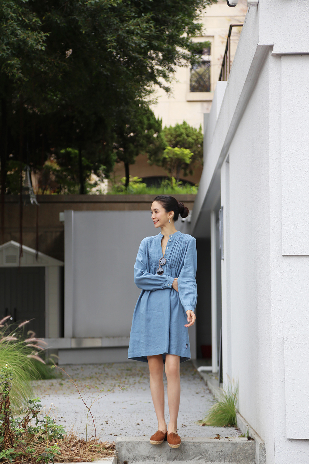 採用純亞麻布料剪裁而成,後背飾有柔和的褶飾,凸顯修身曲線