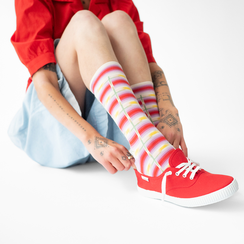 在義大利製布紡紗,全程在法國設計以及法國和葡萄牙生產的每一雙襪子。