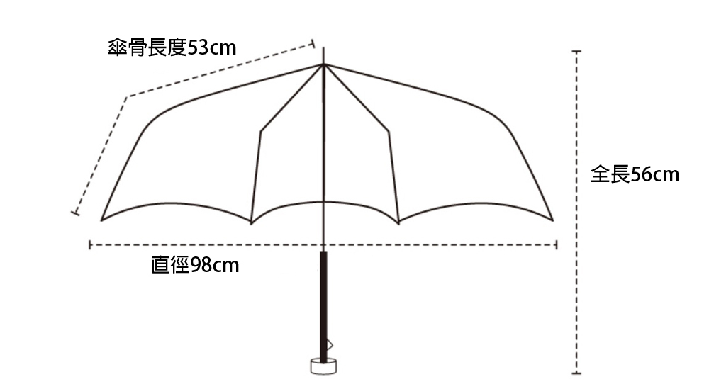 展開尺寸:傘骨長度53cm、直徑98cm、全長56cm