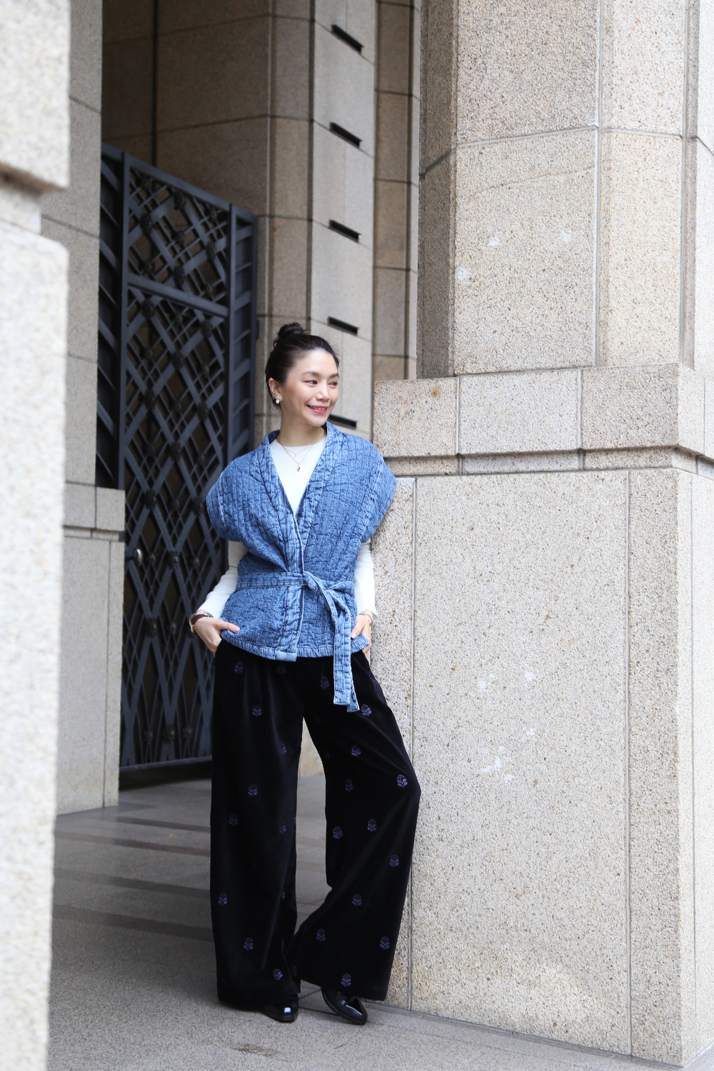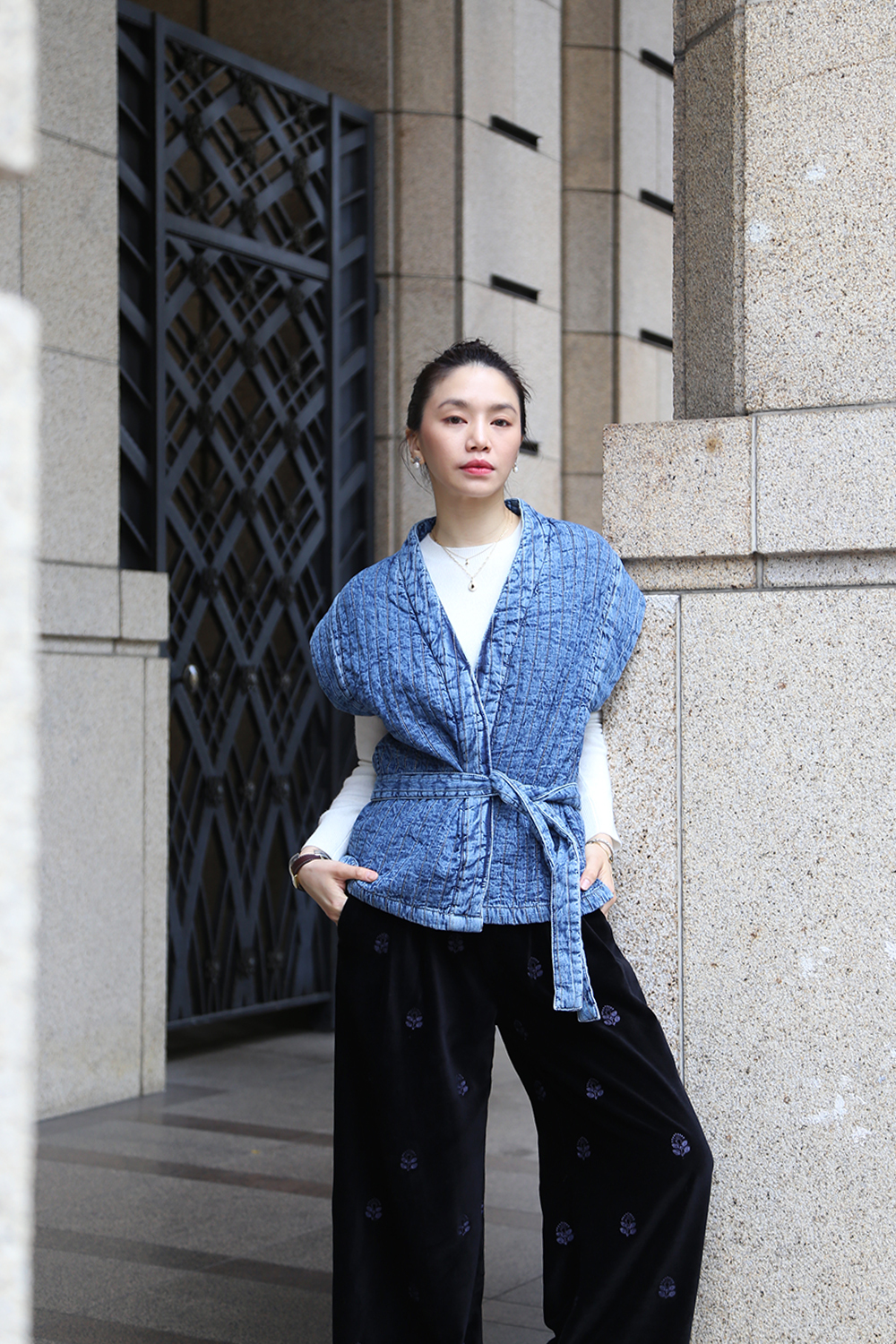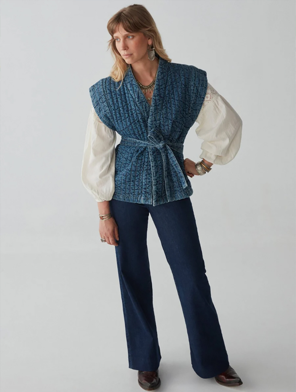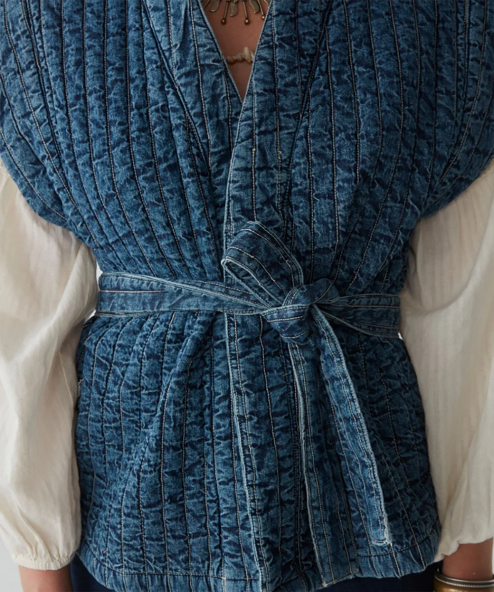 採用仿舊水洗棉質絎縫牛仔布搭配對比色象牙色線和配套腰帶
