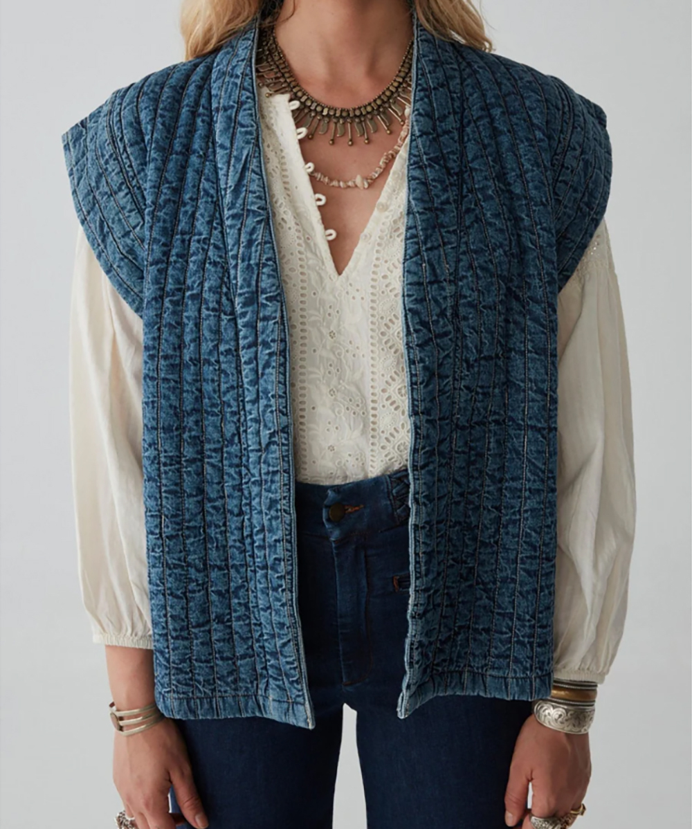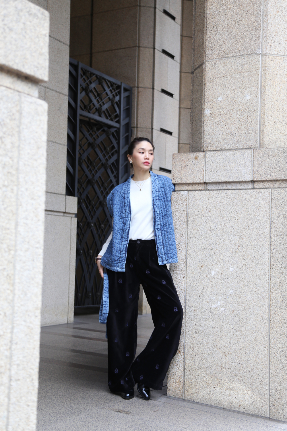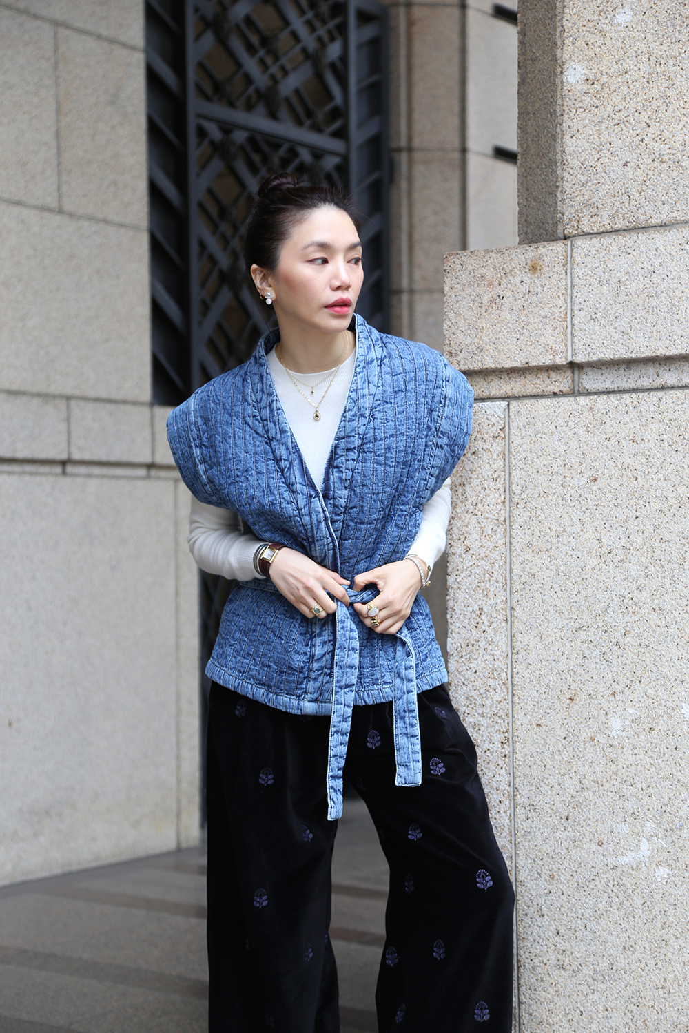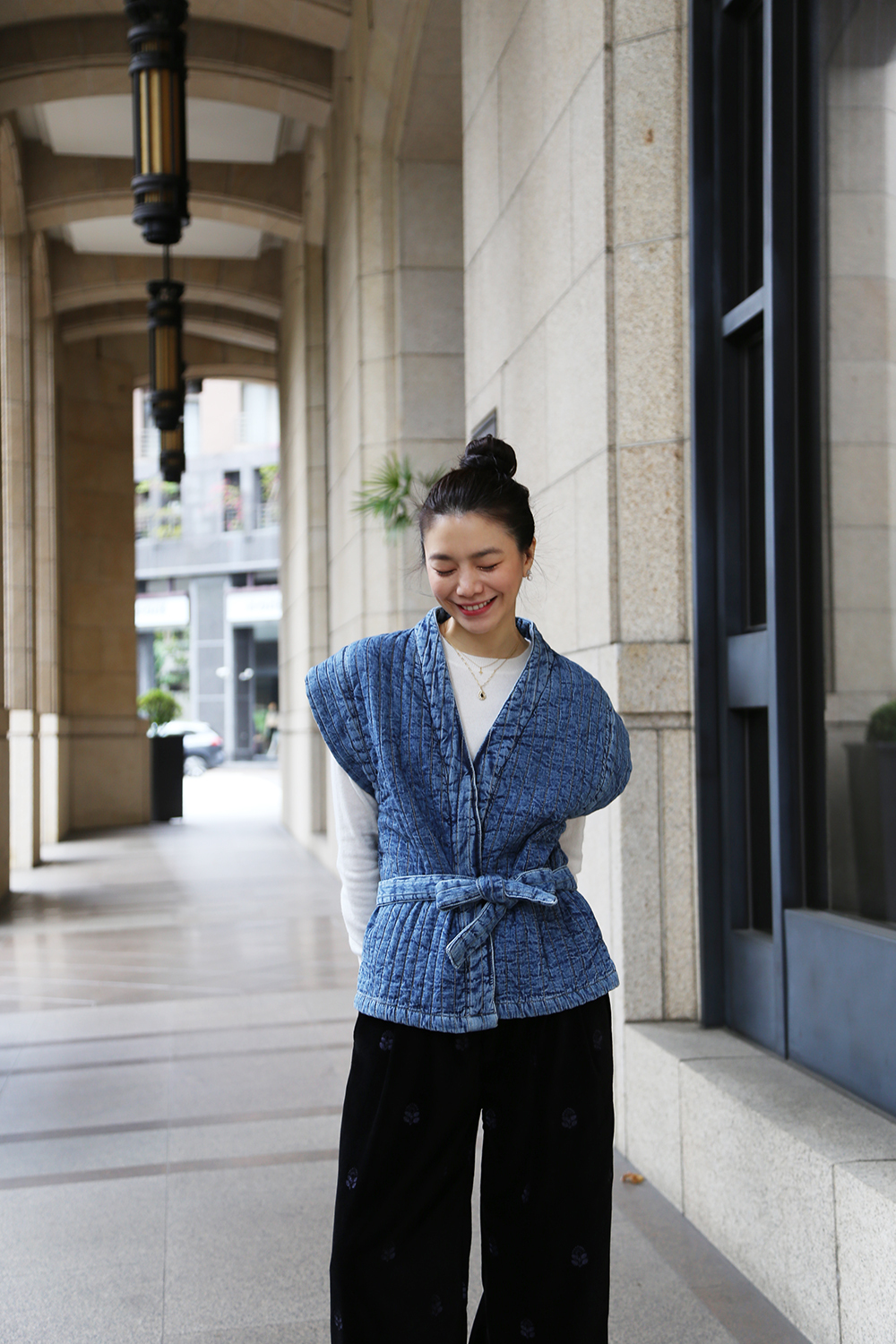 採用仿舊水洗棉質絎縫牛仔布搭配對比色象牙色線和配套腰帶