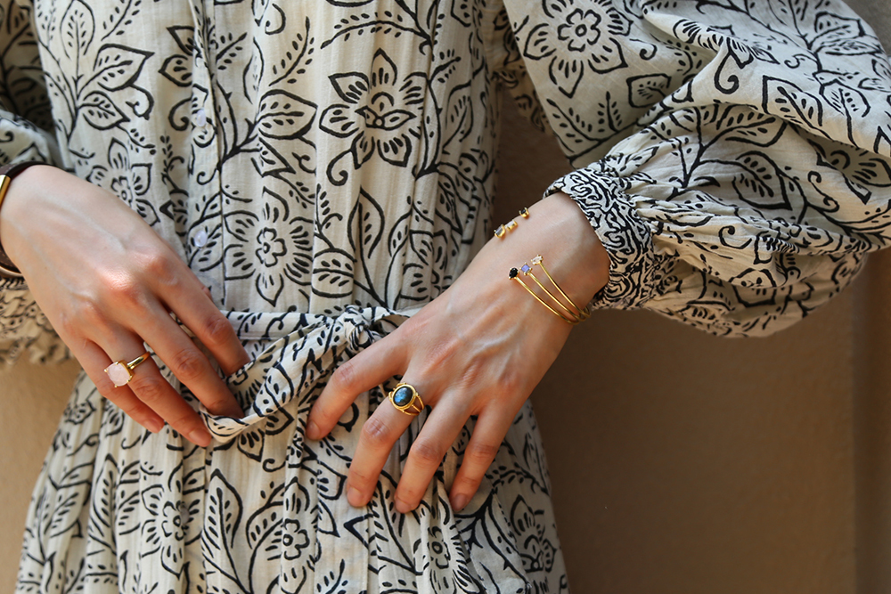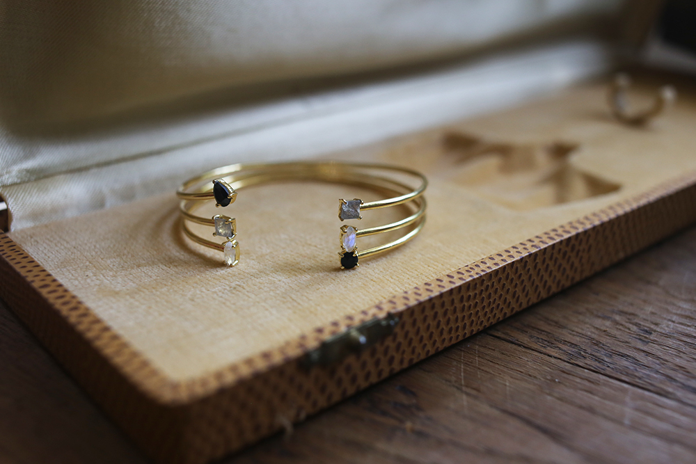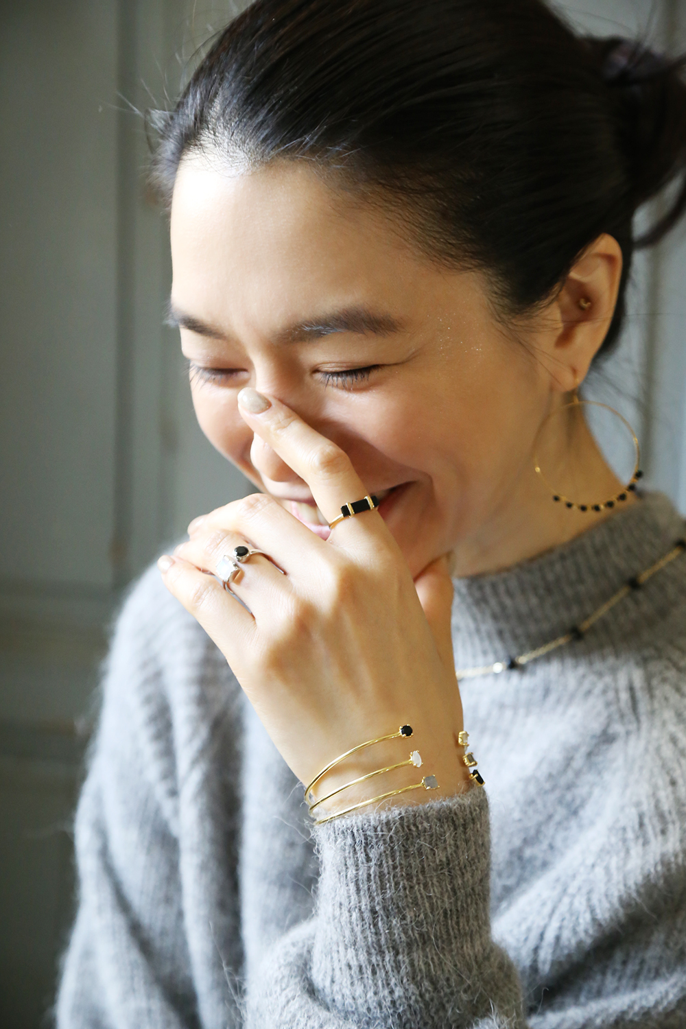 以優雅,感性和細緻,結合古典與現代,以黃銅,天然月光石、青金石、珍珠母貝、翡翠、碧璽、石英、黃玉、瑪瑙、葡萄石、東陵石等寶石的結合