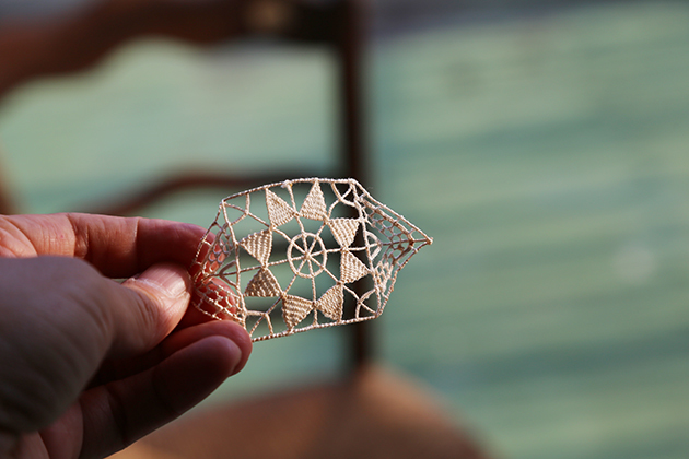 運用數十個木製線軸,反覆交錯編織,織出擁有精美花樣蕾絲枕巾或貼身襯褲,並做為傳承給未來女兒的傳家嫁妝