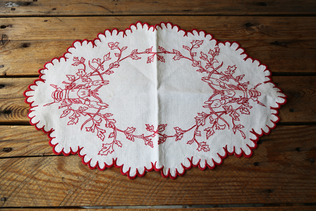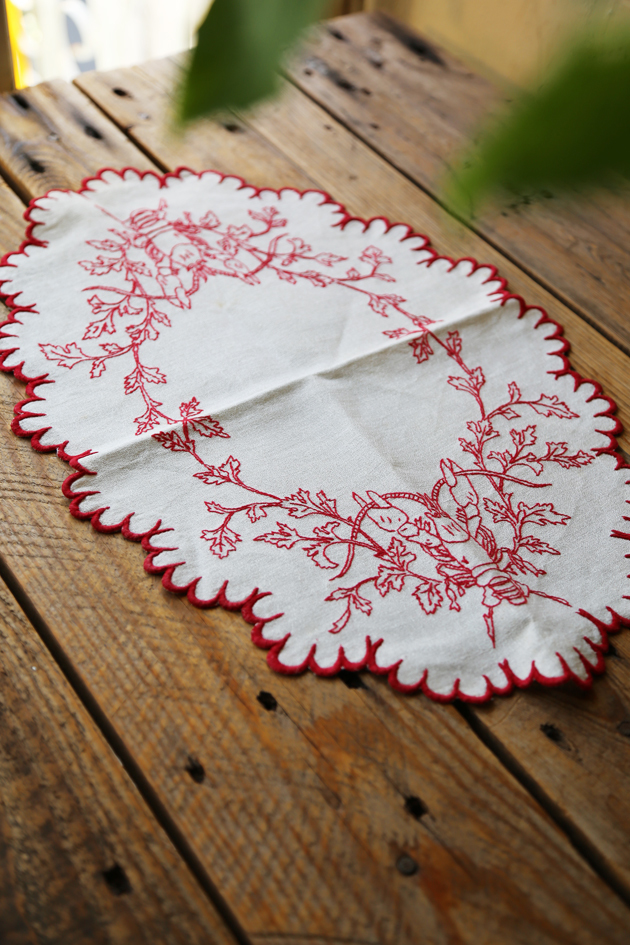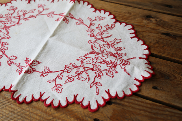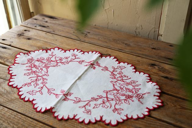 暗紅色的繡線 在亞麻布上格外鮮明