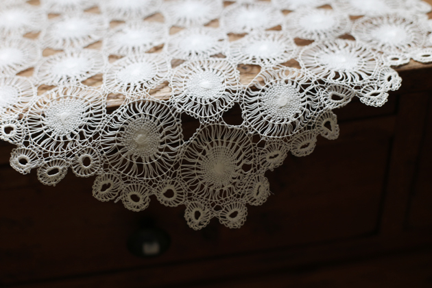 運用數十個木製線軸,反覆交錯編織,織出擁有精美花樣蕾絲枕巾或貼身襯褲,並做為傳承給未來女兒的傳家嫁妝